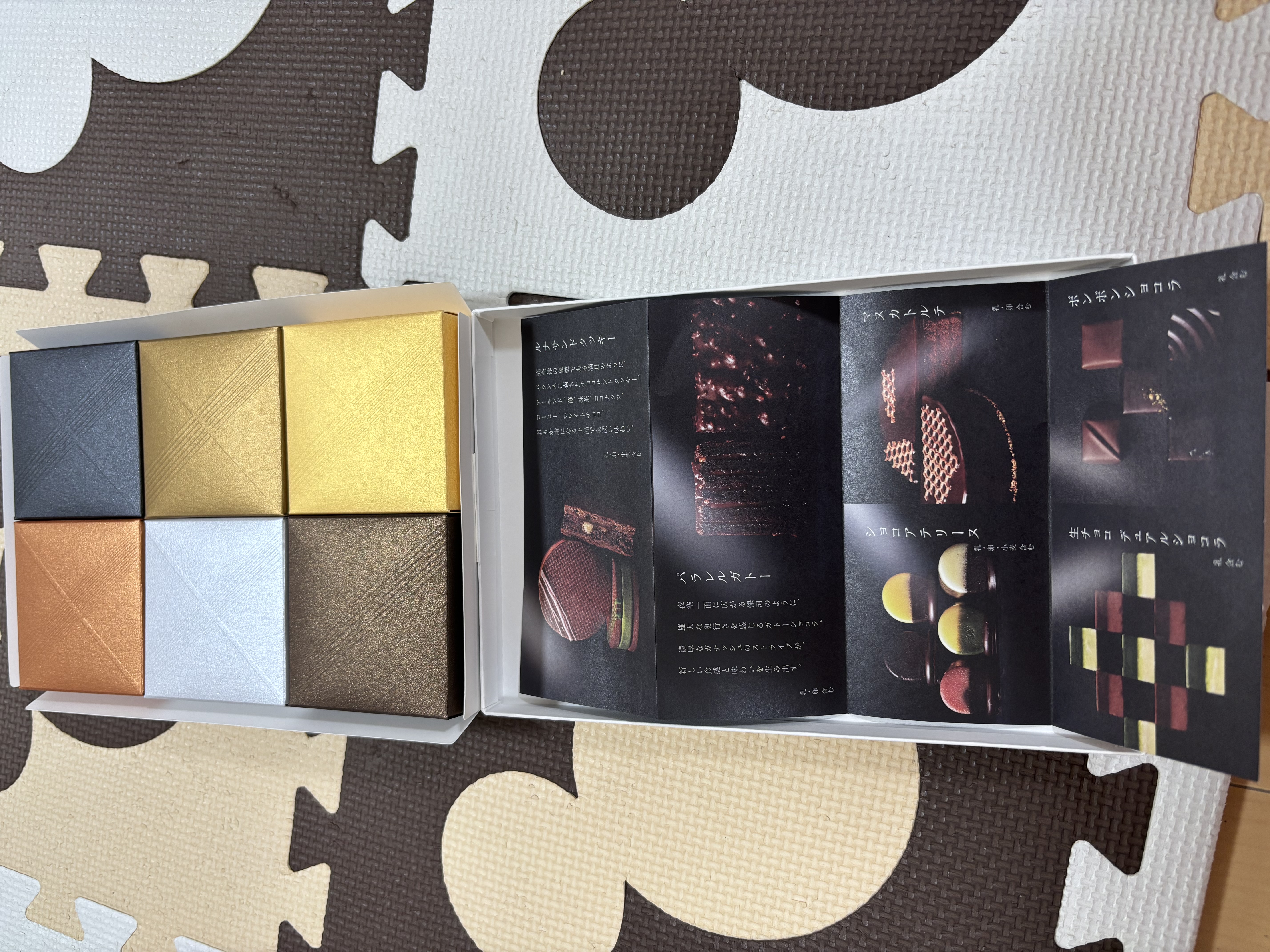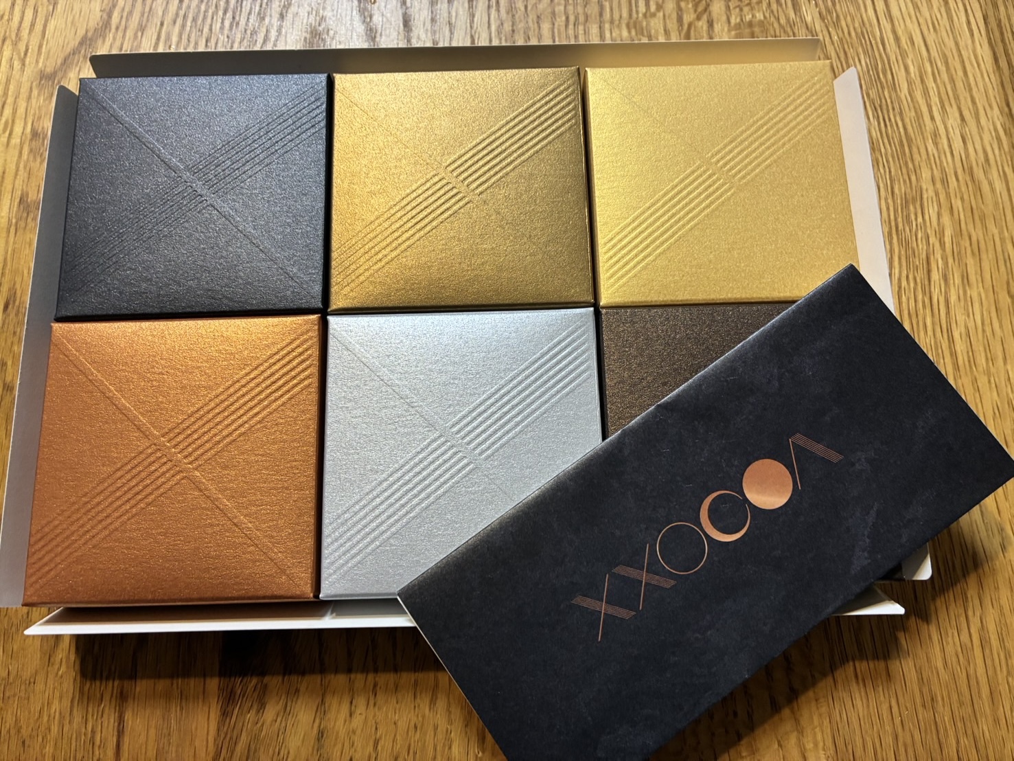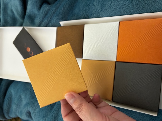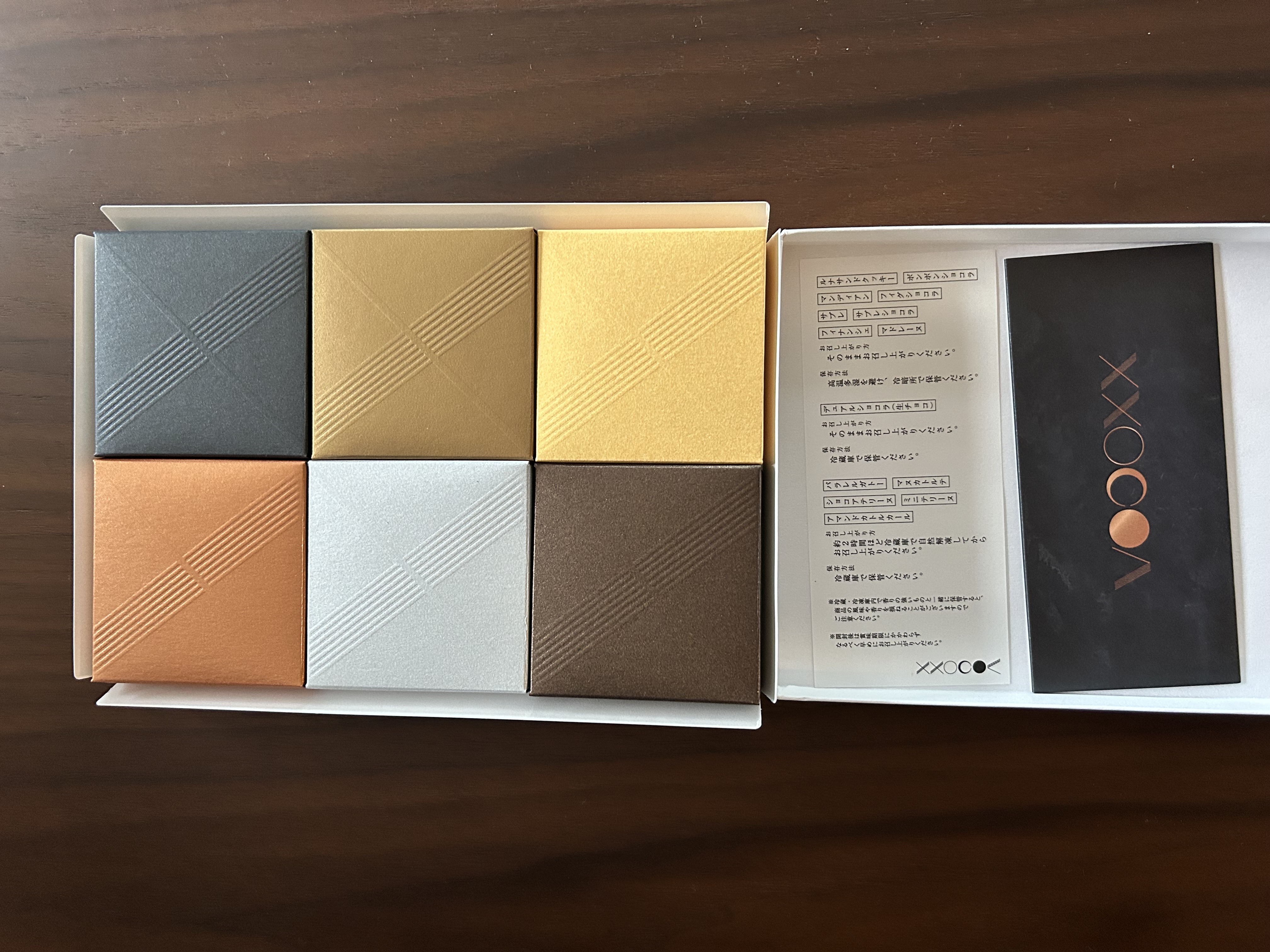 高級感のある包装紙を開けると上品なカラーリングの小箱が6つ並んで入っており、特別な贈り物という印象でテンションが上がります。