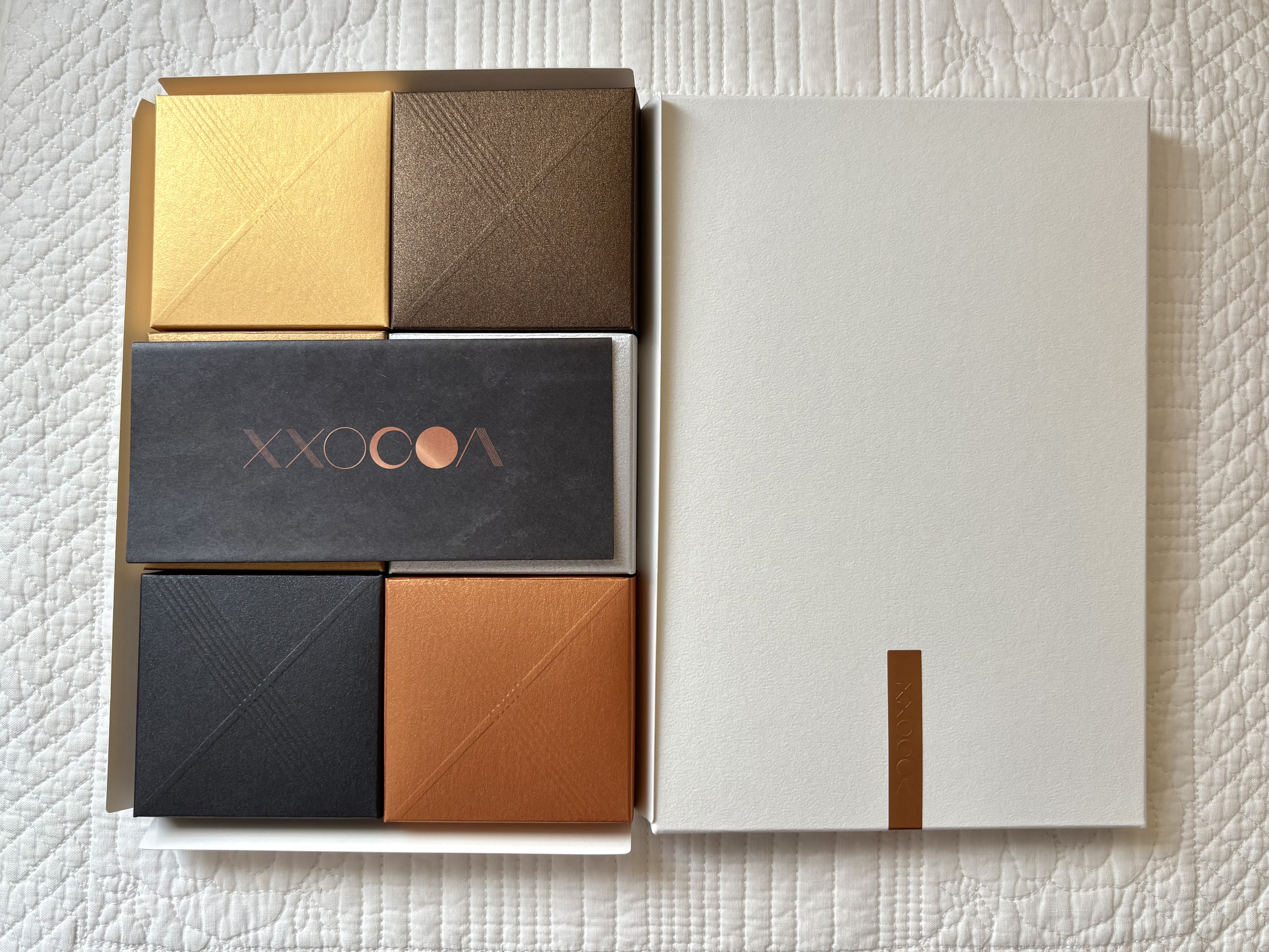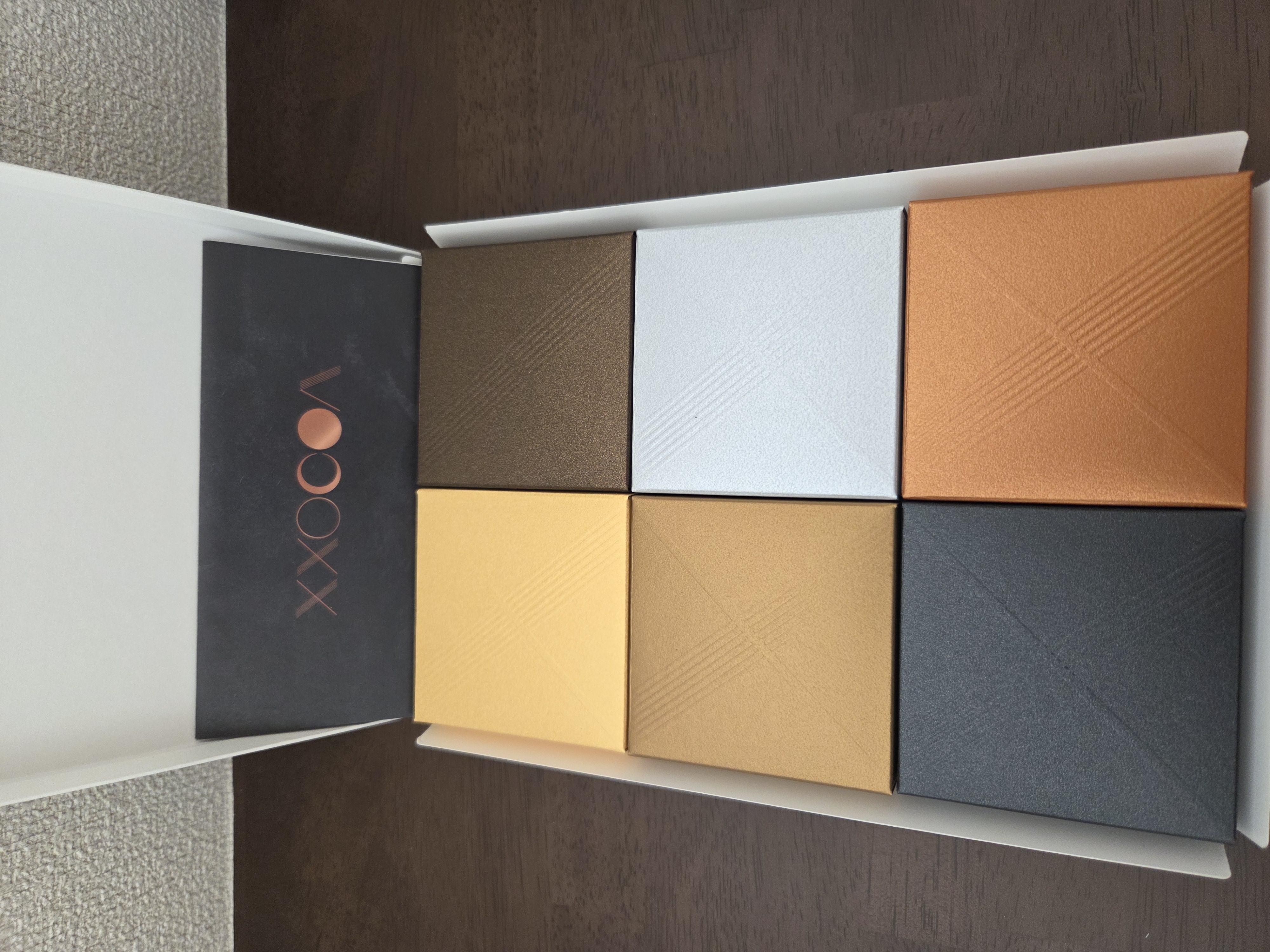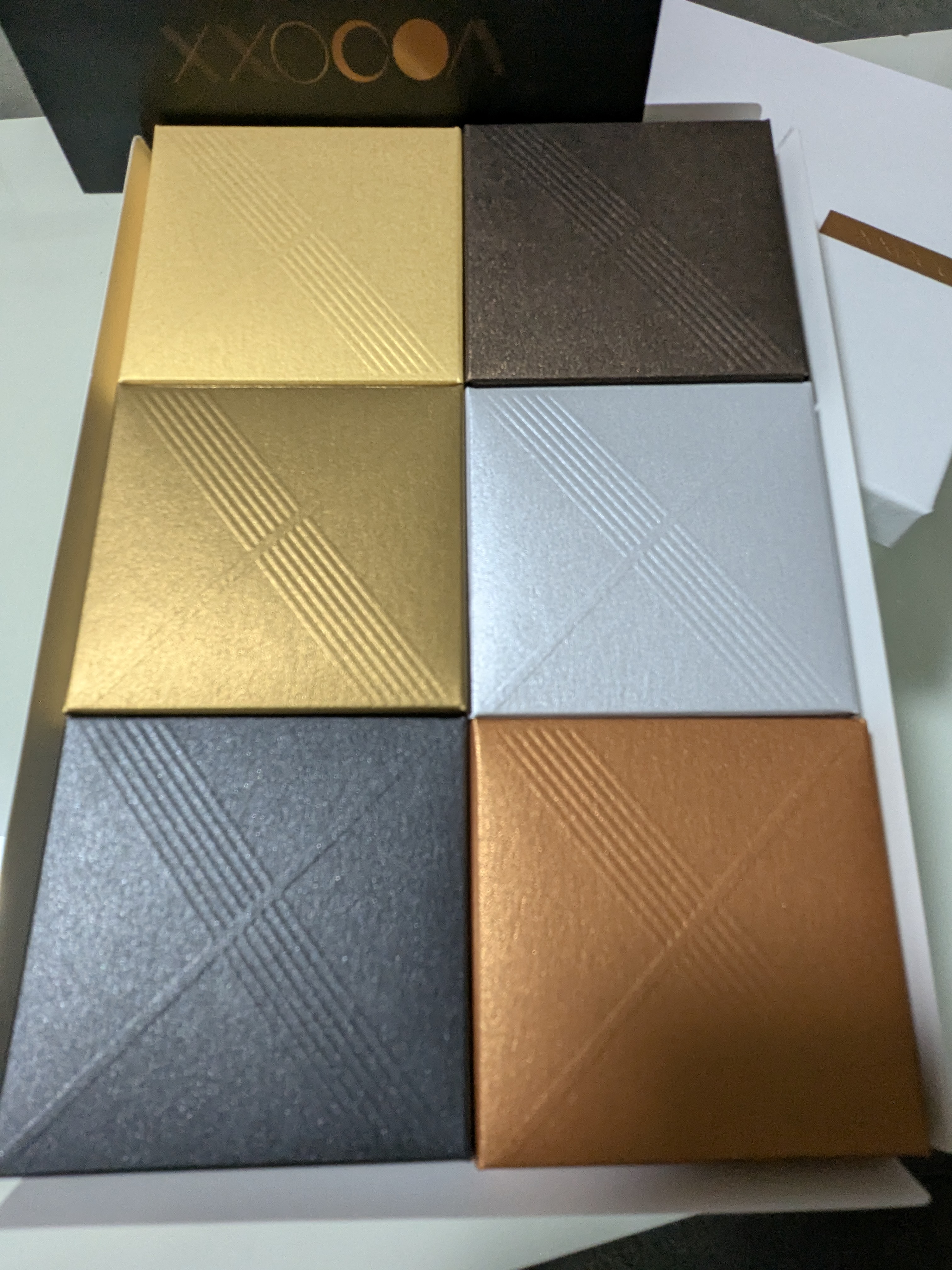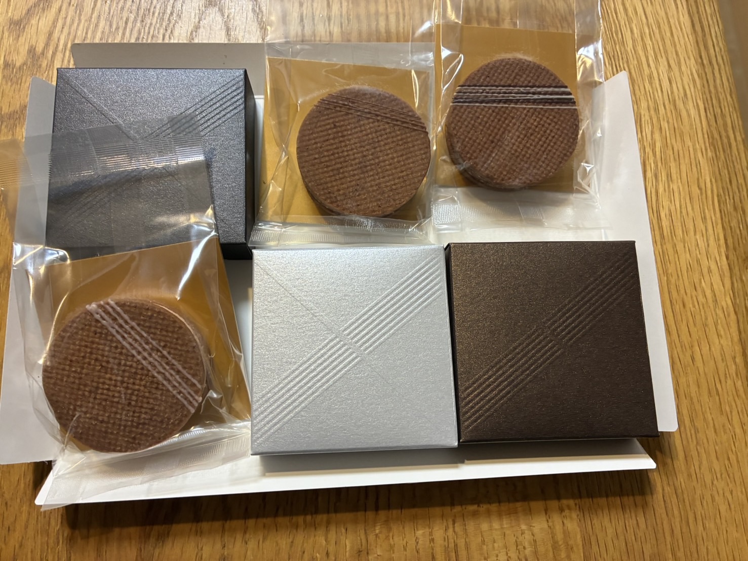 高級感のある包装紙を開けると上品なカラーリングの小箱が6つ並んで入っており、特別な贈り物という印象でテンションが上がります。