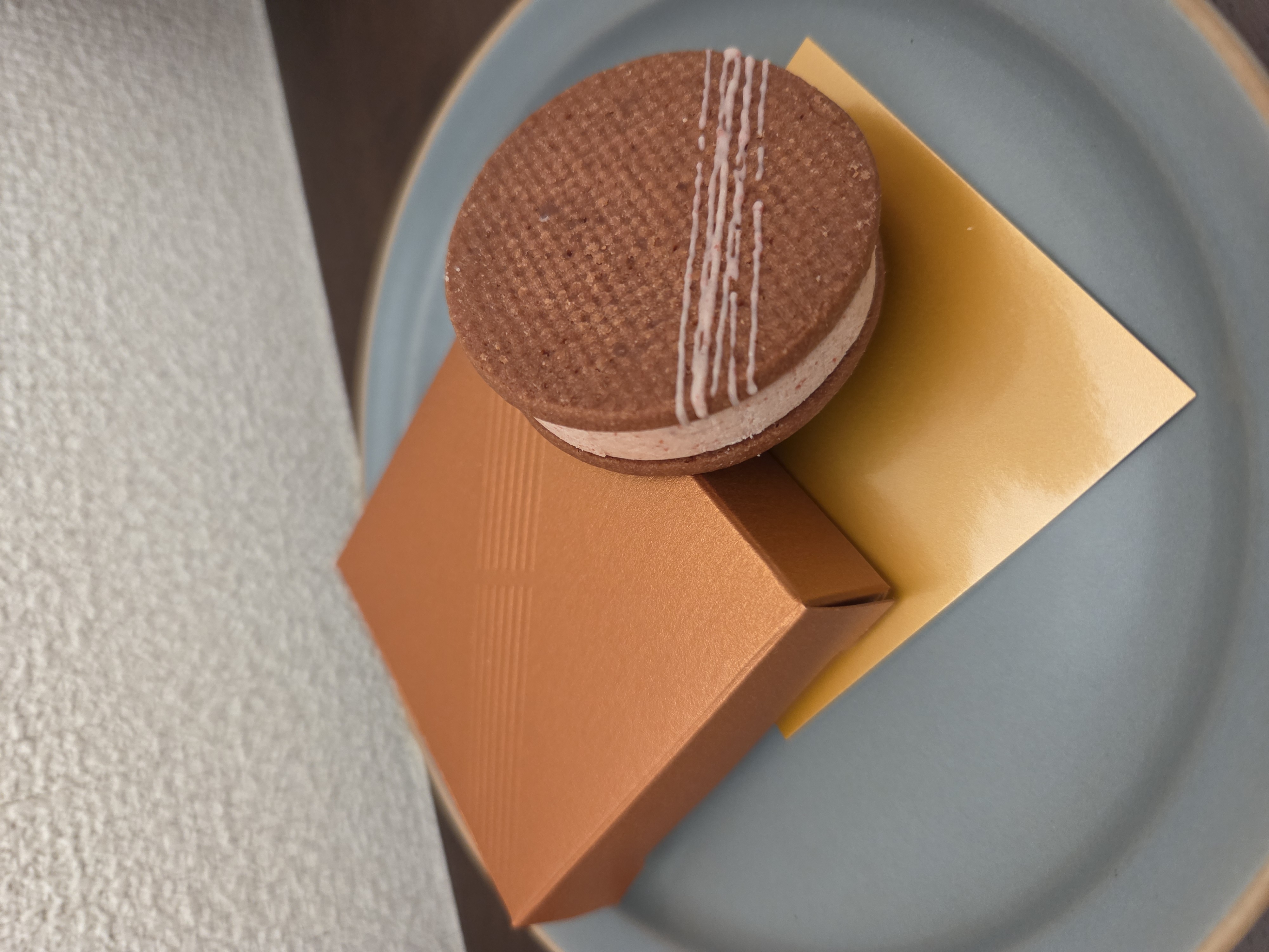 パッケージを開けると、金色の正方形の台紙がルナサンドクッキーに敷いてあります。ちょっと過保護すぎやしないか…と思いましたが、美しいラインの入ったクッキーのビジュアルに過保護にもしたくなるよね、と妙に納得感があります。