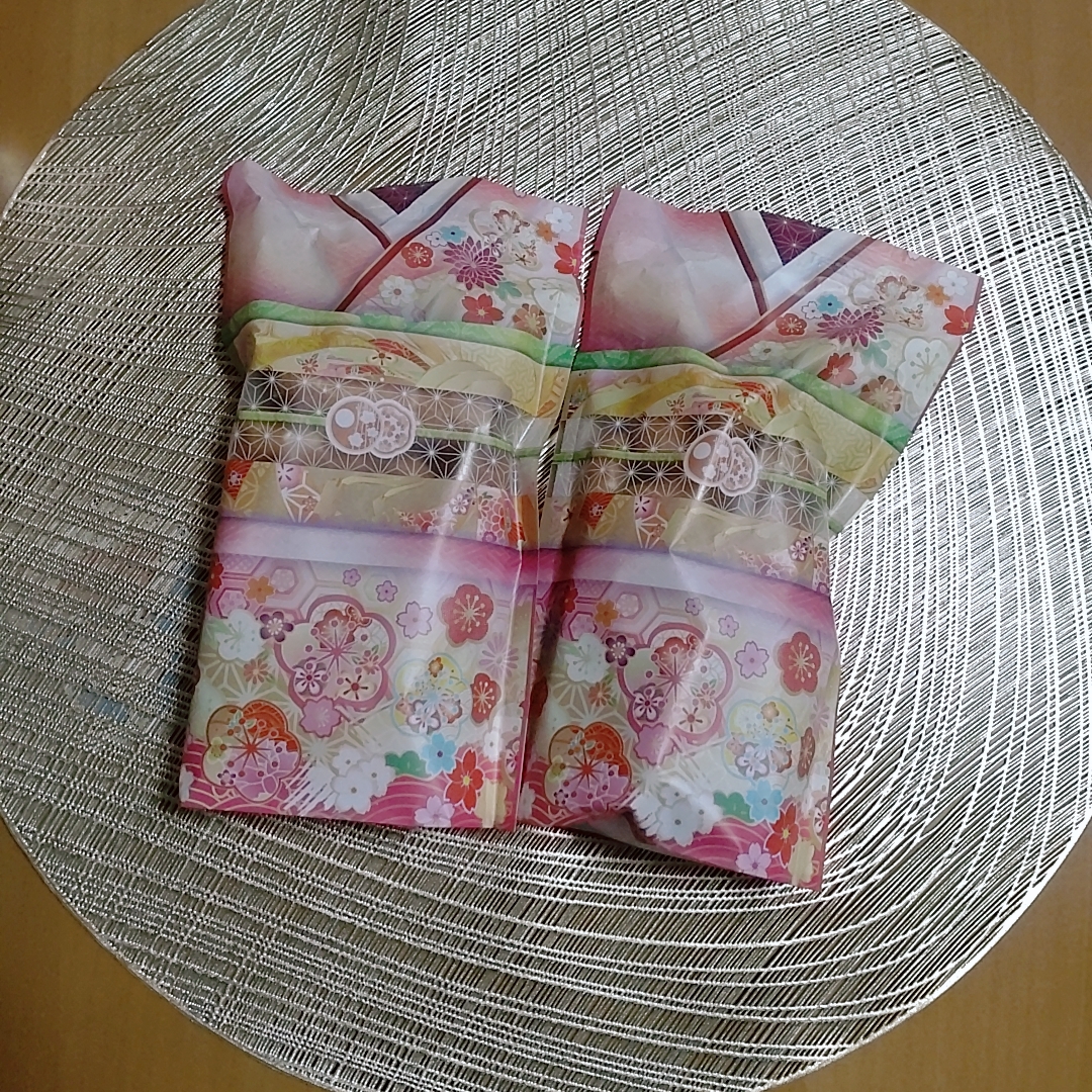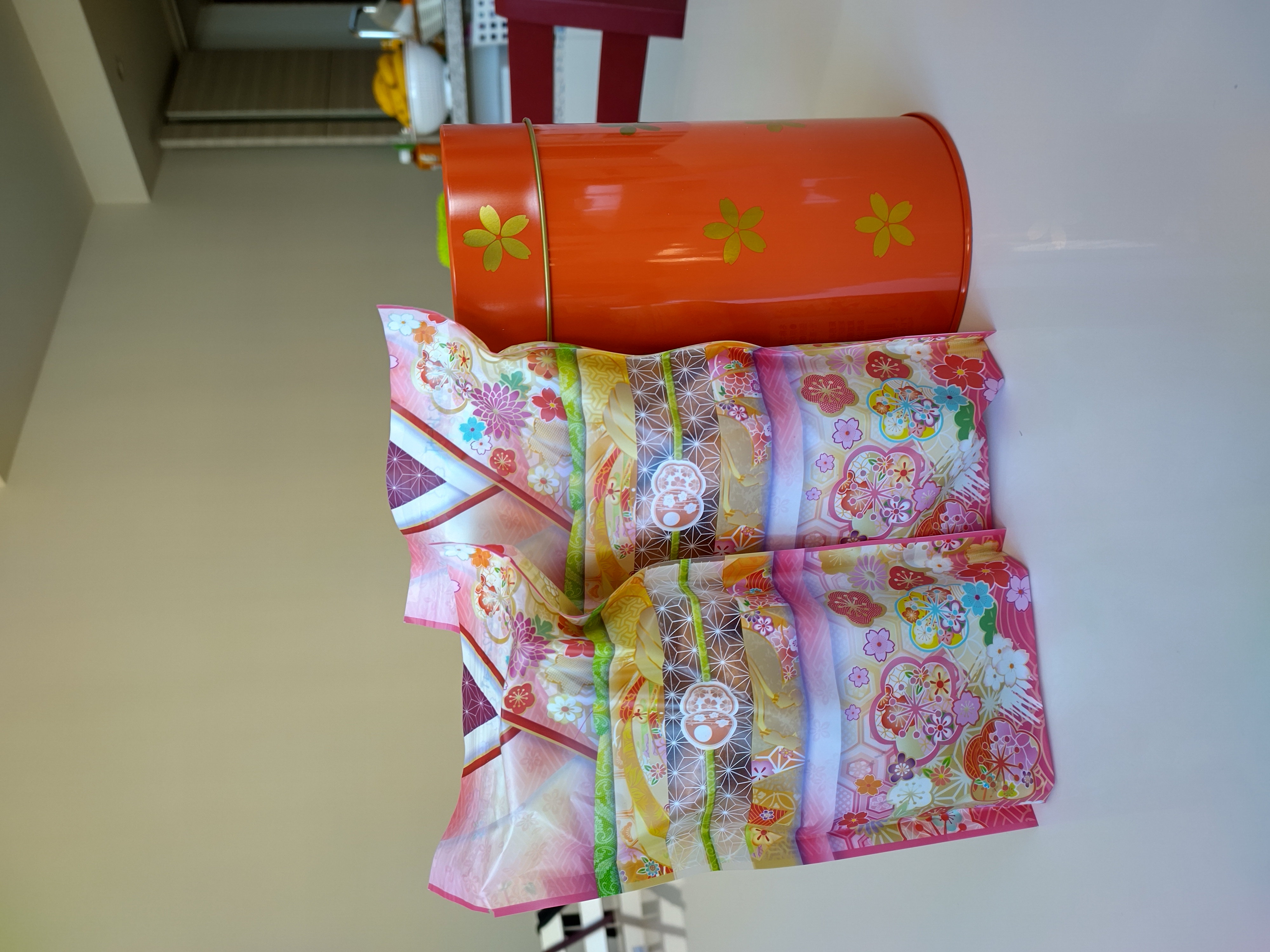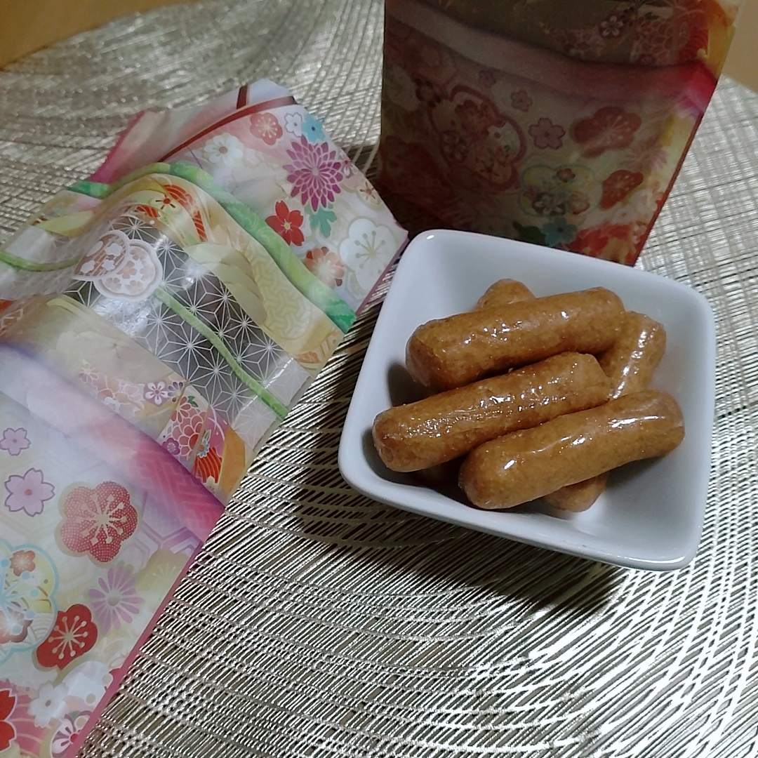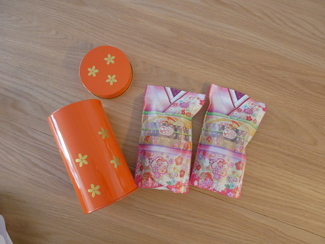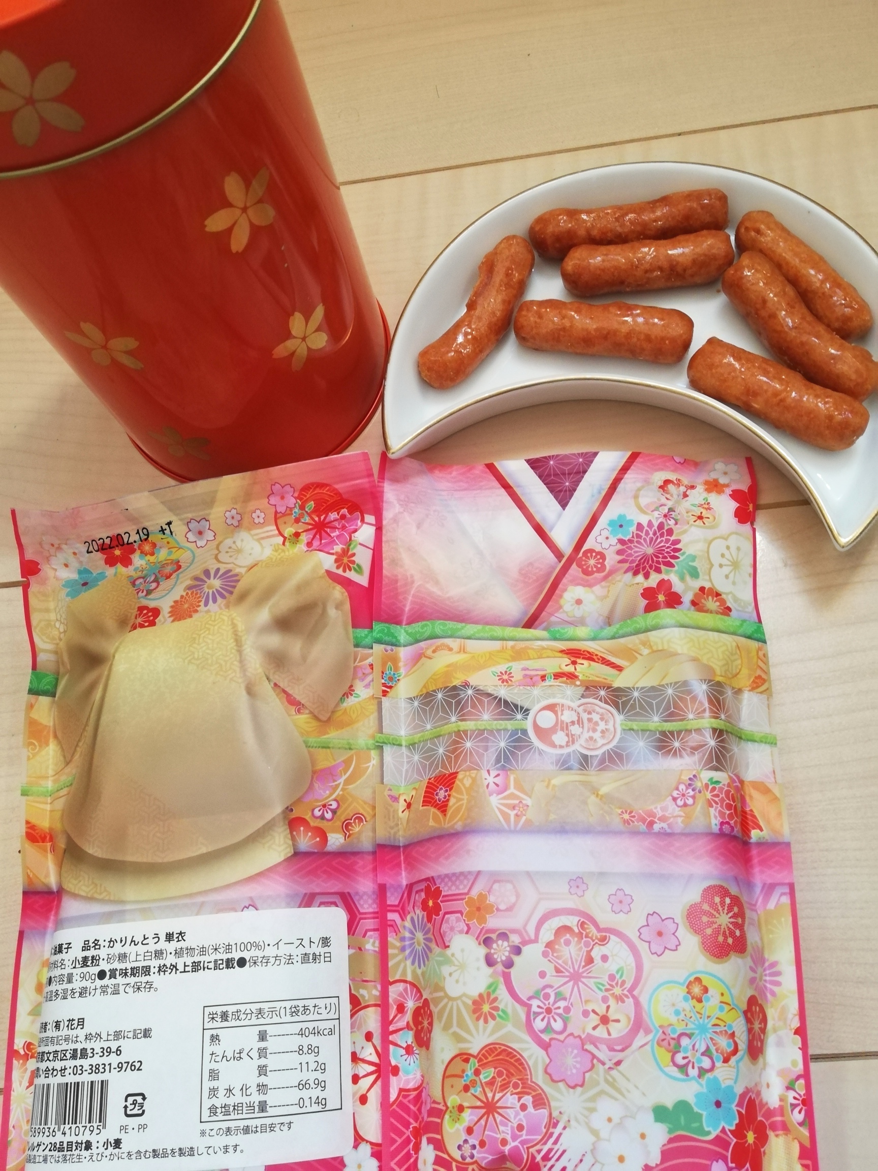 かりんとう90gの小袋が2つ、朱色のかわいい缶につめられていました。小袋も着物をイメージした柄になっていて、ビジュアルも素敵でした。