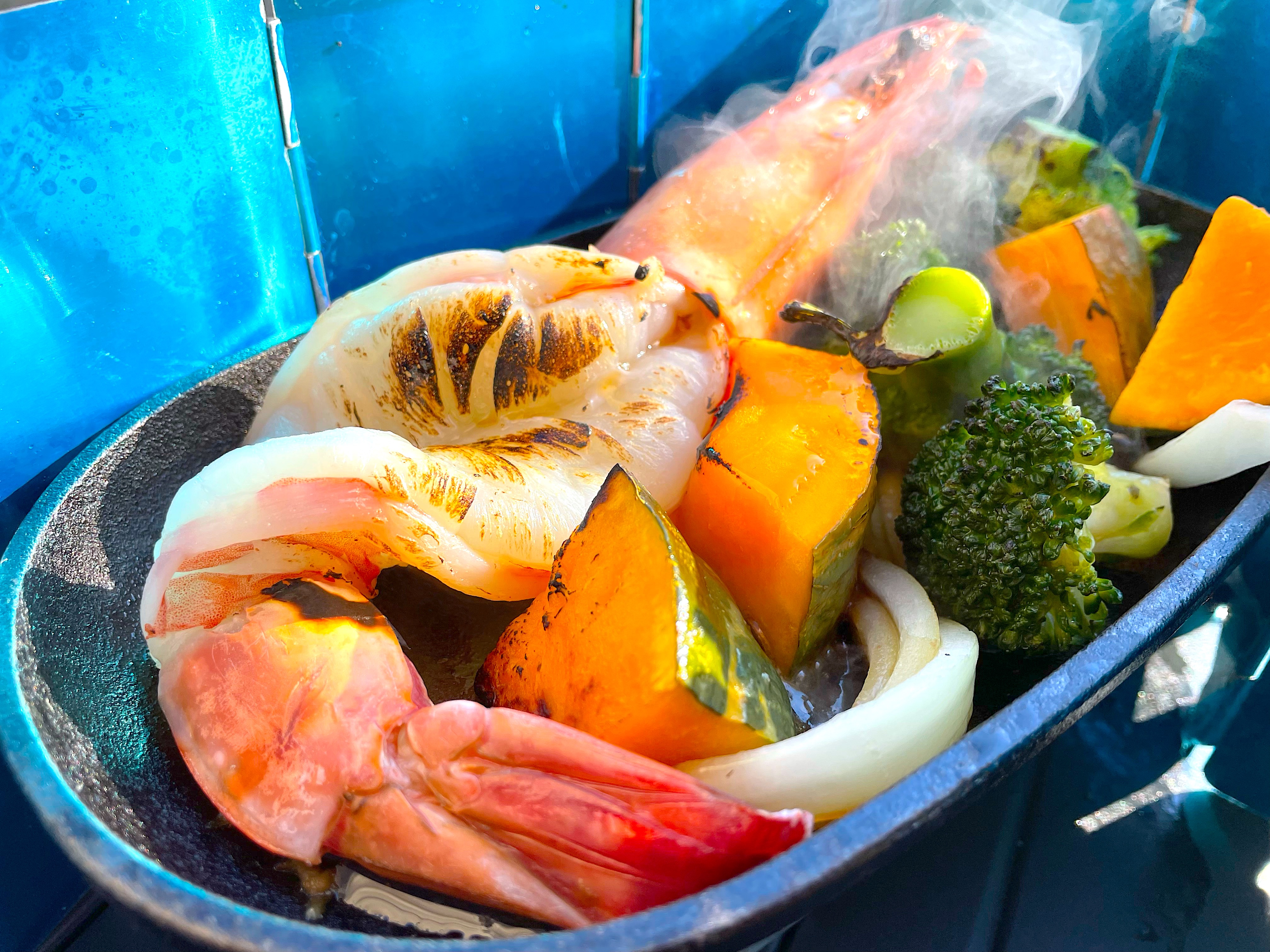 そして、気になっていた「霜降り海老ステーキ」は鉄板で豪快に焼き上げました。大きな鉄板が小さく見えるほどの大きさです。海老に切り込みが入っているため、焼いていると自然に海老の身が開き、とても綺麗な形で焼き上げられました。同封されていた海老オイルをかけていただいたのですが、これまた美味しい。