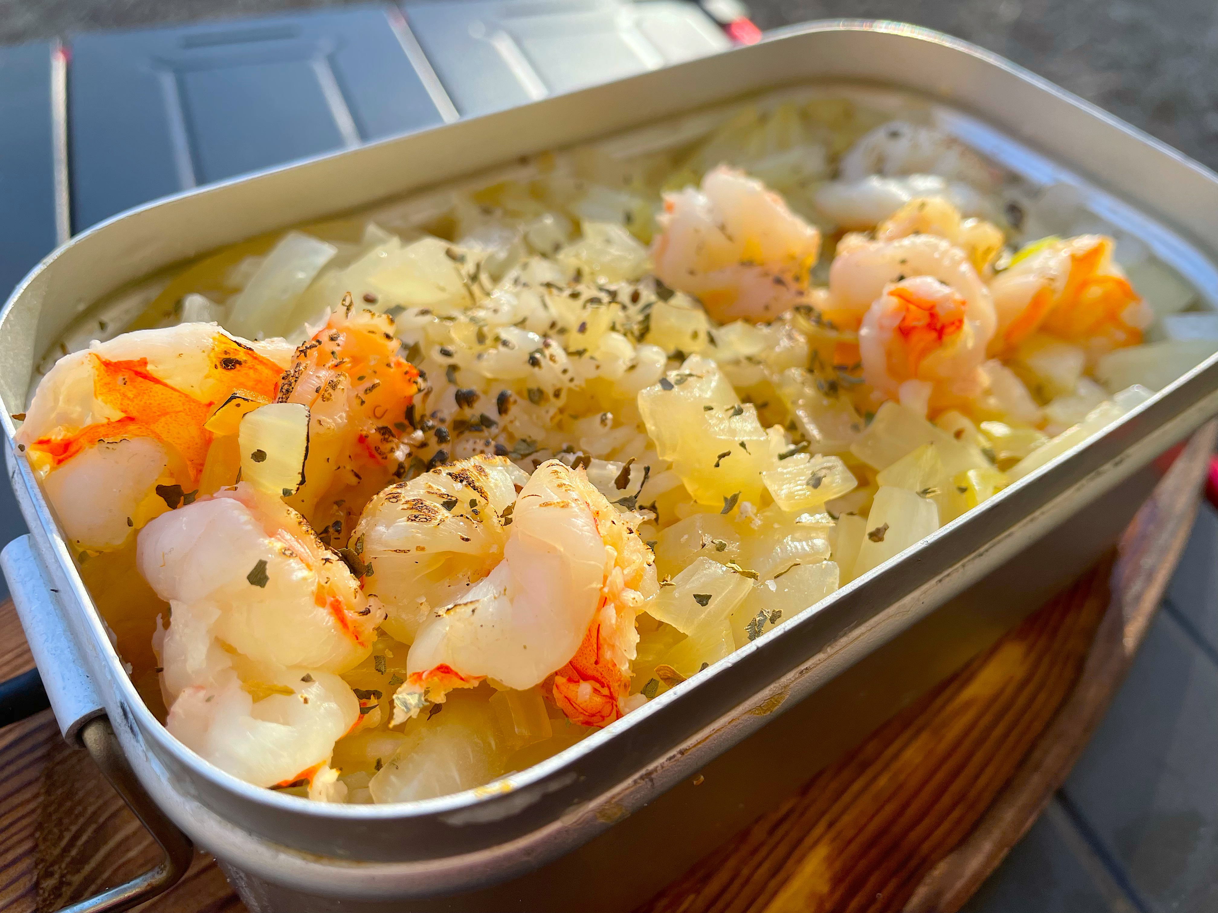 メスティンの蓋を開けた瞬間、ふっくらしたむき海老が現れました。ビジュアルとお味ともに完璧です。