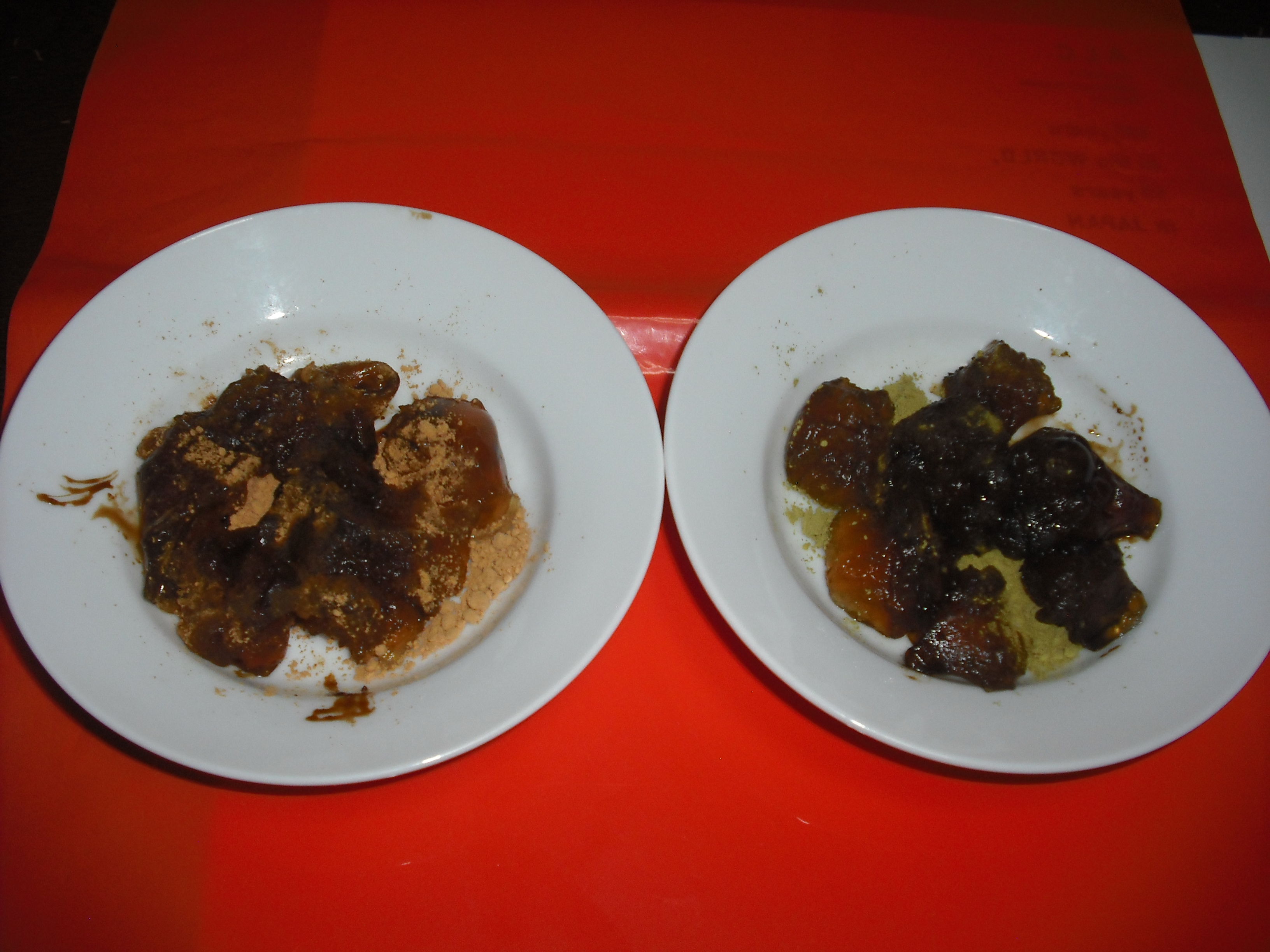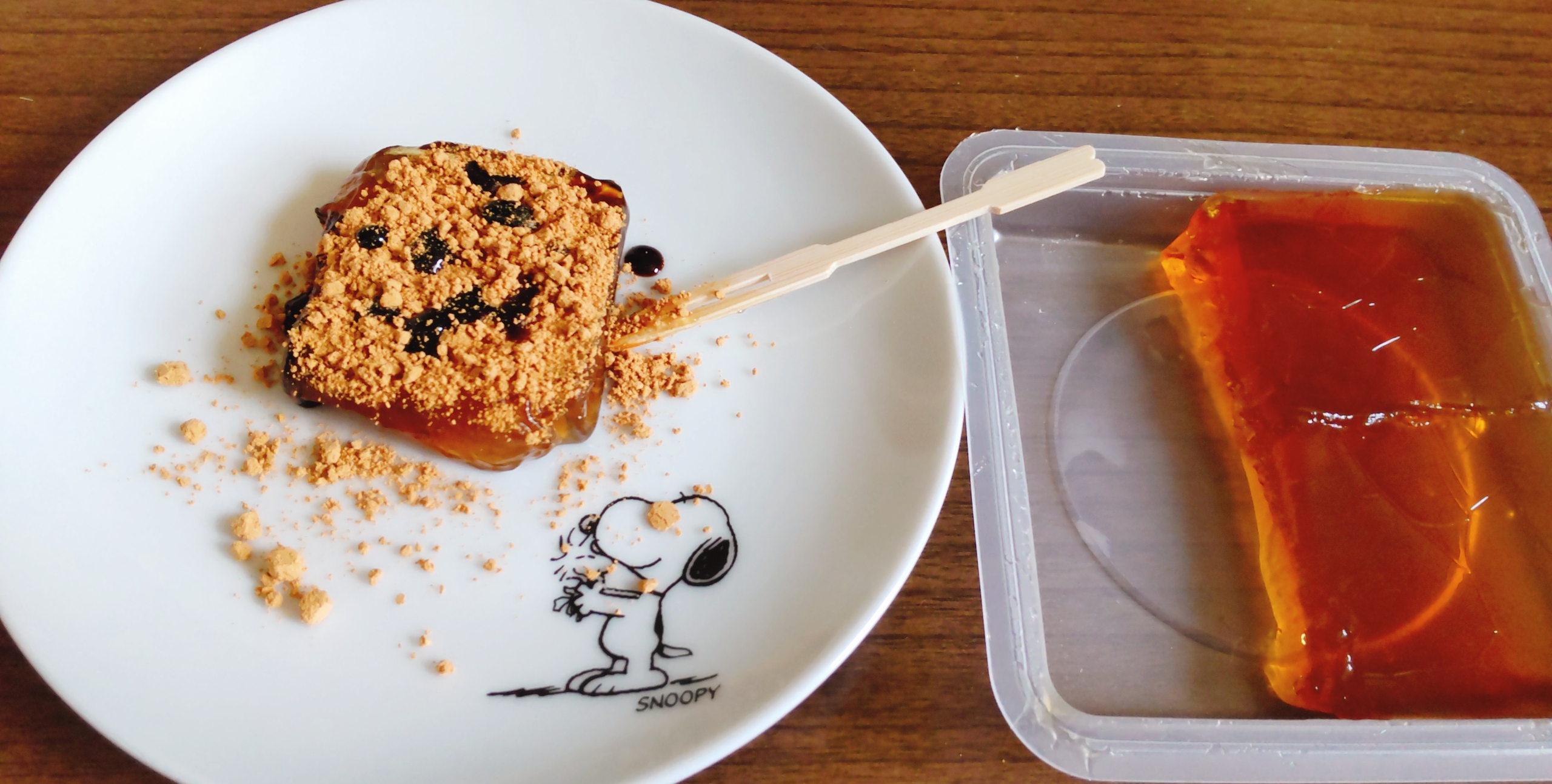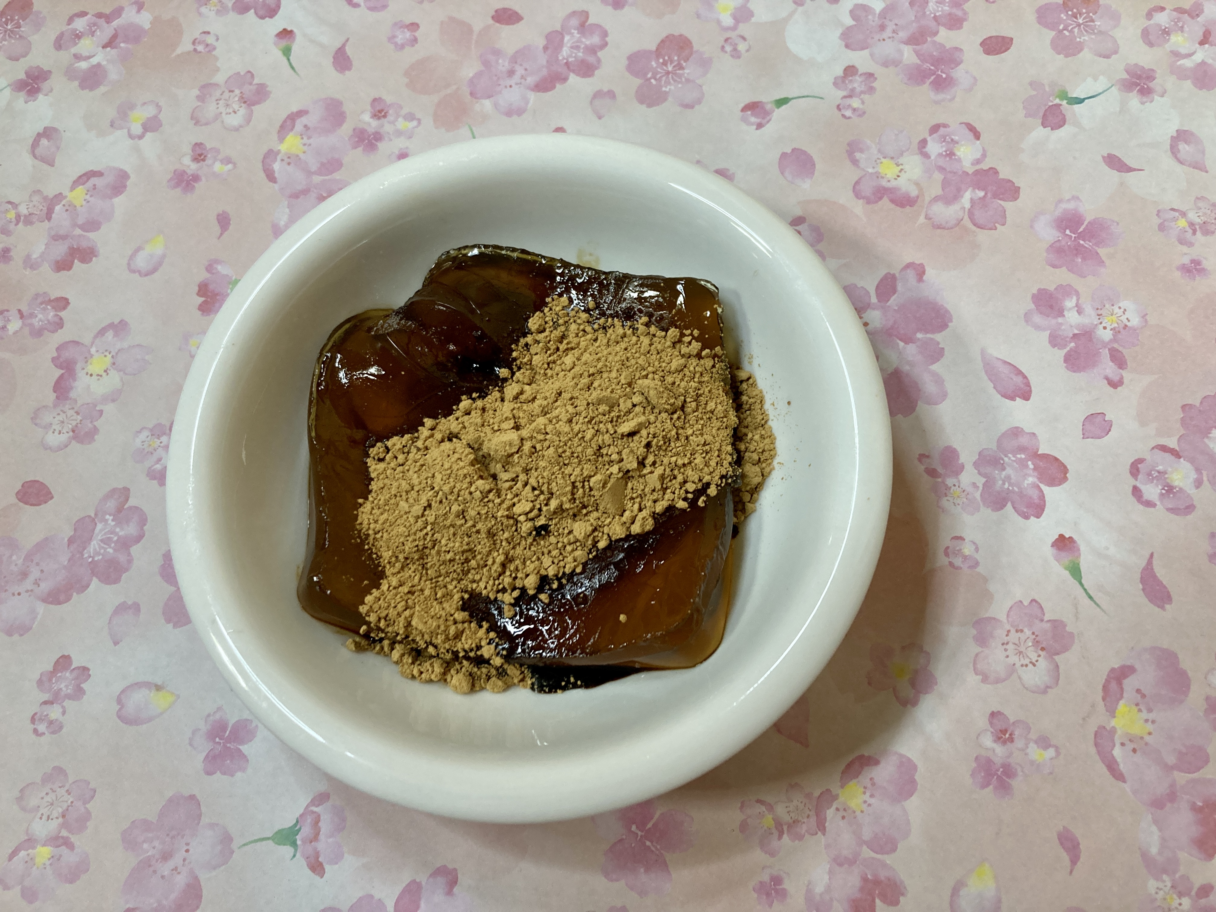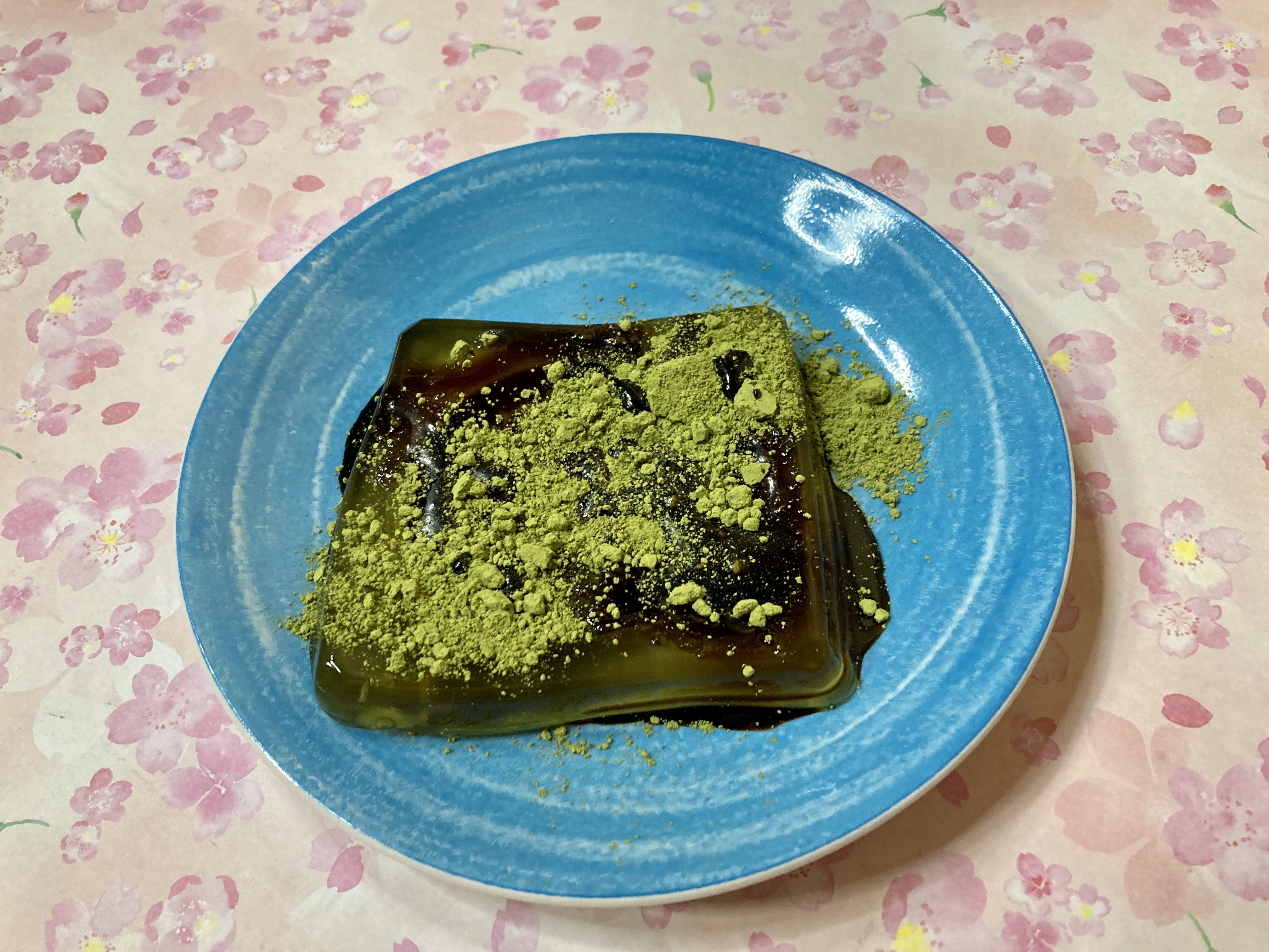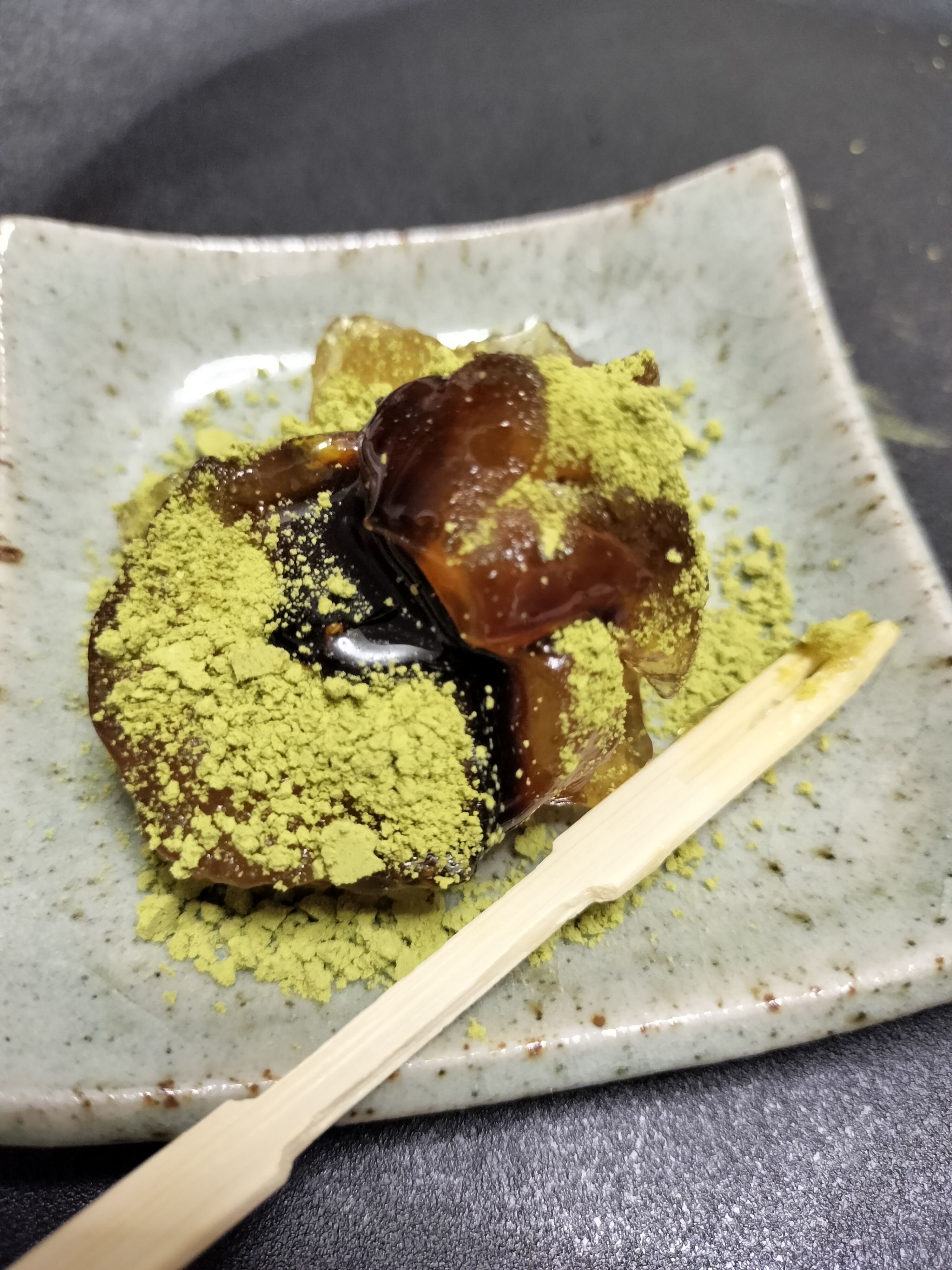 抹茶のきな粉と黒蜜をわらび餅にかけました。