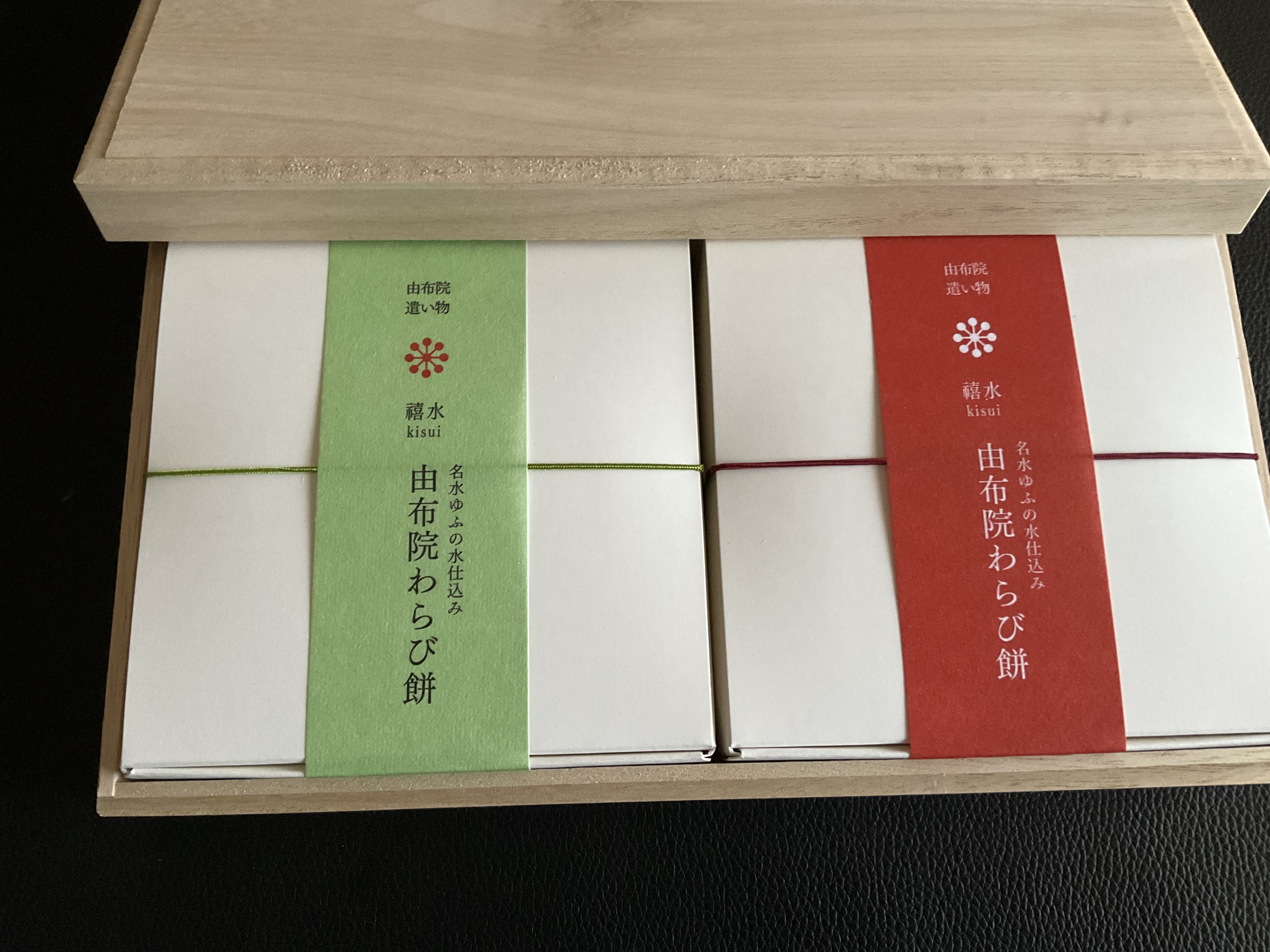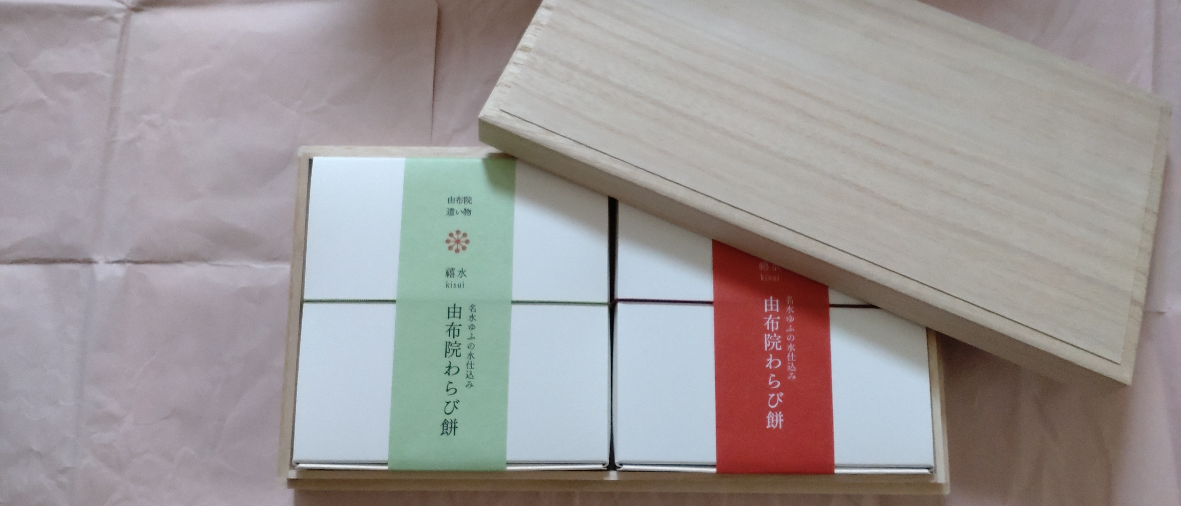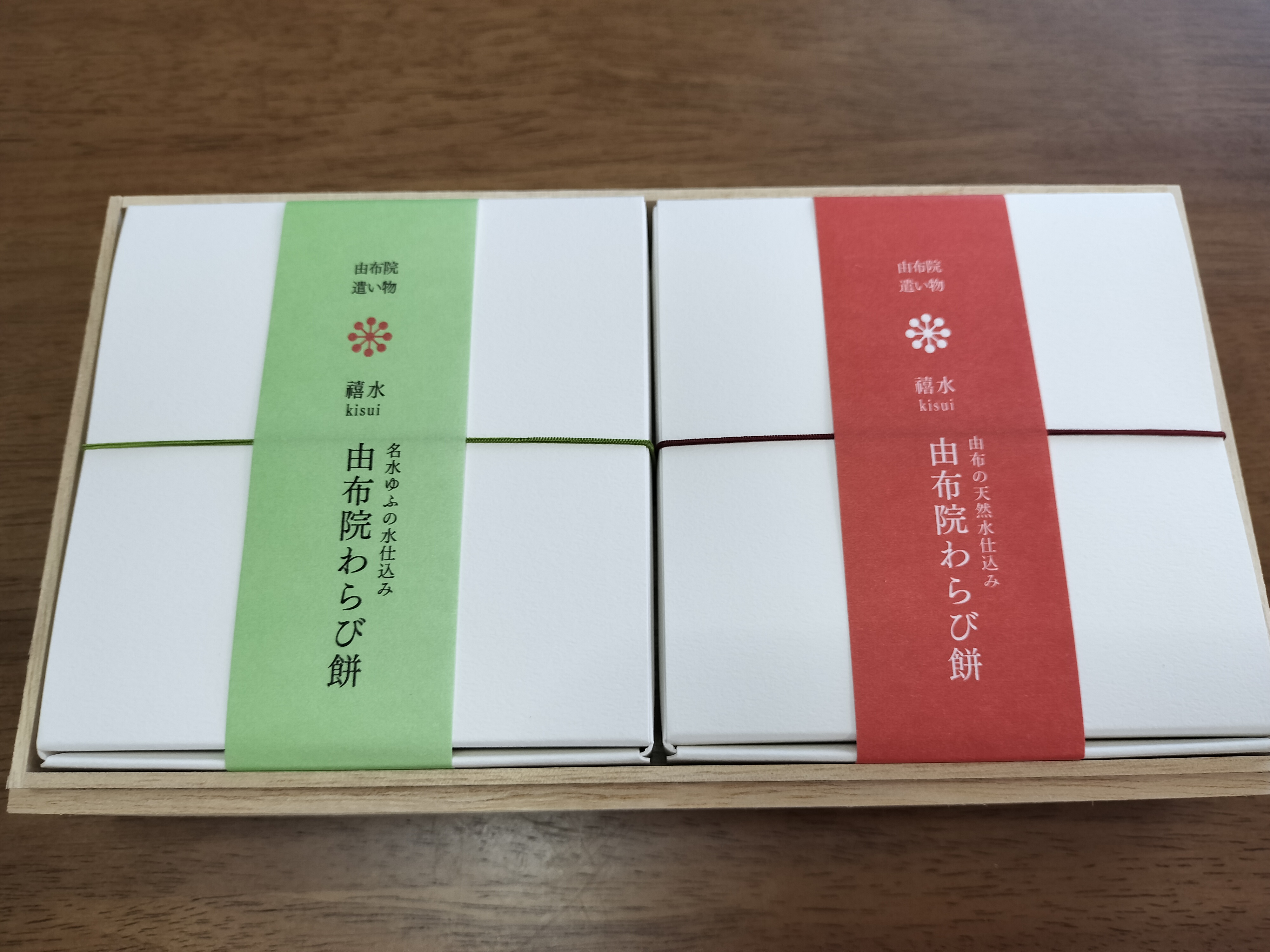 桐箱に入っているので、贈答用にふさわしい商品だと思いました。また、箱を開けると、中には黒糖きな粉と抹茶きな粉の箱が2つ並び、こちらには「由布院わらび餅」の名が記されており、上品さが伝わってきました。また、裏面には、原材料や内容量、賞味期限、保存方法等がしっかりと記載されており、わかりやすいと思いました。