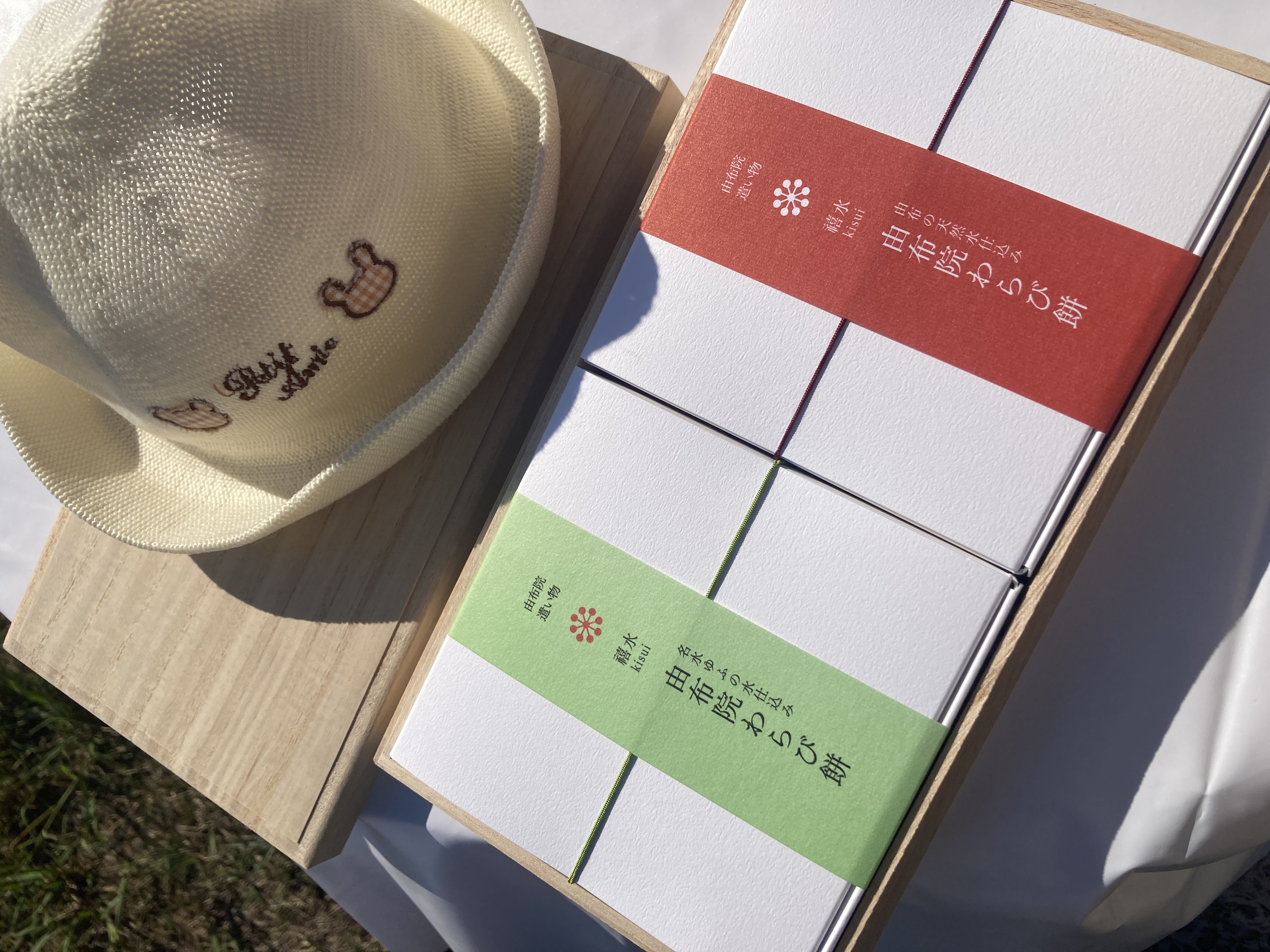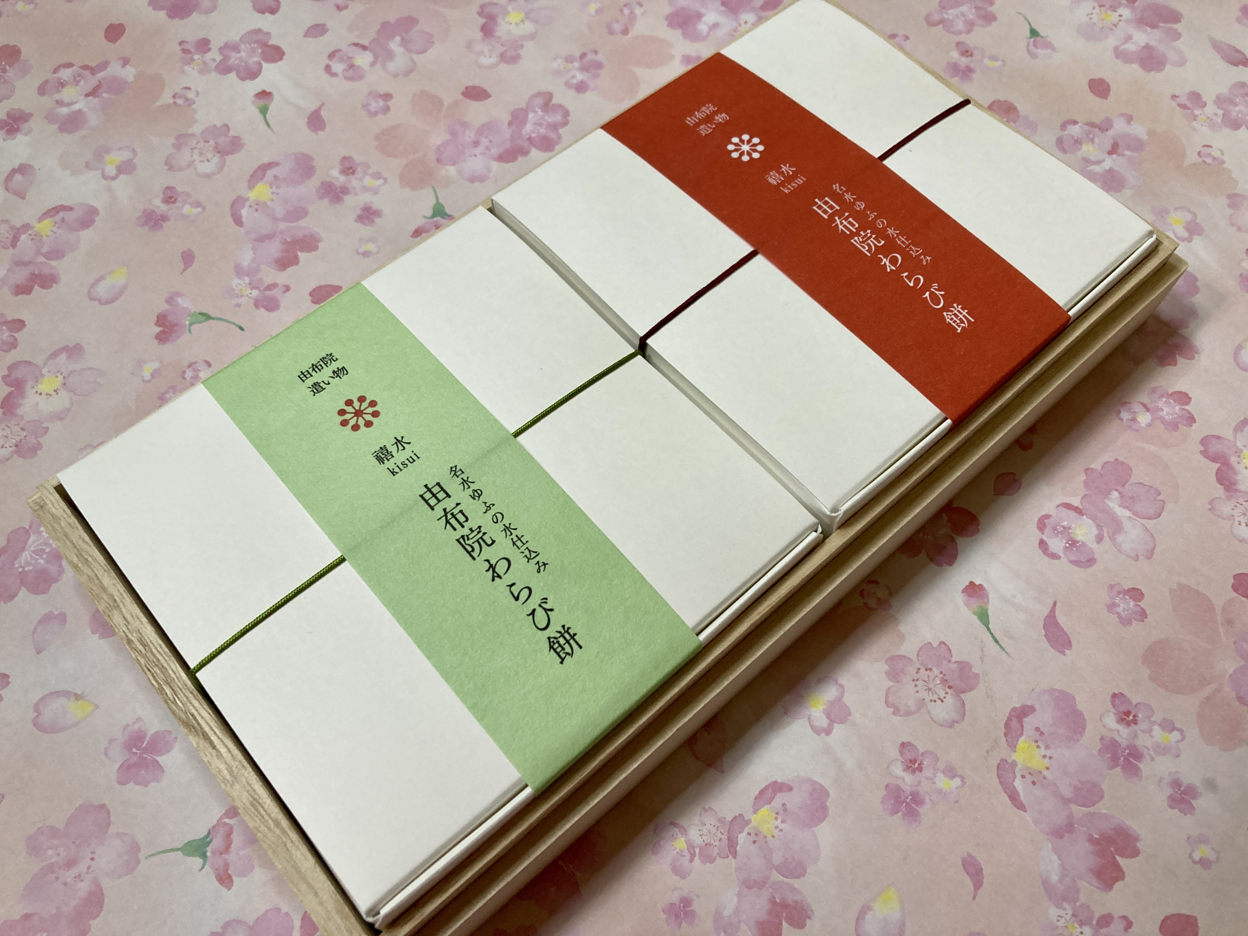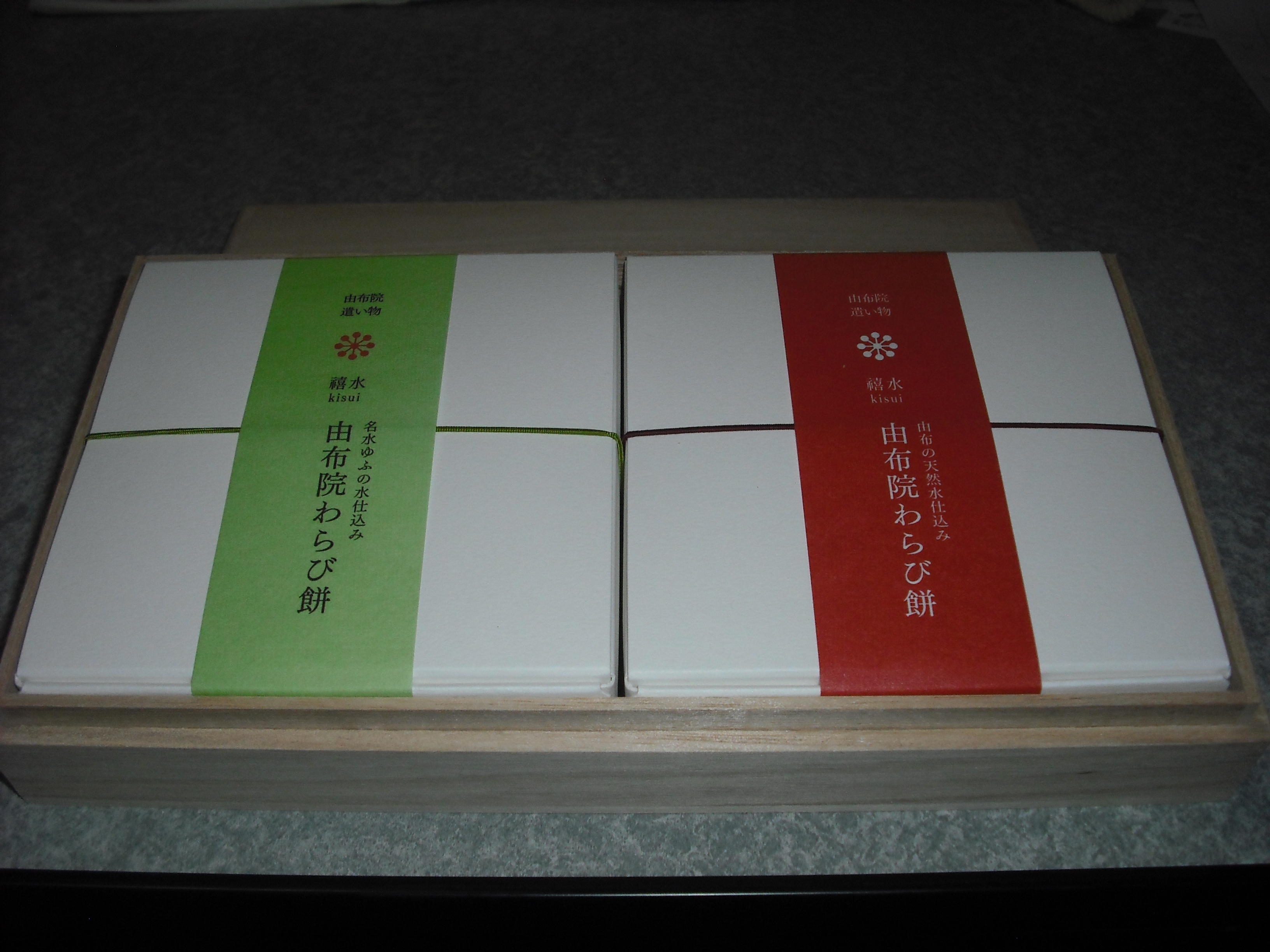 桐箱に入っているので、贈答用にふさわしい商品だと思いました。また、箱を開けると、中には黒糖きな粉と抹茶きな粉の箱が2つ並び、こちらには「由布院わらび餅」の名が記されており、上品さが伝わってきました。また、裏面には、原材料や内容量、賞味期限、保存方法等がしっかりと記載されており、わかりやすいと思いました。