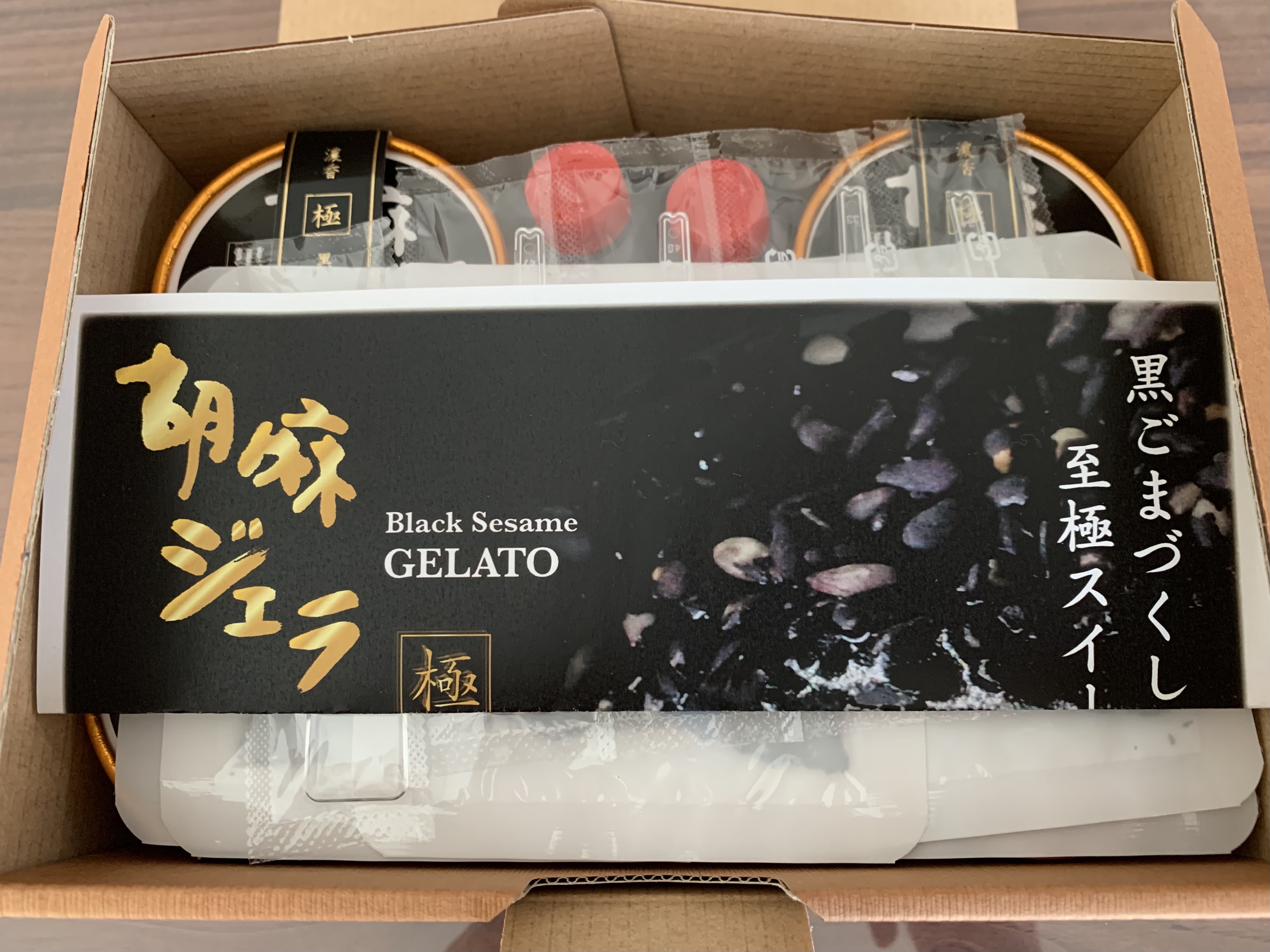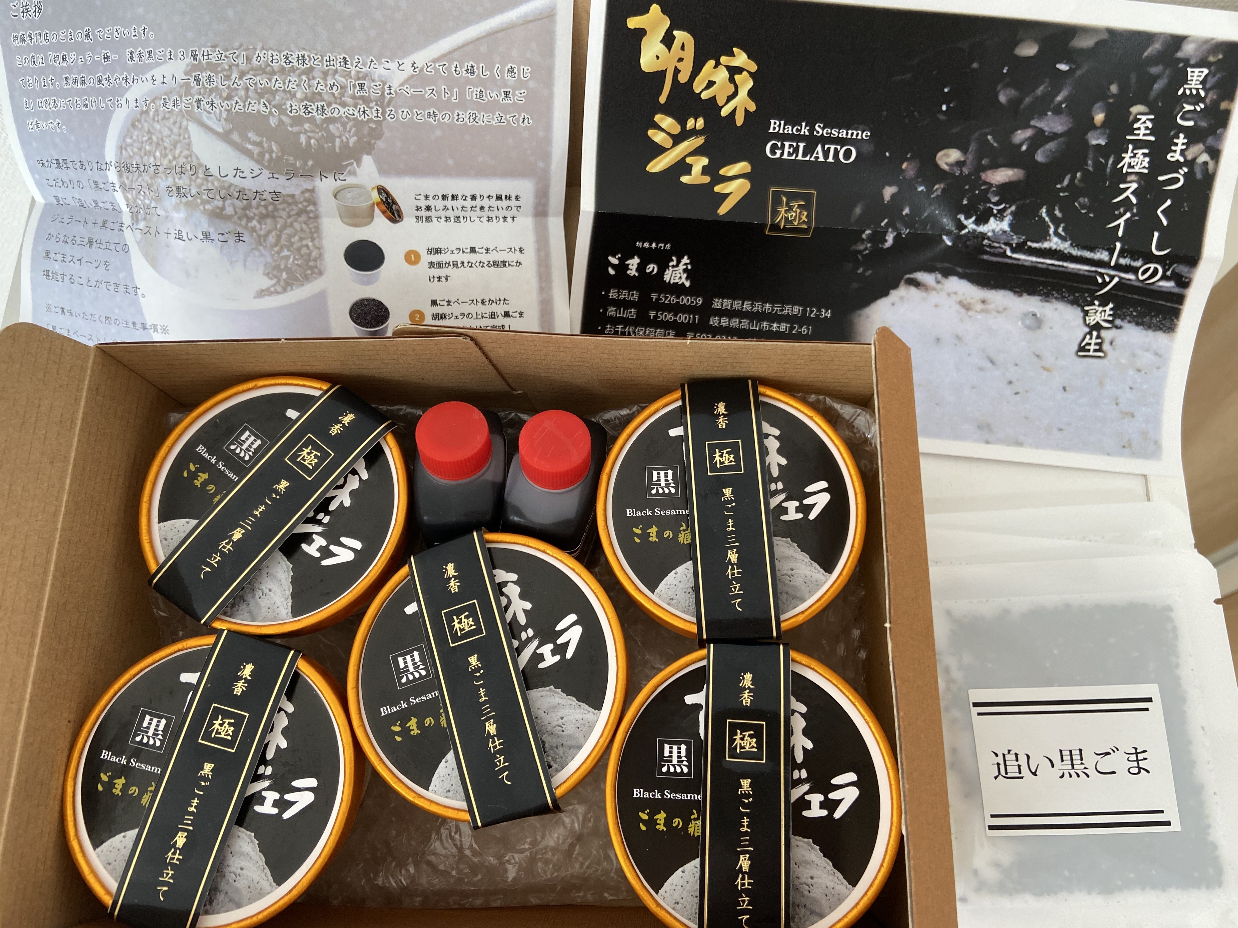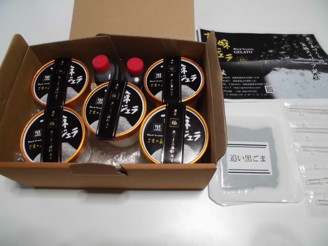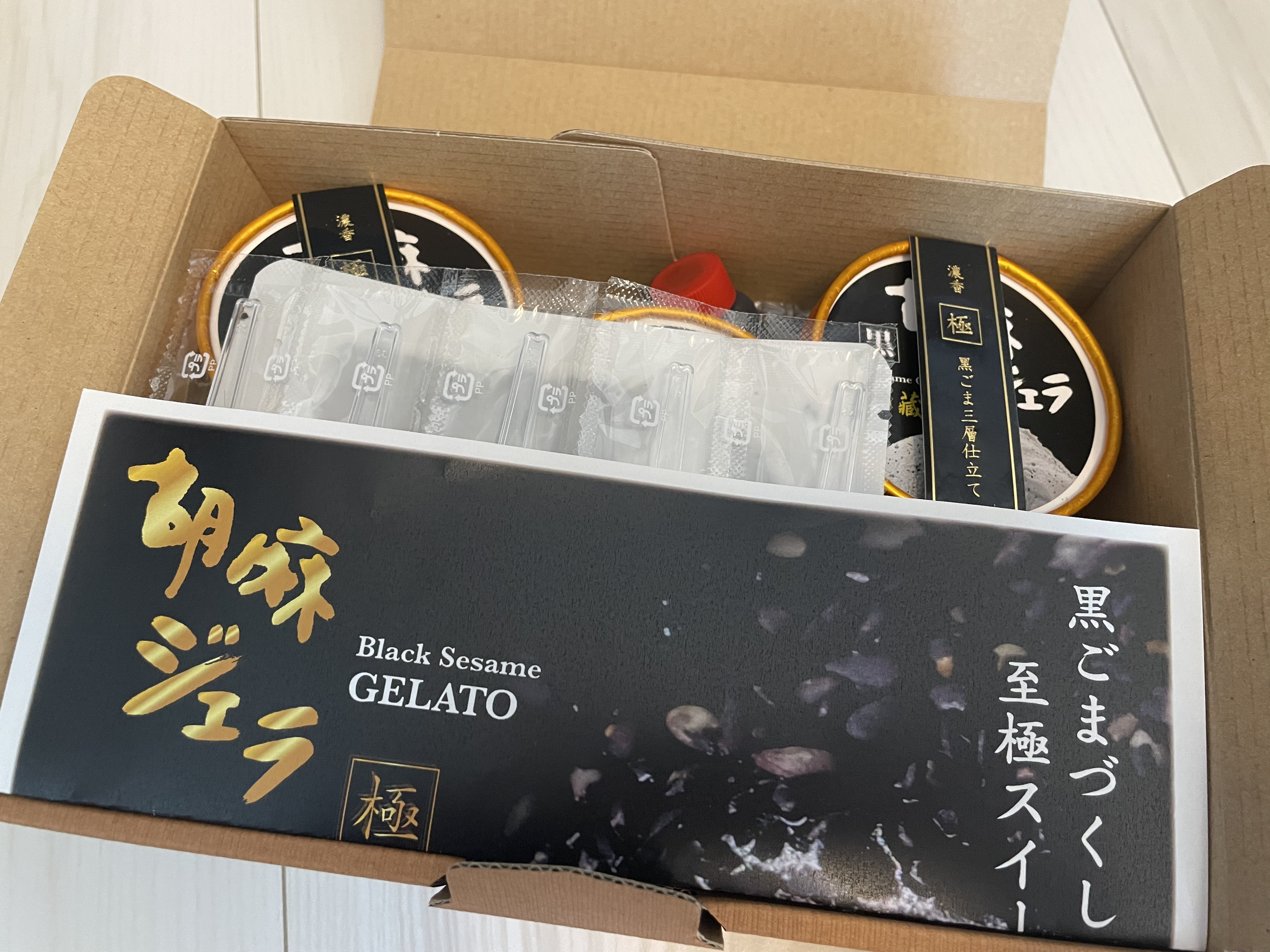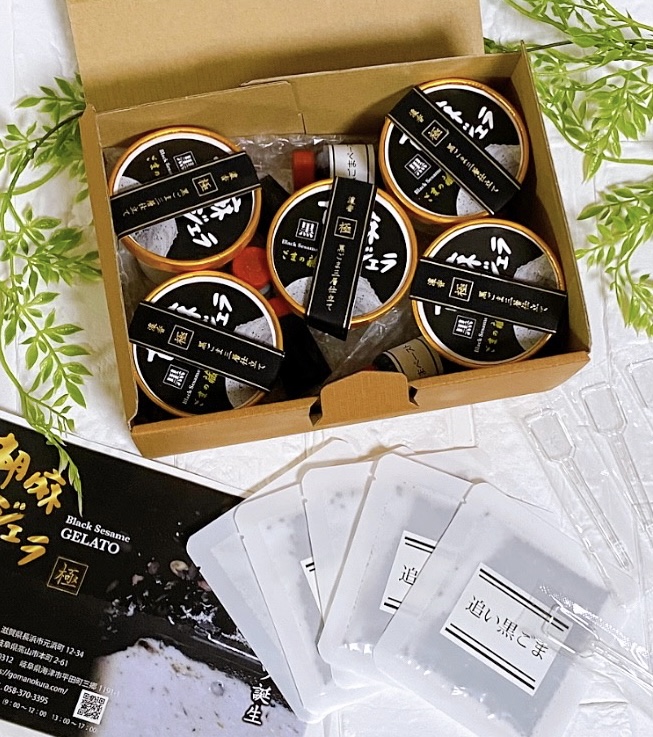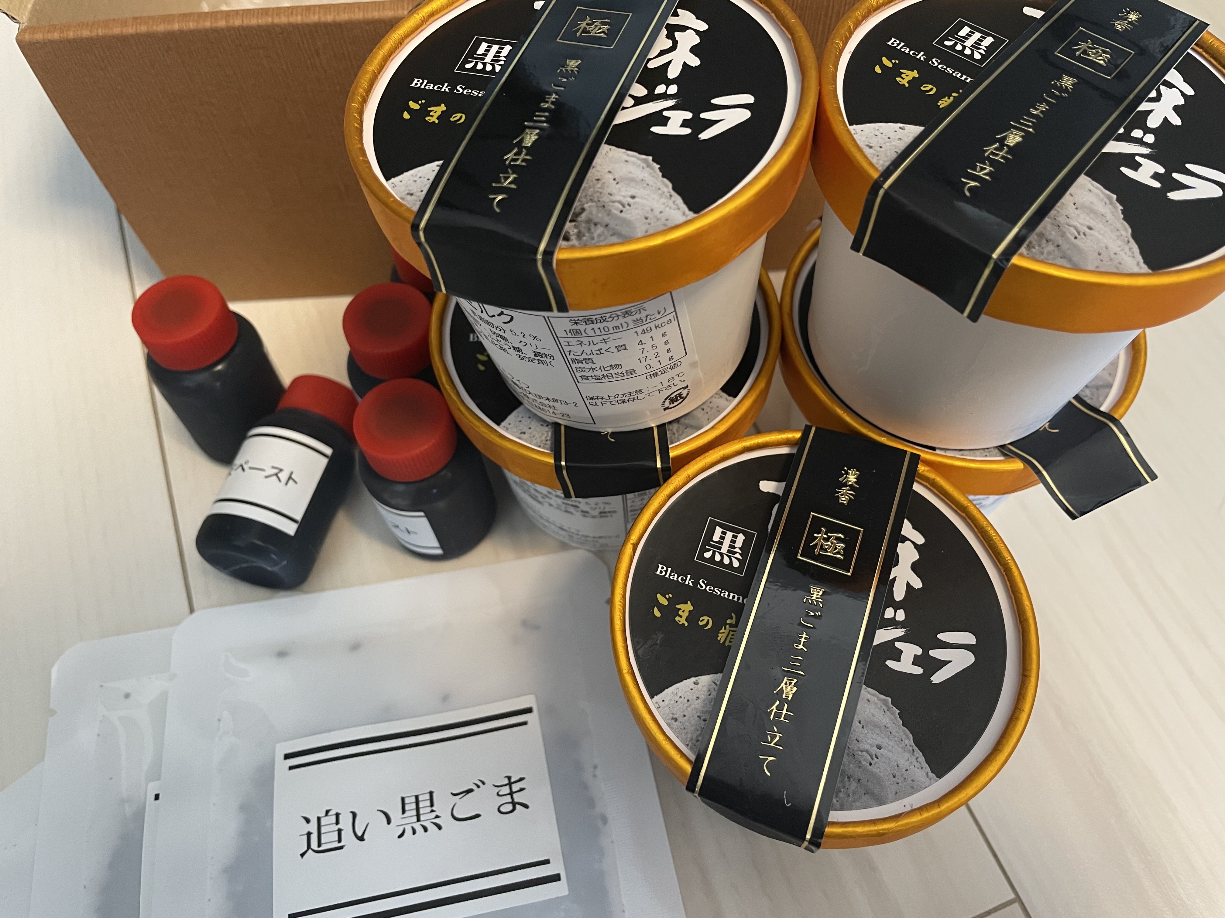 箱を開けてみるとジェラートとミニボトルに入った黒ごまペースト、袋に入った追いごま、プラスチックのスプーンがそれぞれ5つずつ入っていました。