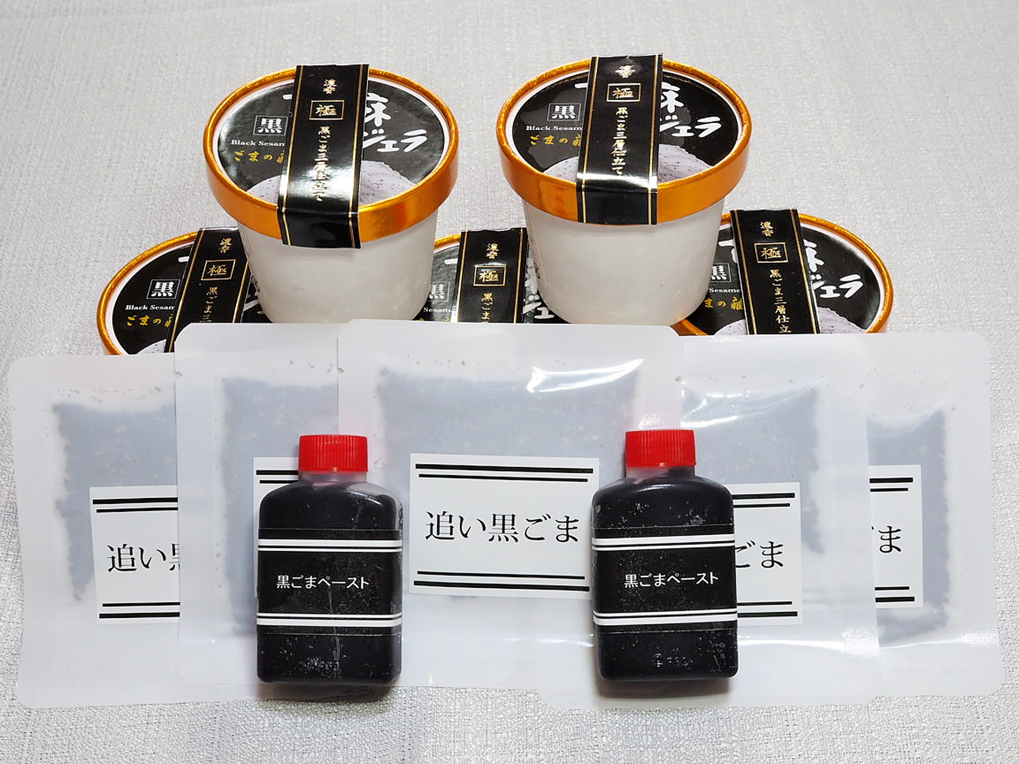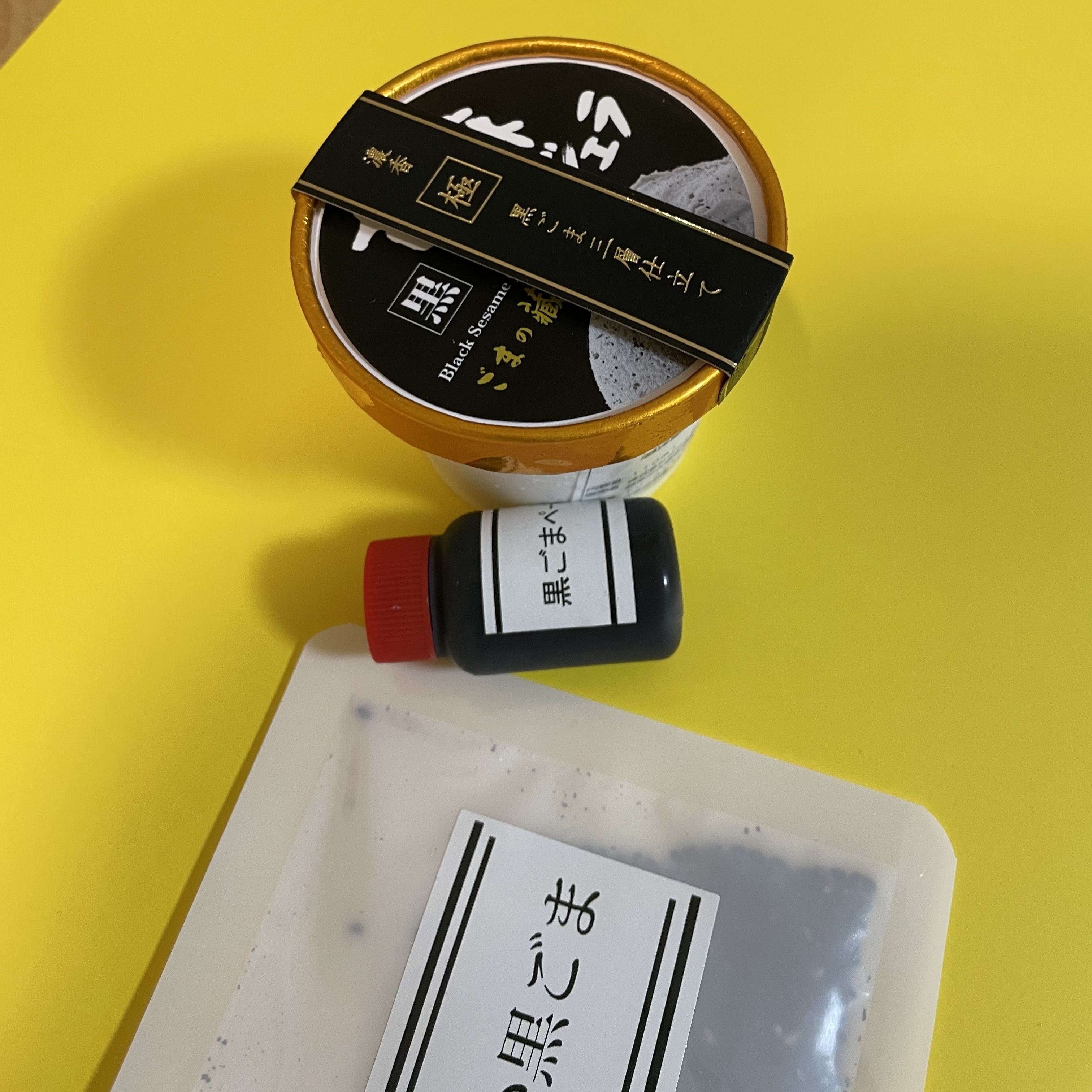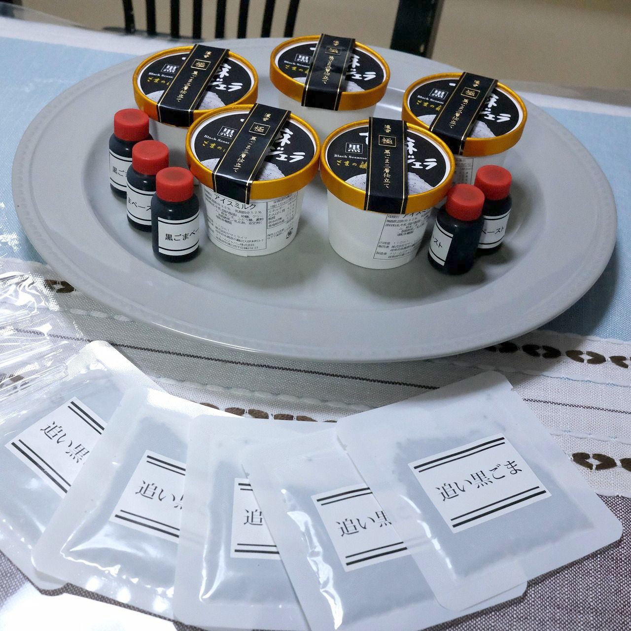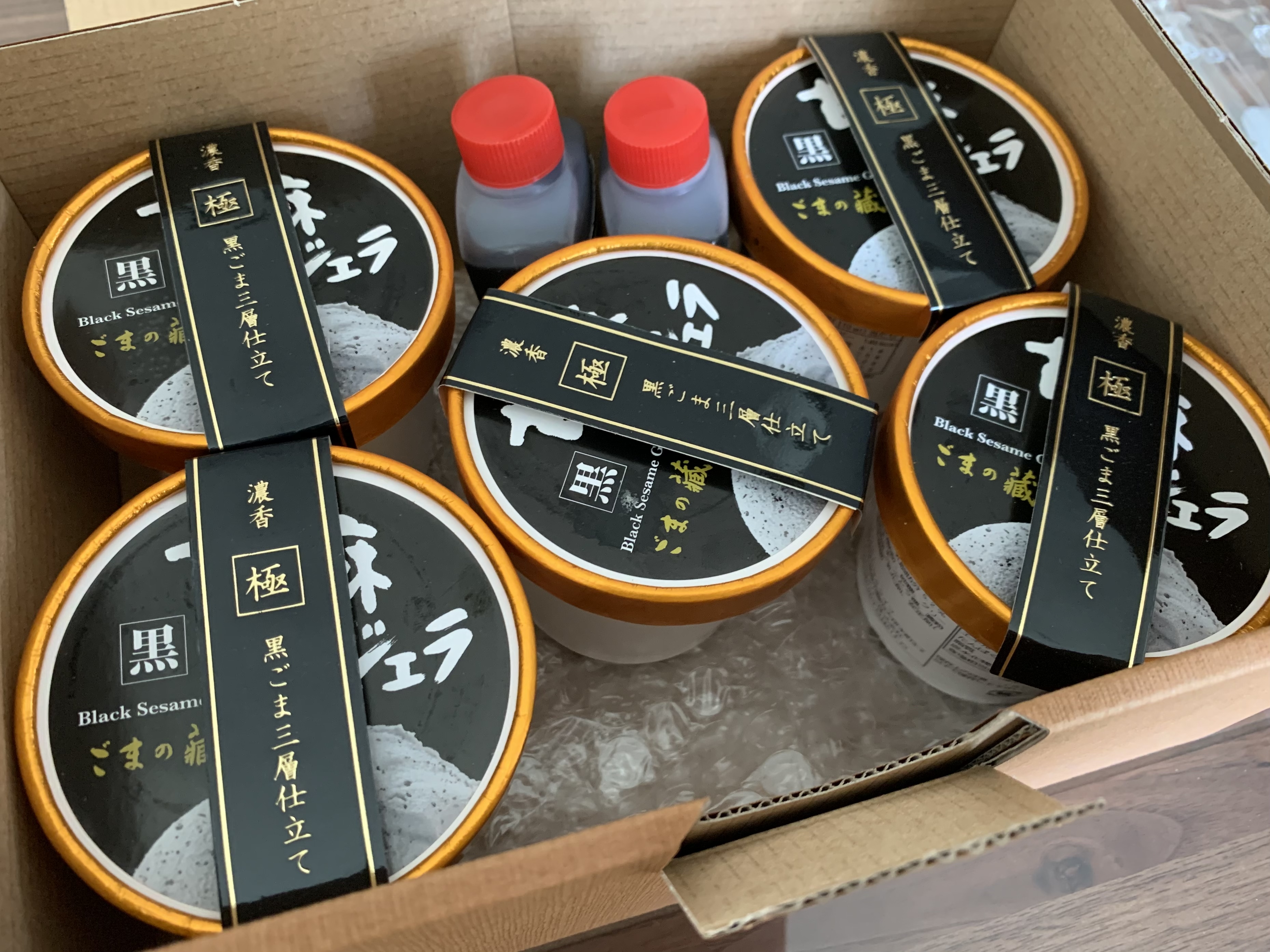 箱を開けてみるとジェラートとミニボトルに入った黒ごまペースト、袋に入った追いごま、プラスチックのスプーンがそれぞれ5つずつ入っていました。