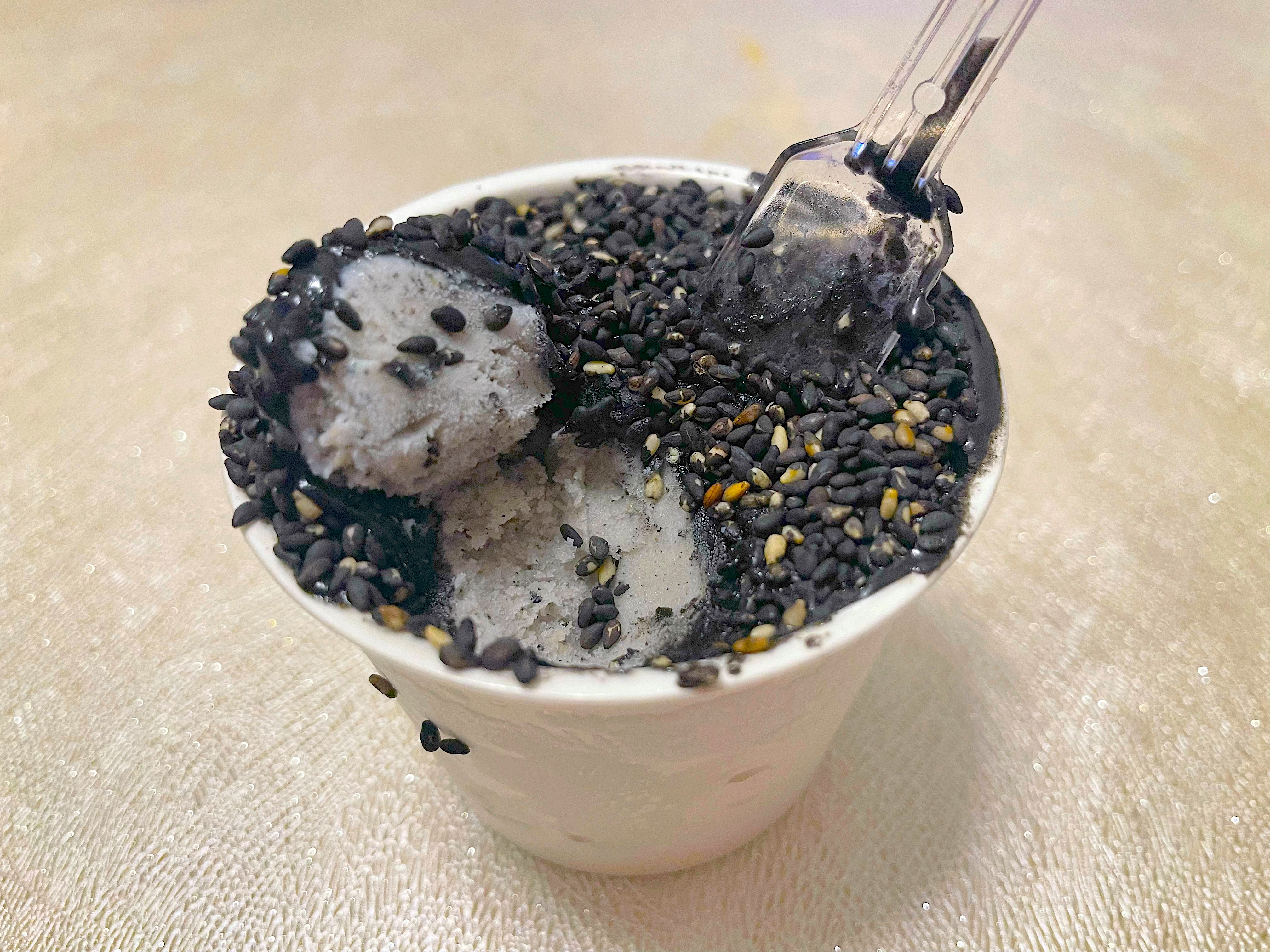 まず、ジェラートの上から解凍した黒ごまペーストをたっぷりかけます。さらに、追いごまをかけるのですが、袋を開けた瞬間の、ごまの香ばしい香りがたまりません。その量の多さと言ったらカップから溢れ出しそうなくらいです。