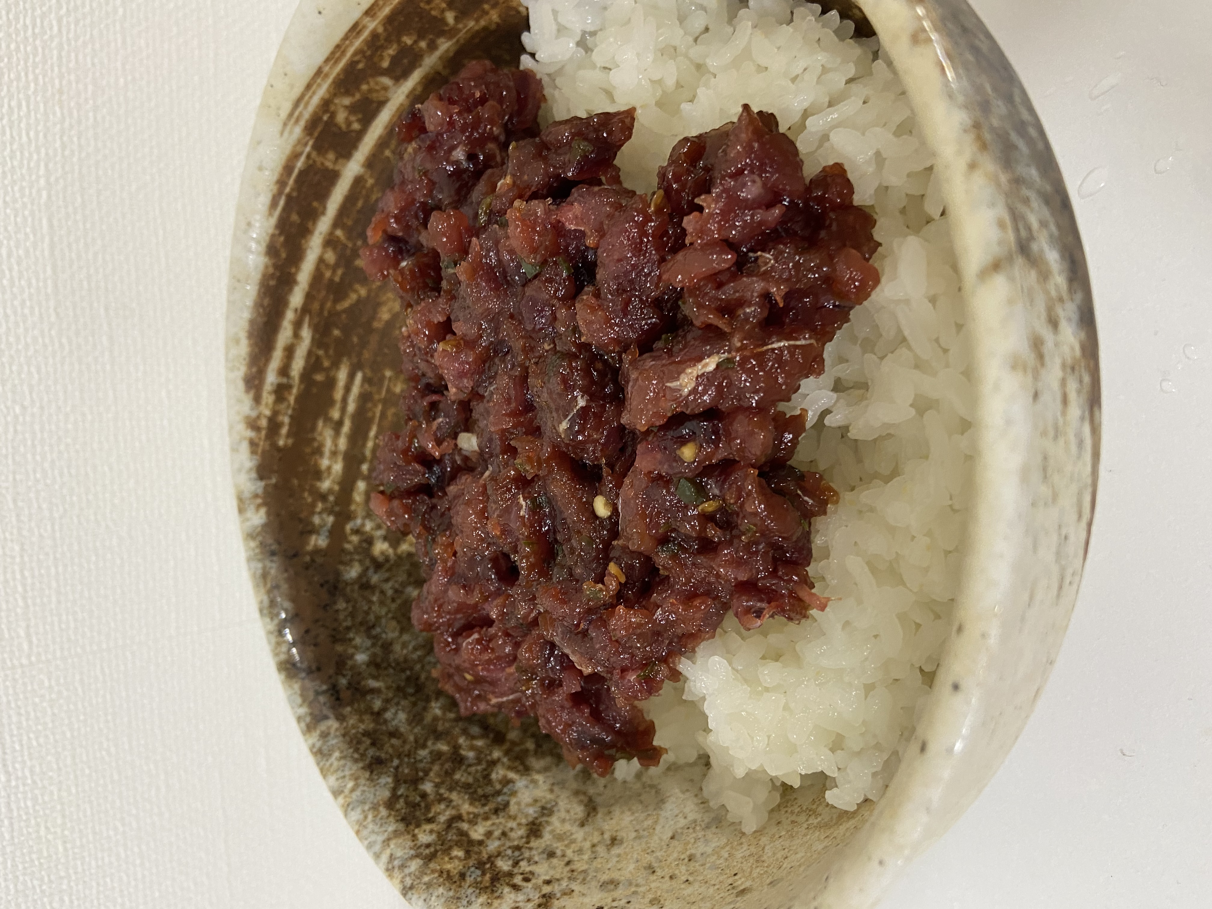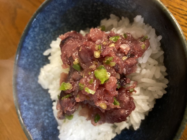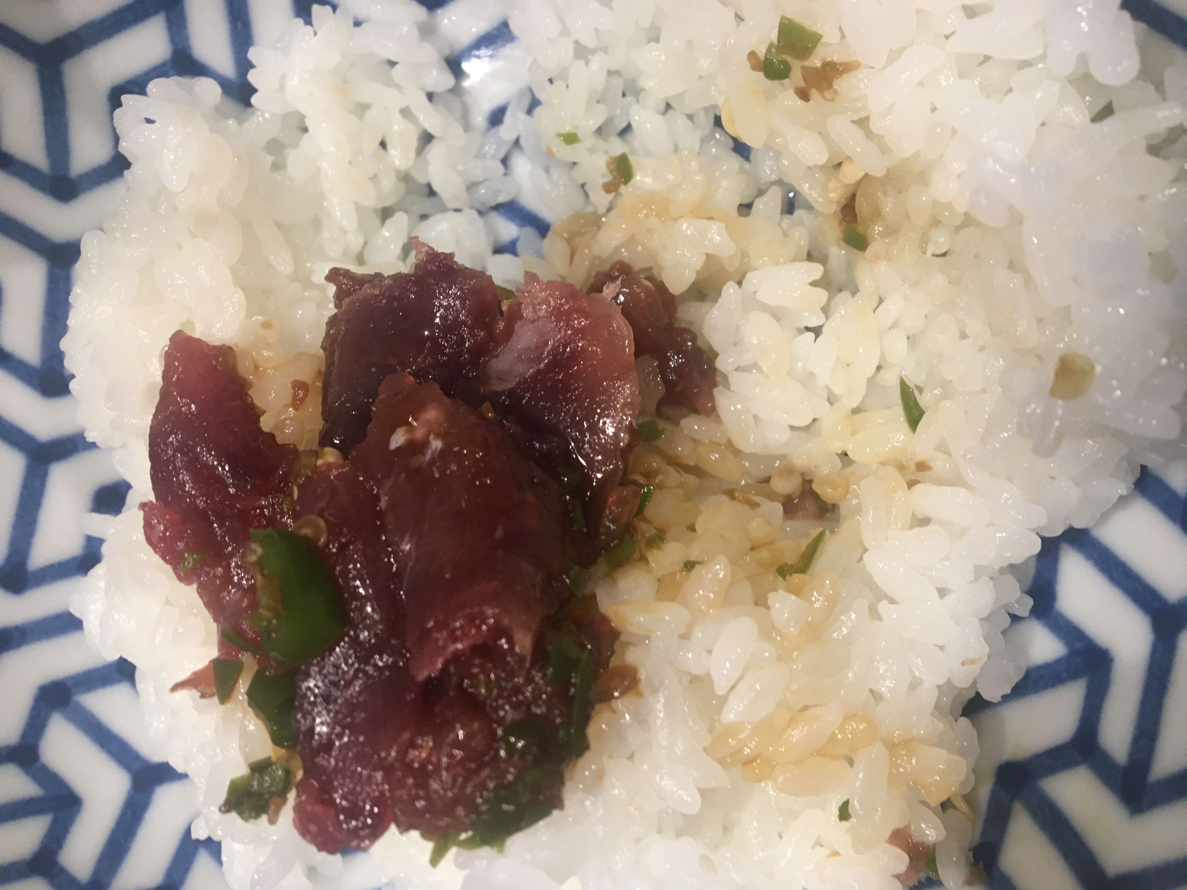 (2)青唐辛子、醤油と混ぜたうずわを熱々のご飯に乗せてそのままかっこみます。