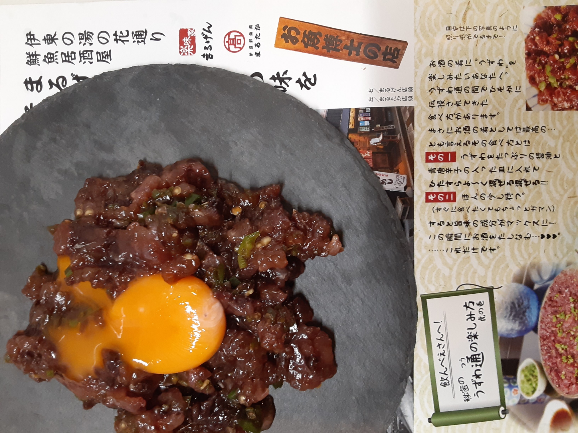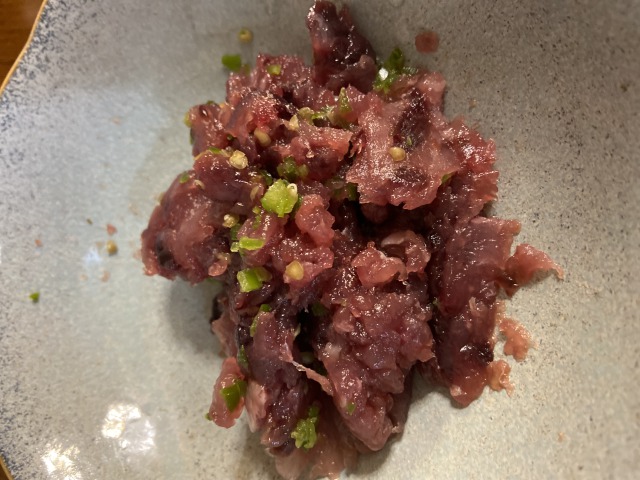 ①新鮮なうずわのたたき(宗田鰹)を、お醤油とたっぷりの青唐辛子でいただきます。濃厚で美味しい!