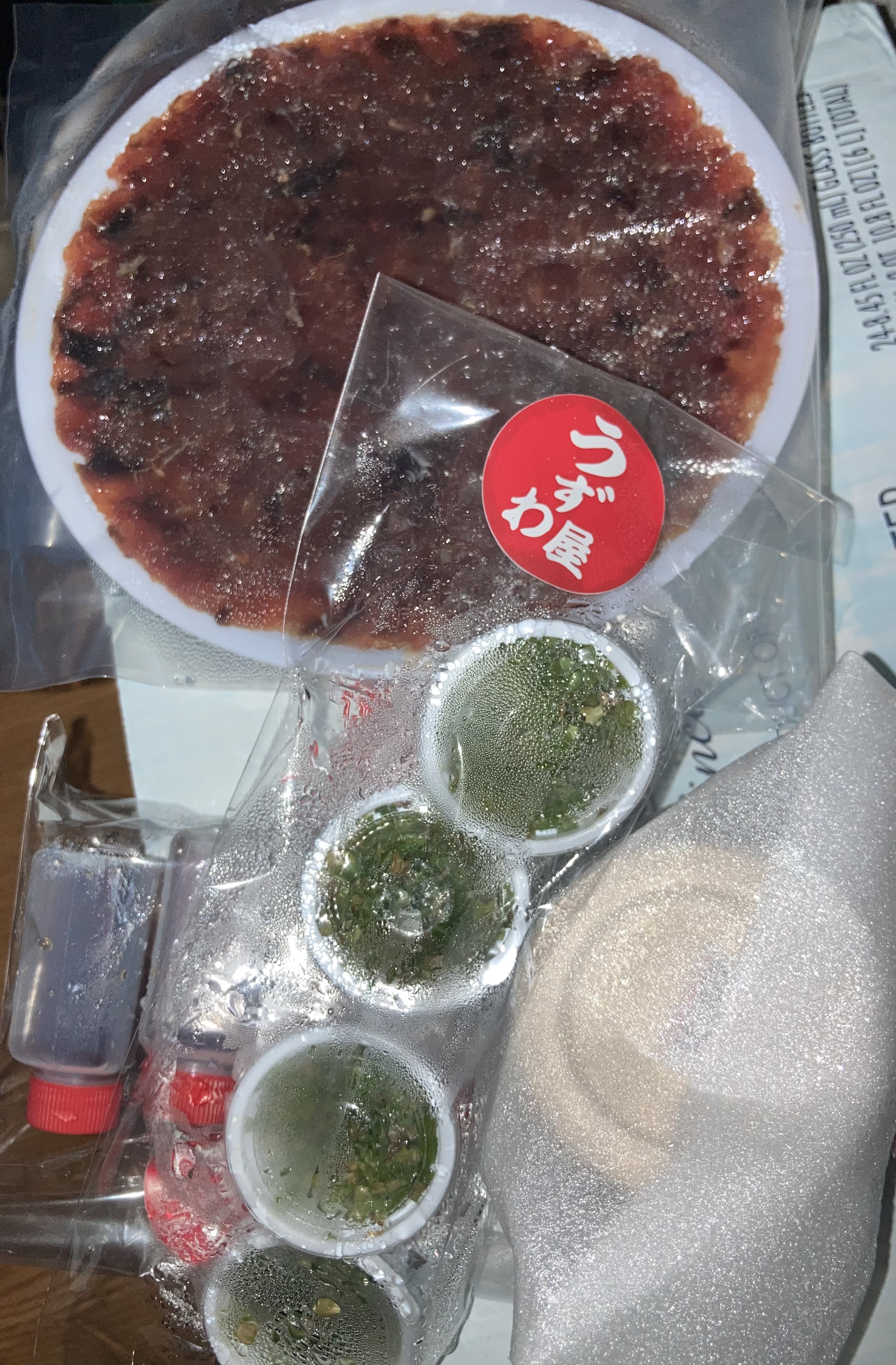 (1)薬味の青唐辛子を加えた醤油とうずわをよく混ぜそのまま召し上がります。(少し置くと旨みが増します。お酒の肴にも最高!)