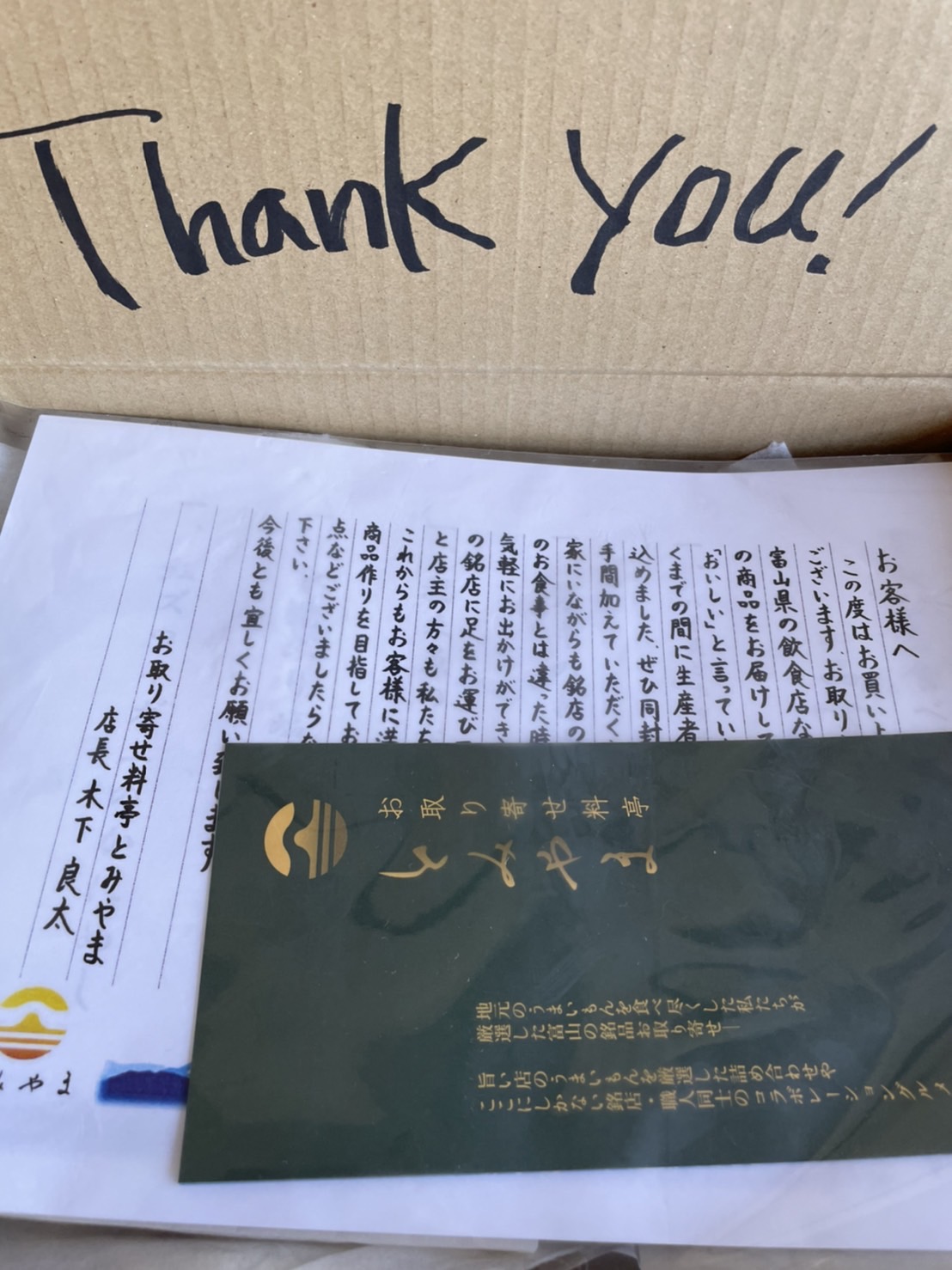 こんなにも、富山に美味しいものが溢れてるのかと思い、富山に足を運びたくなりました。それぞれの料亭さんに行きたいですが、富山から遠く、コロナ禍で外出を控えられてる方には、本当におすすめで、富山の高級料亭さん達の味が、お家で同時に頂けるなんて、贅沢きわまりないです。