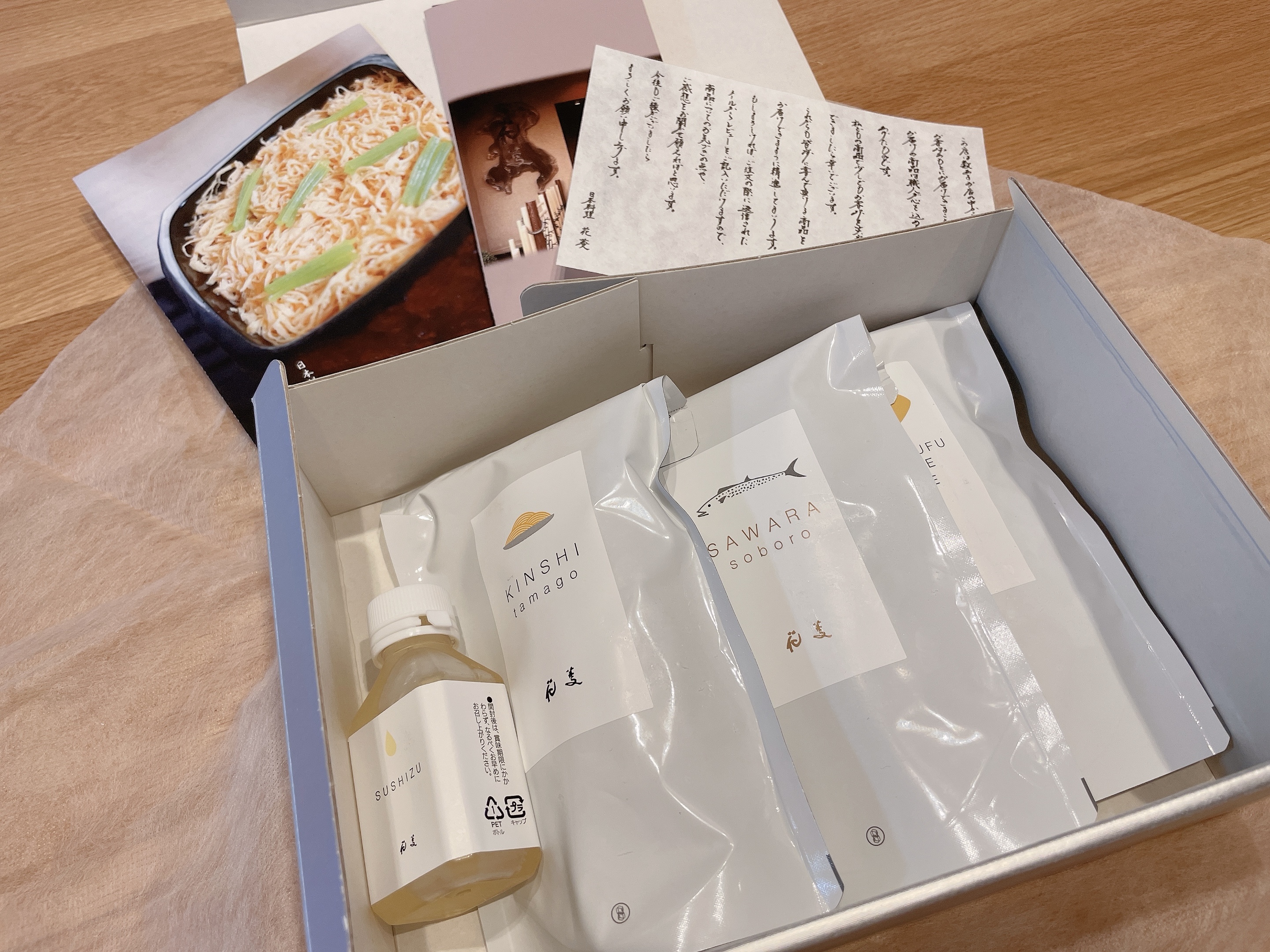 箱の中には発泡シートが敷かれ、3袋の清潔感のある白いパウチが並んでいます。「そぼろ」「錦糸卵」「椎茸、高野豆腐、揚げ」のイラストが可愛らしくもオシャレ!どっしりたっぷり入っている模様。