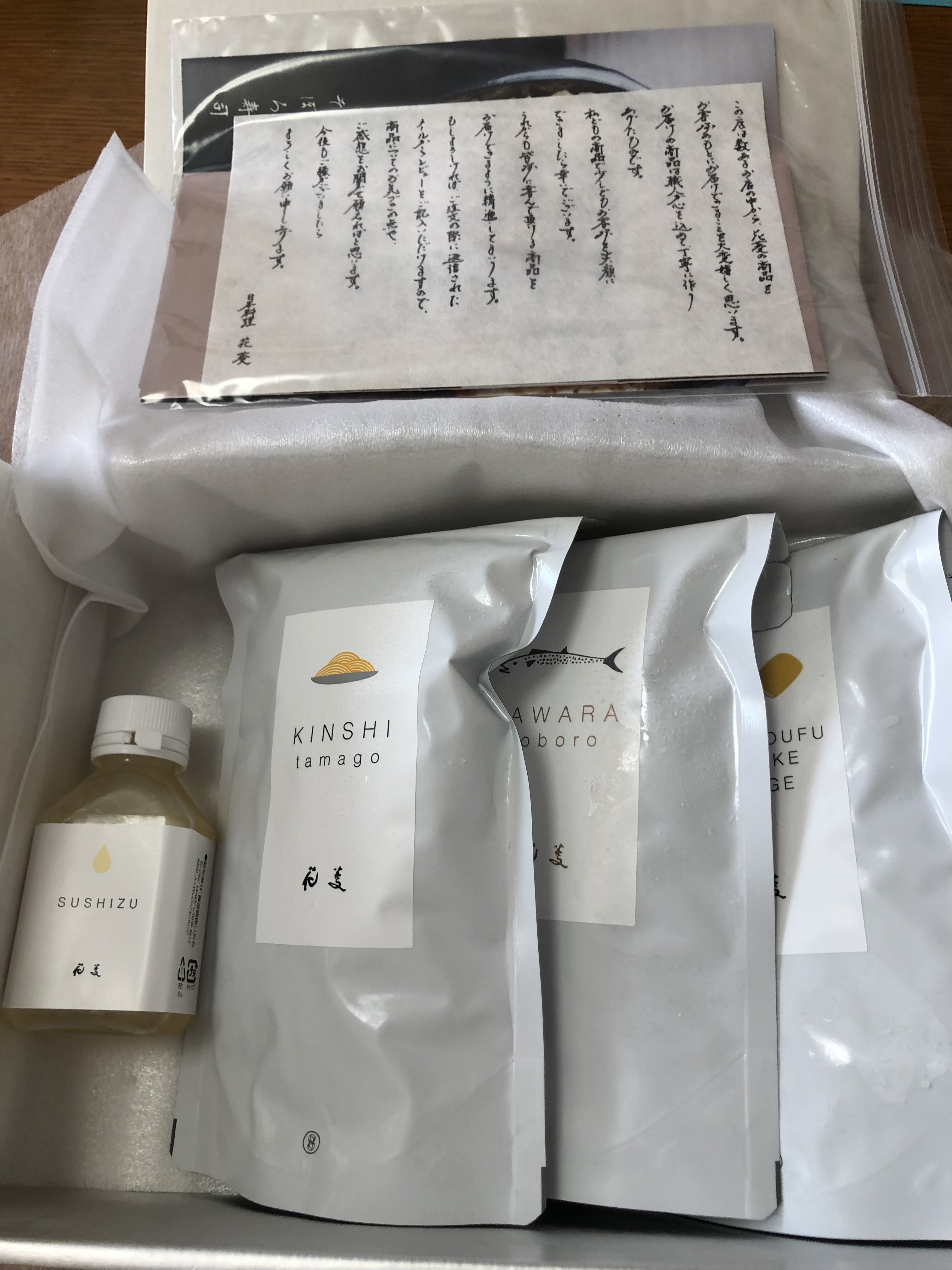透明な袋にリーフレットが入れられており、ここにも気遣いを感じます。そしてその影に小さなプラスチックボトルに入った寿司酢まで入っている!