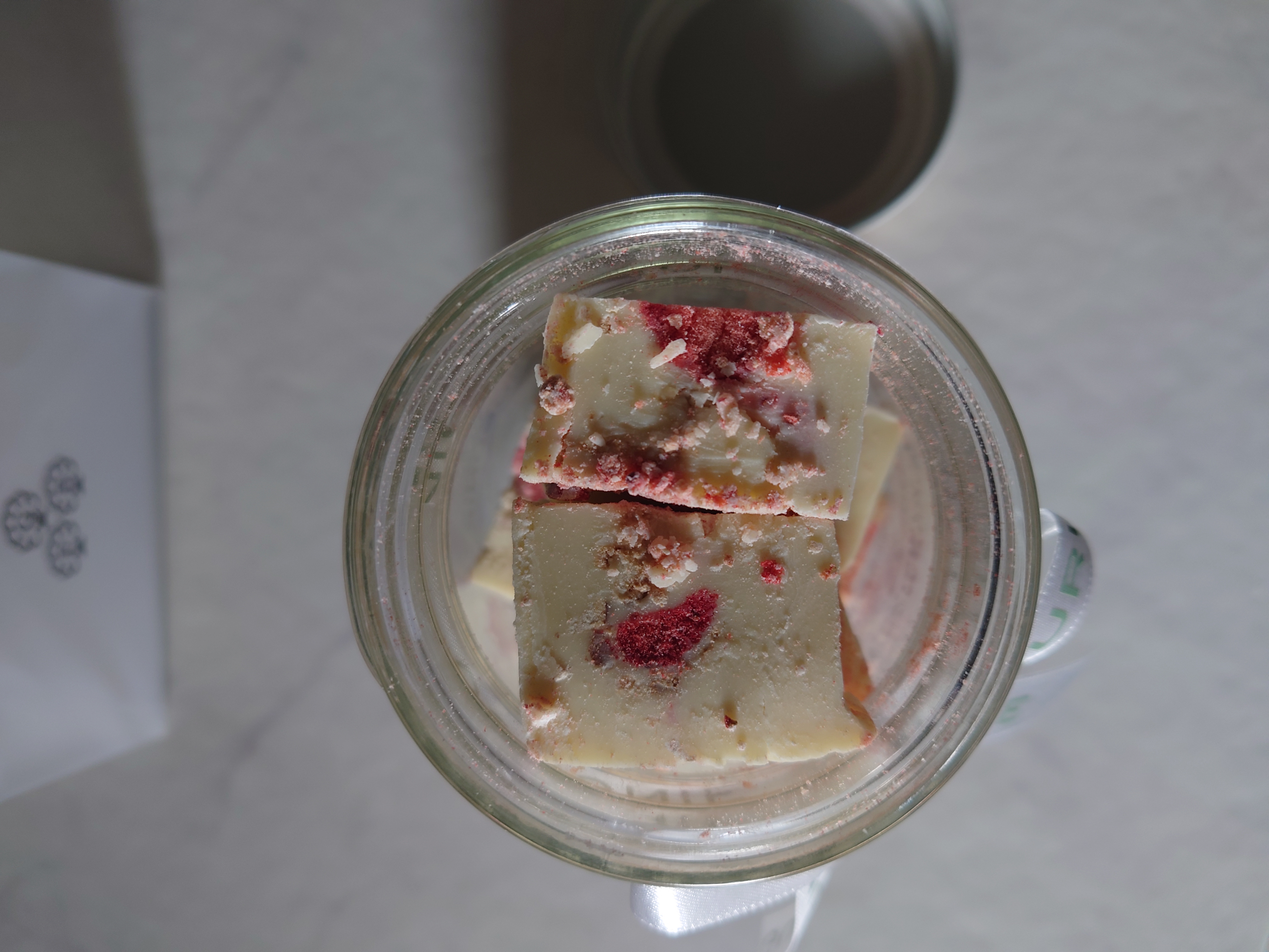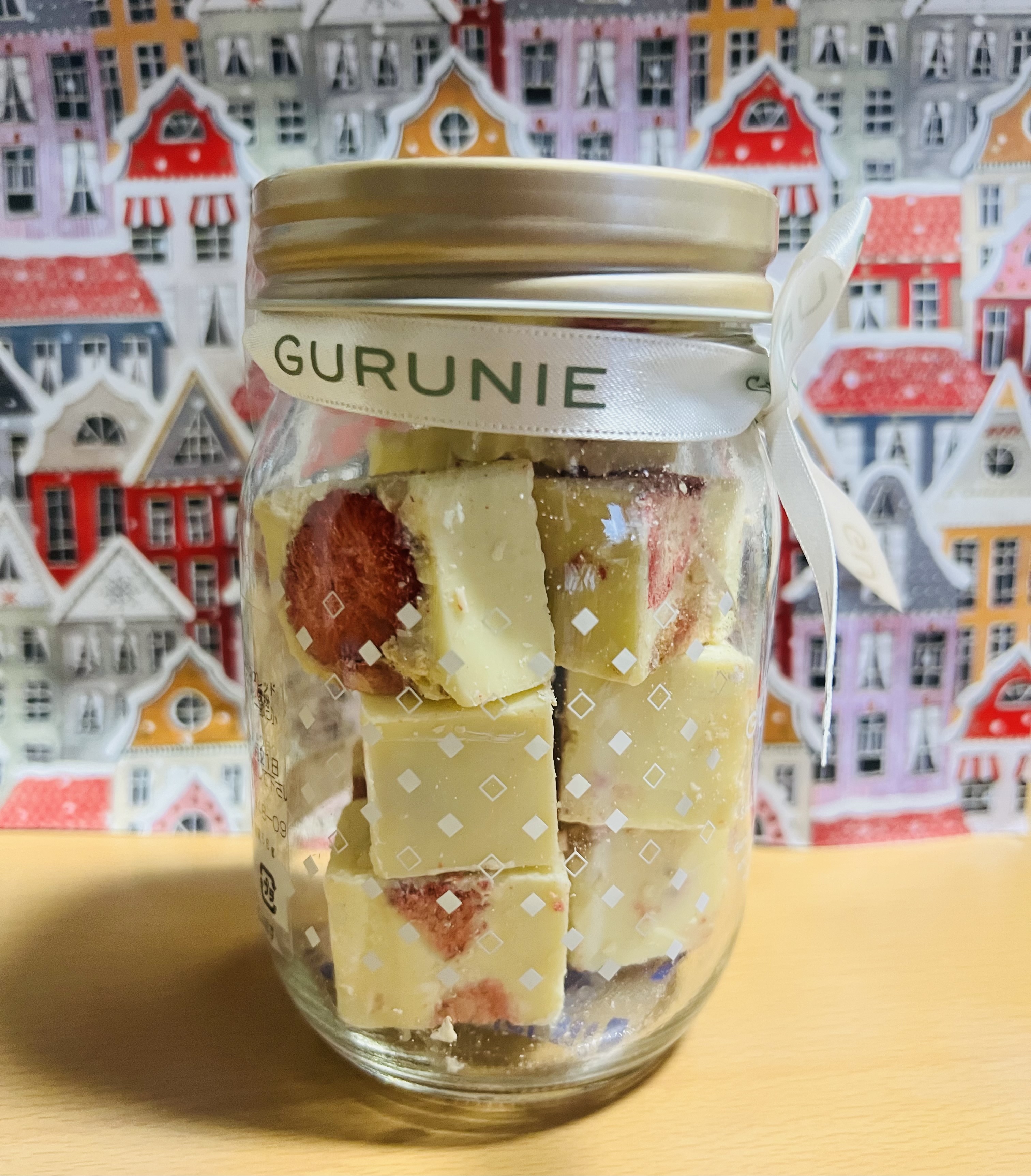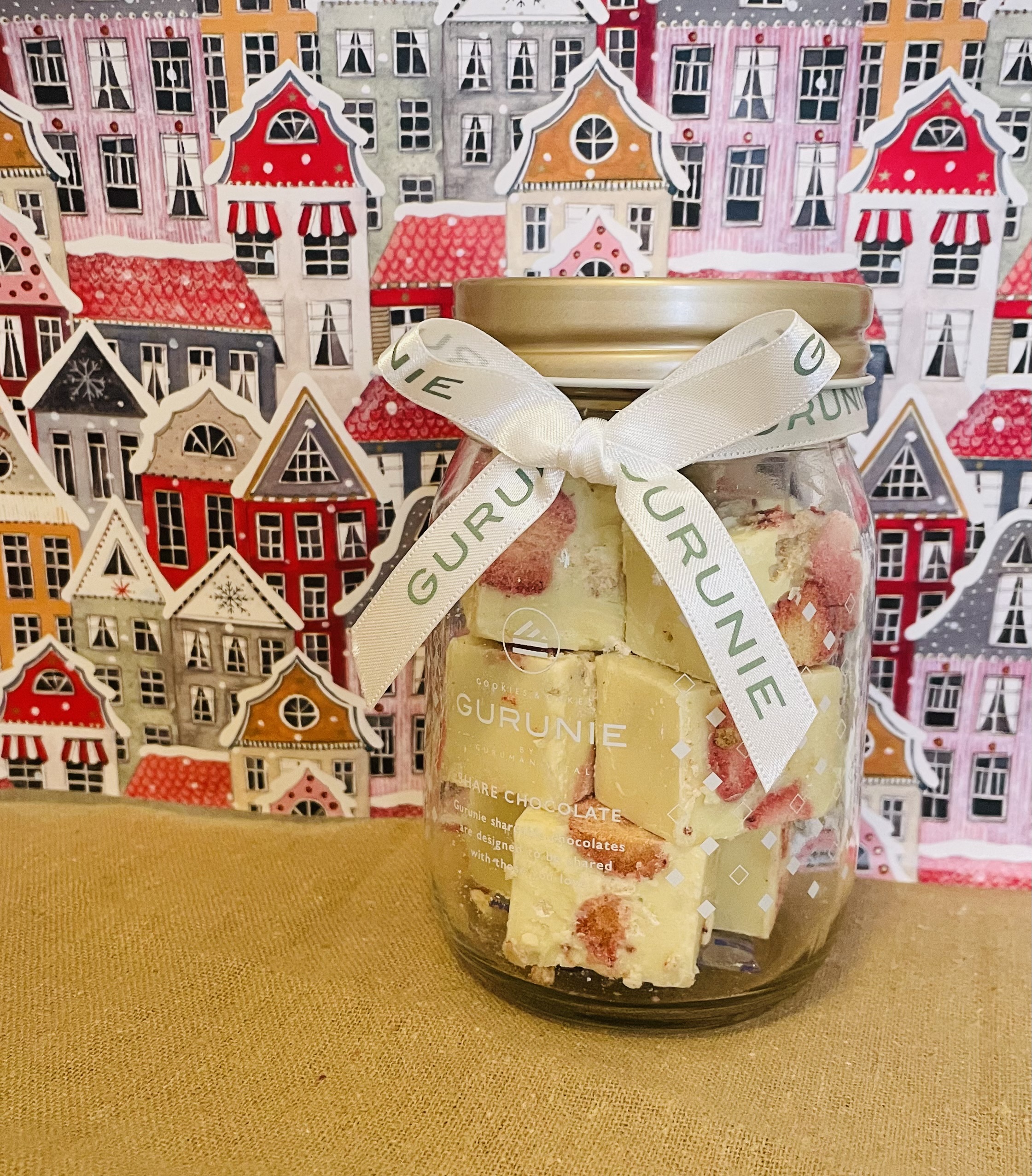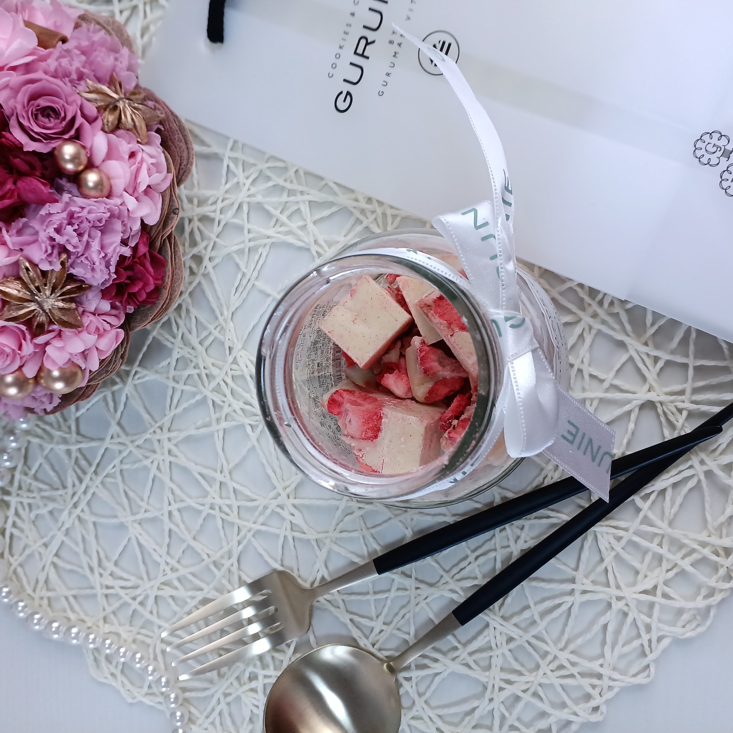 甘酸っぱいドライストロベリーと、ナッツをたっぷり入れたホワイトチョコレート。軽い食べ心地で、男性にも女性にも喜ばれてる瓶入りの贈り物にぴったりなチョコレートです。