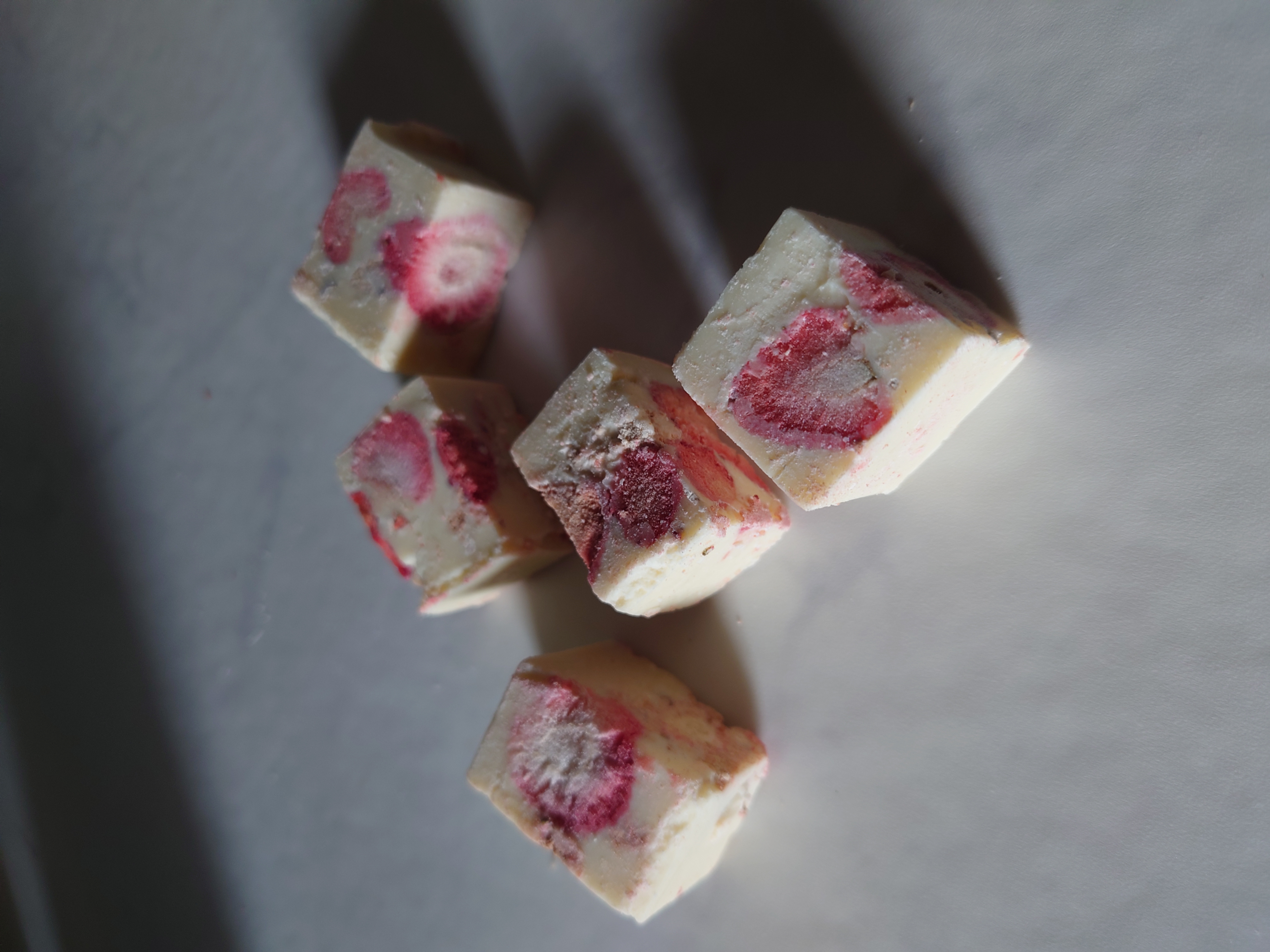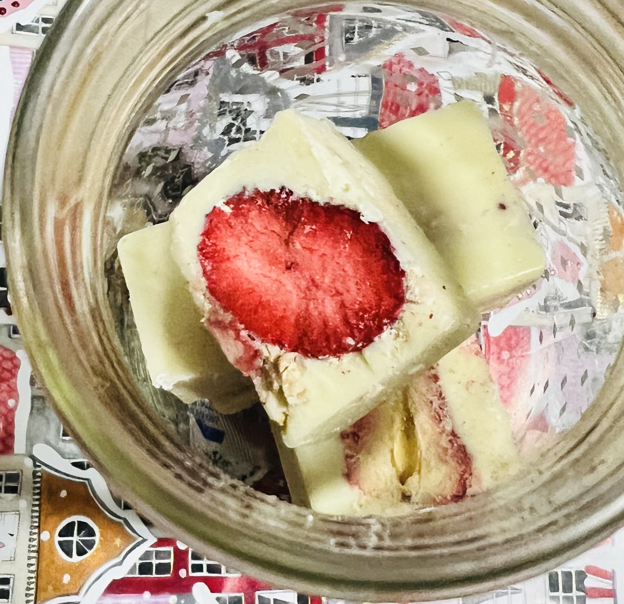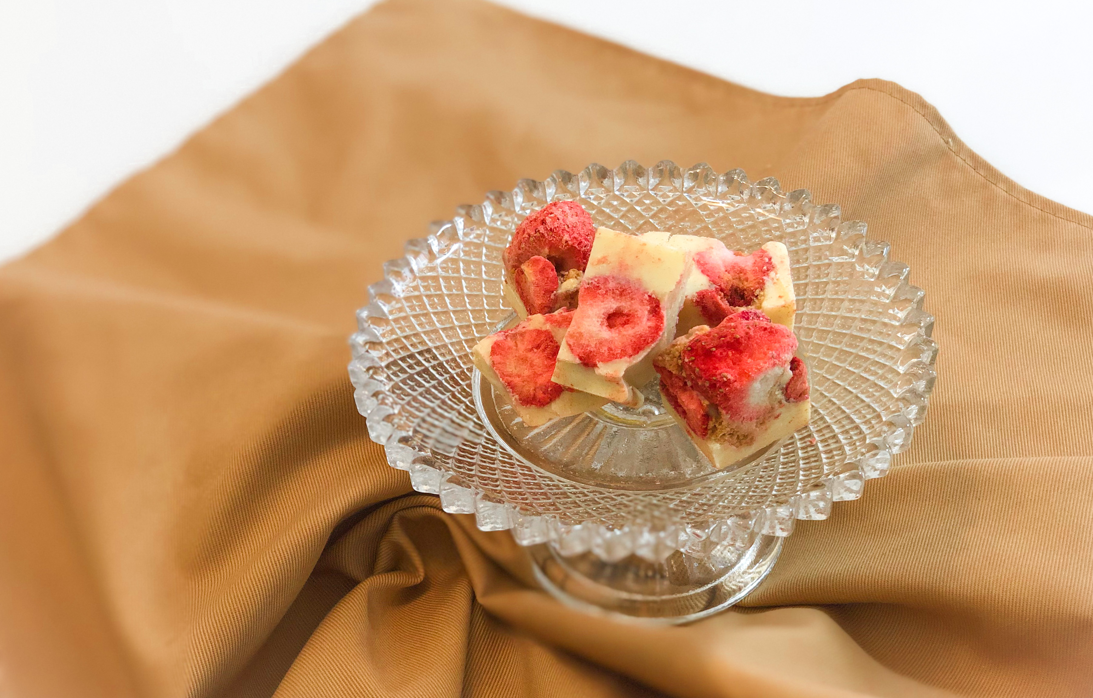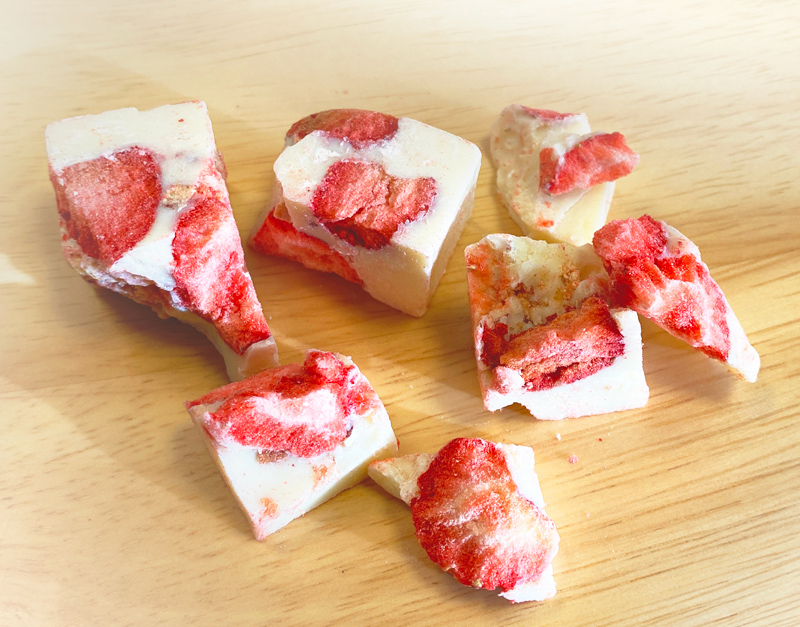 甘酸っぱいドライストロベリーと、ナッツをたっぷり入れたホワイトチョコレート。