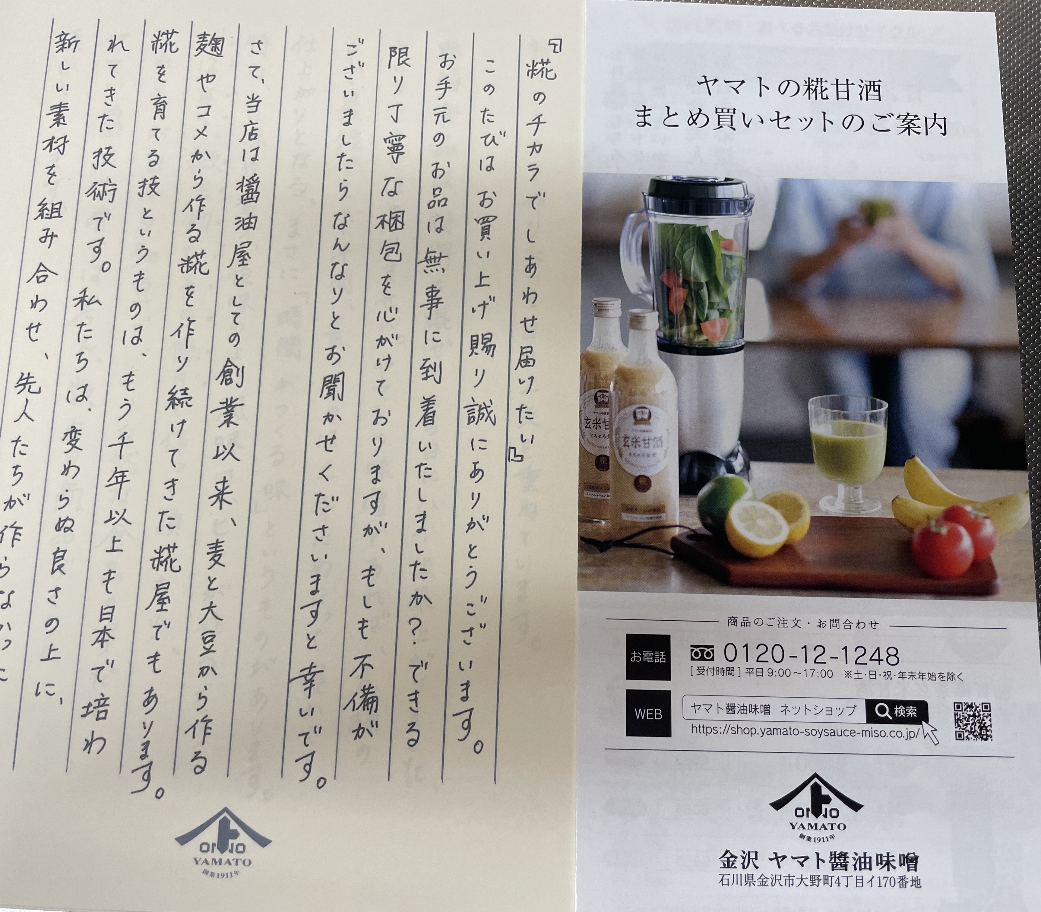中にはヤマト醤油味噌様のこだわりや想いが込められたお手紙や魅力的な商品の案内が入っておりました。
