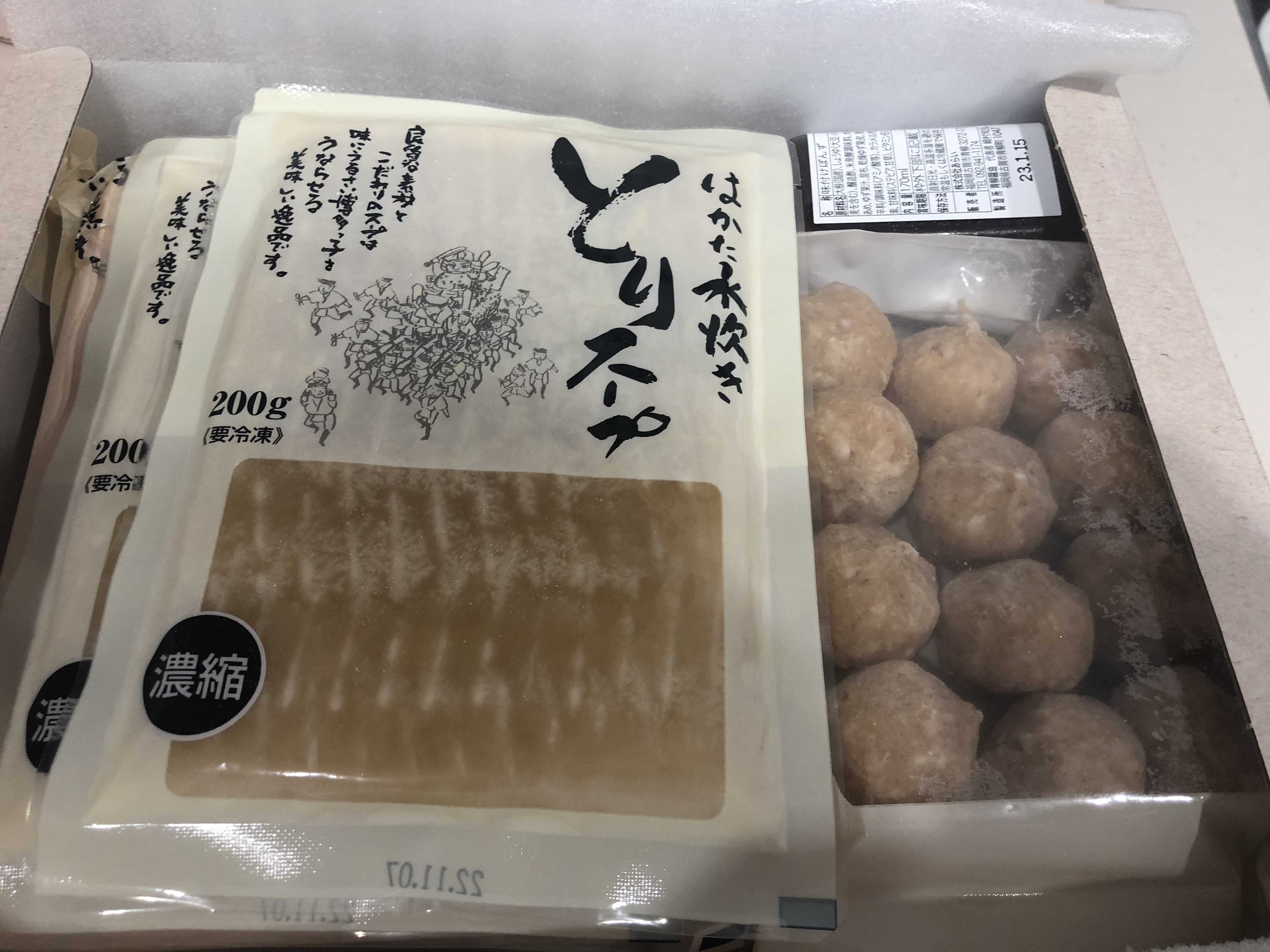 中身は鶏ガラスープ、鶏もも肉、つみれ、おろしポン酢、小冊子がセットになっています。