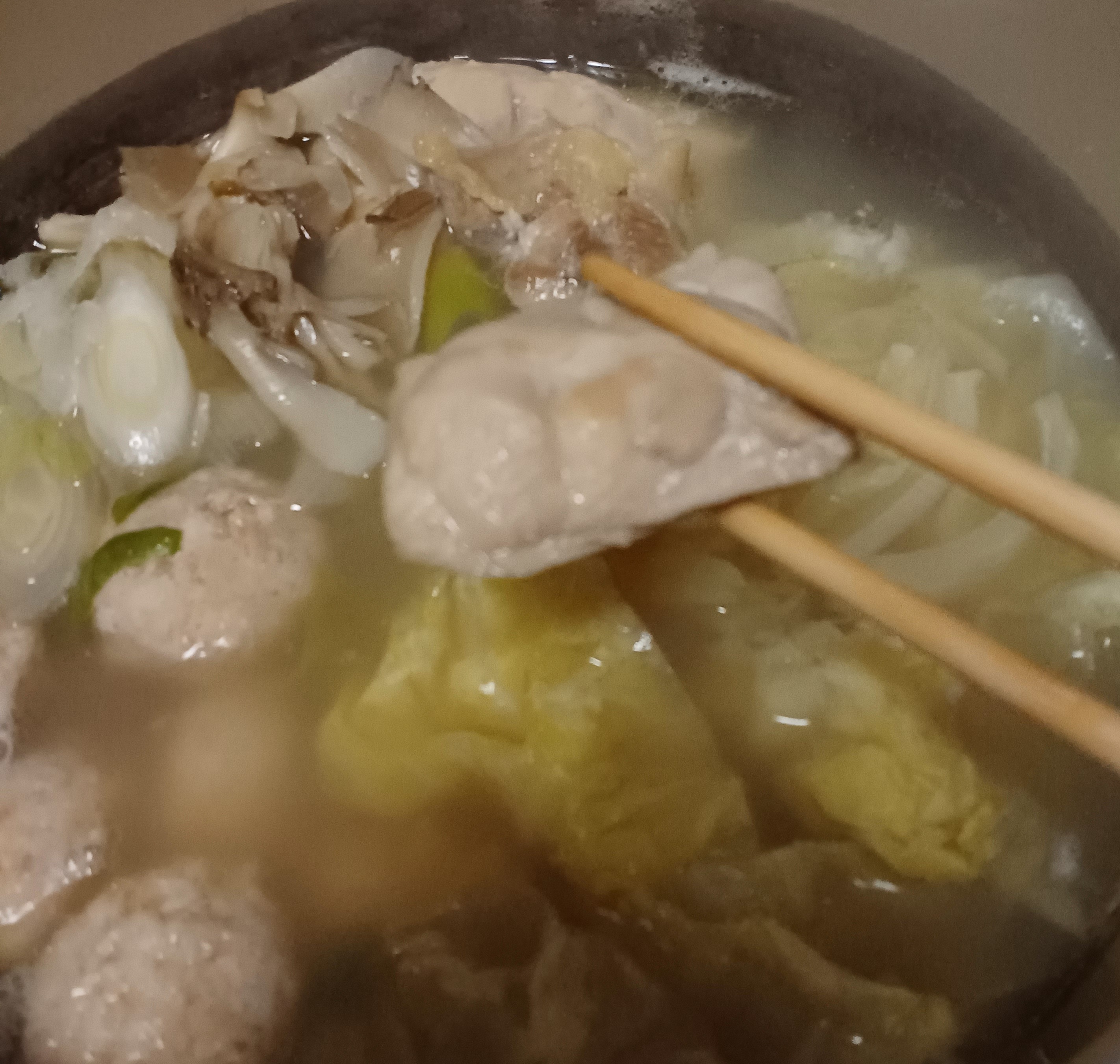 スープを楽しんだ後は湯引きした鶏もも肉、つみれを入れ、煮えたら野菜を投入します。