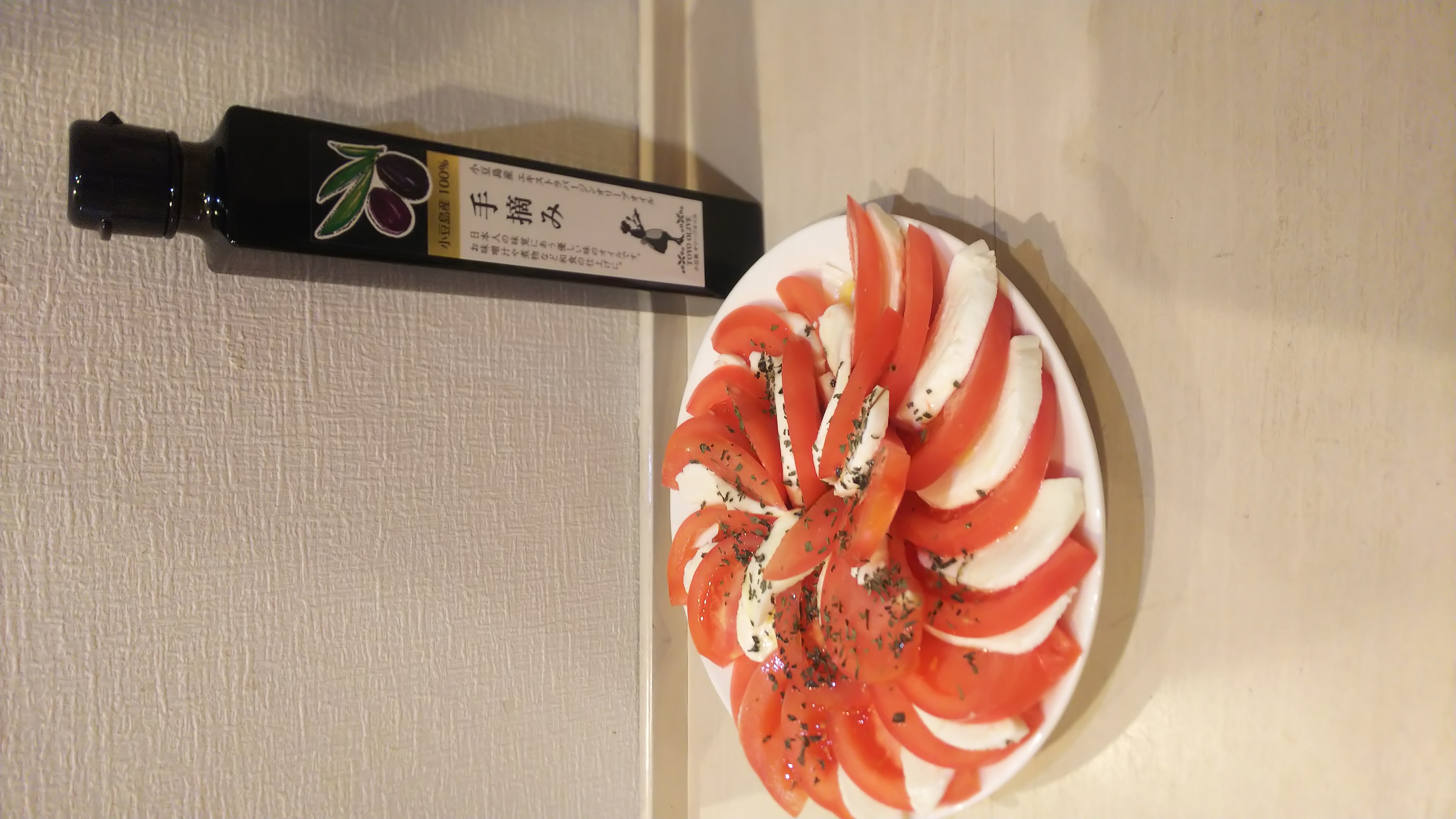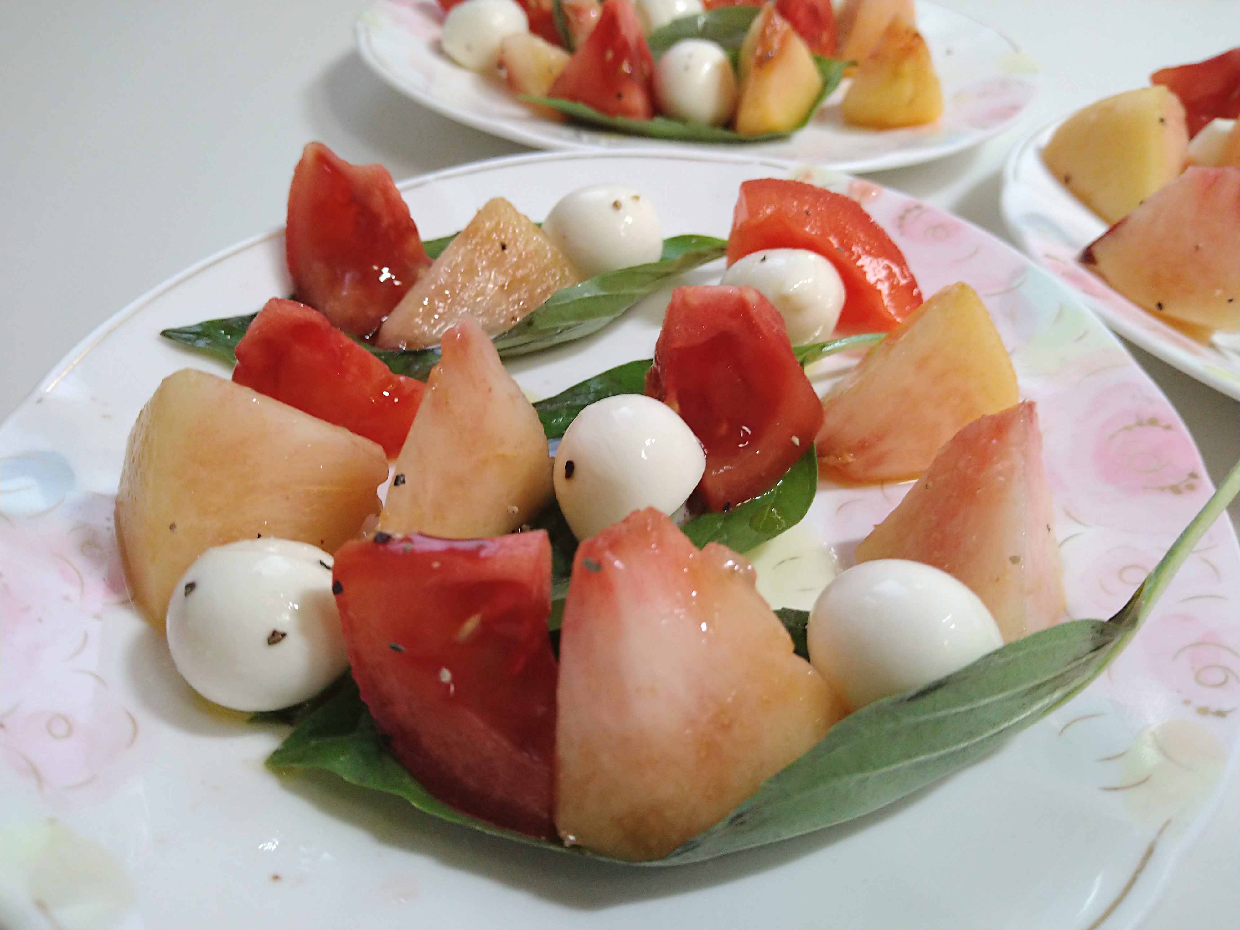 こちらは、桃、トマト、モッツァレラチーズ、バジル、オリーブオイルと塩少々のみですので、オリーブオイルが要になっています。