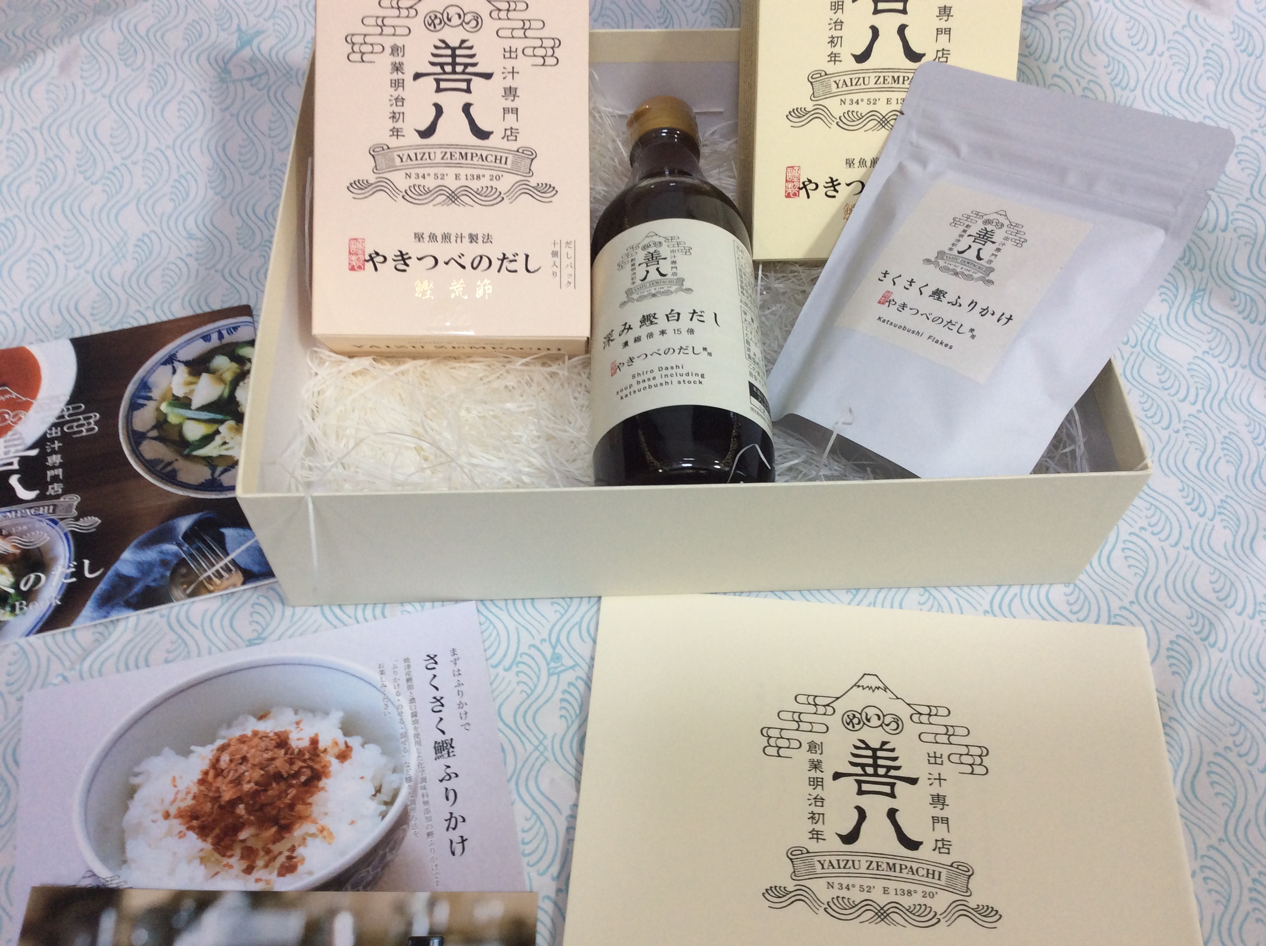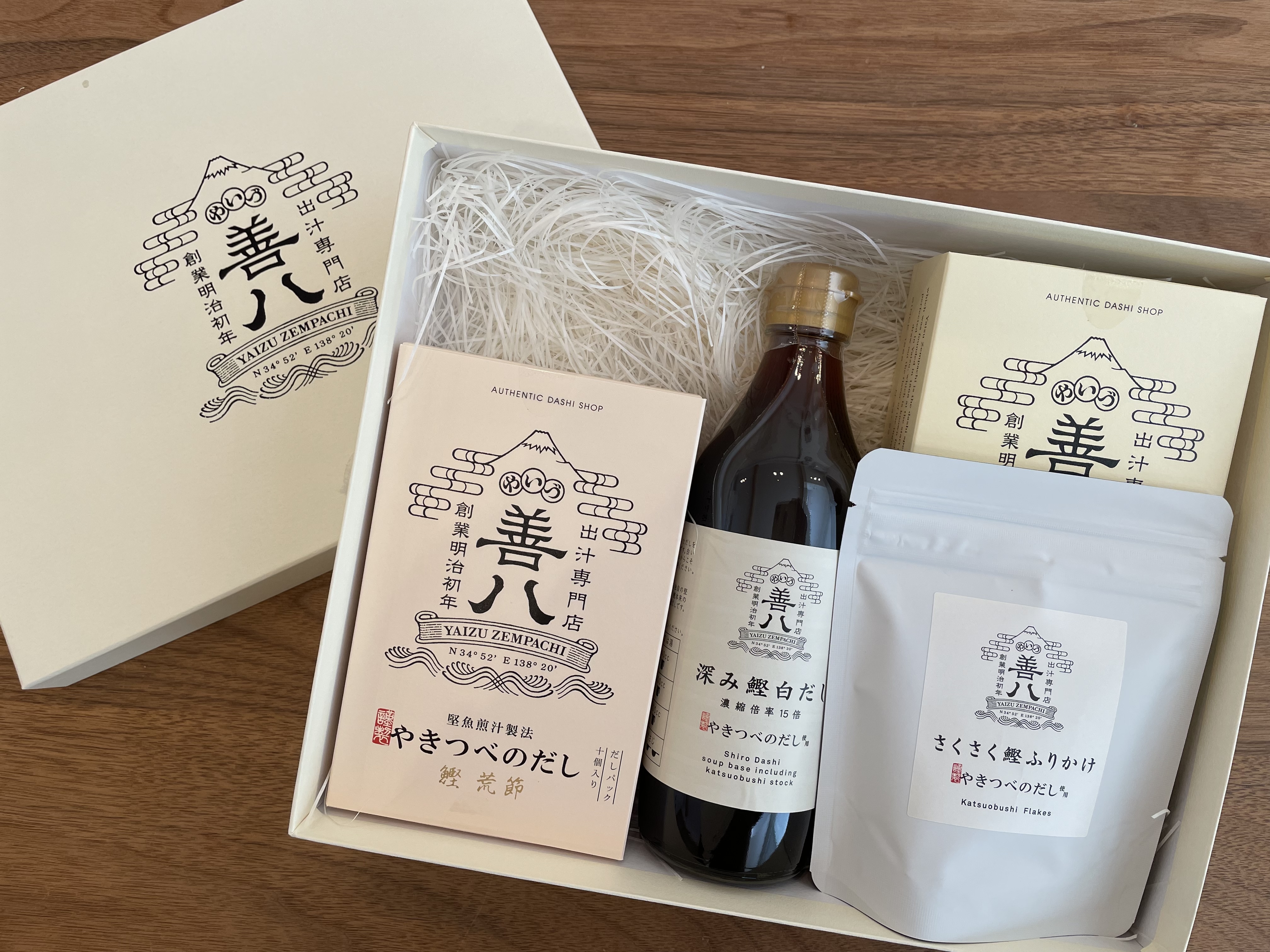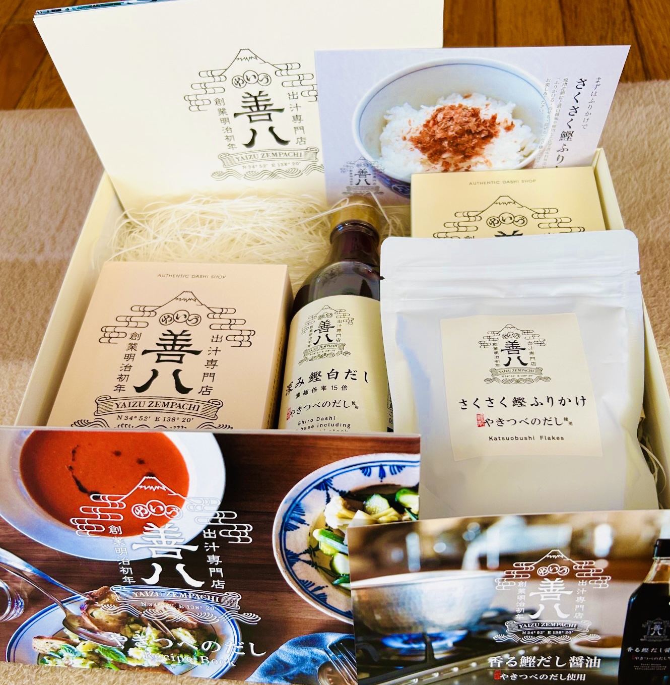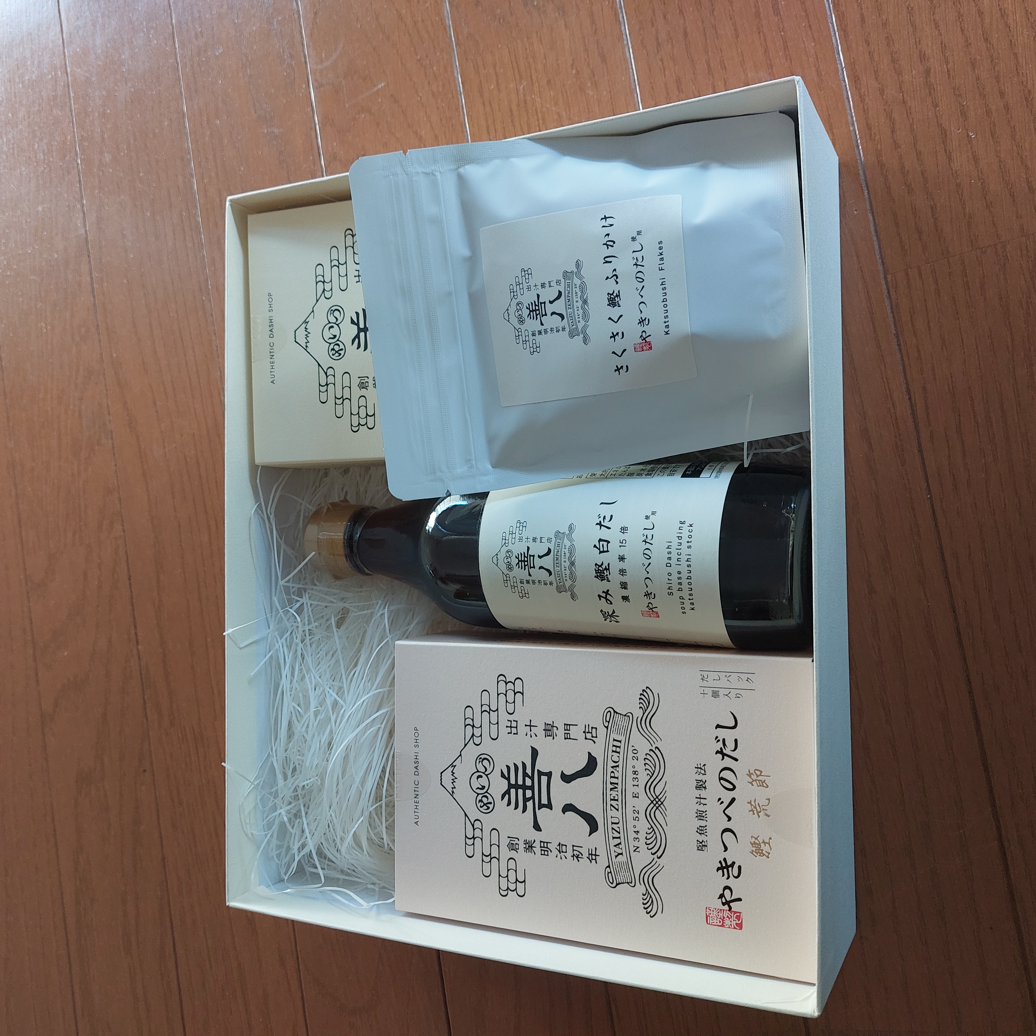 やいづ善八の、やきつべのだし10個入り(鰹 荒節、鰹 枯節)、さくさく鰹ふりかけ、深み鰹白だしを詰め合わせ、やきつべのだしレシピブック付きです。分かりやすくてとても良いです。