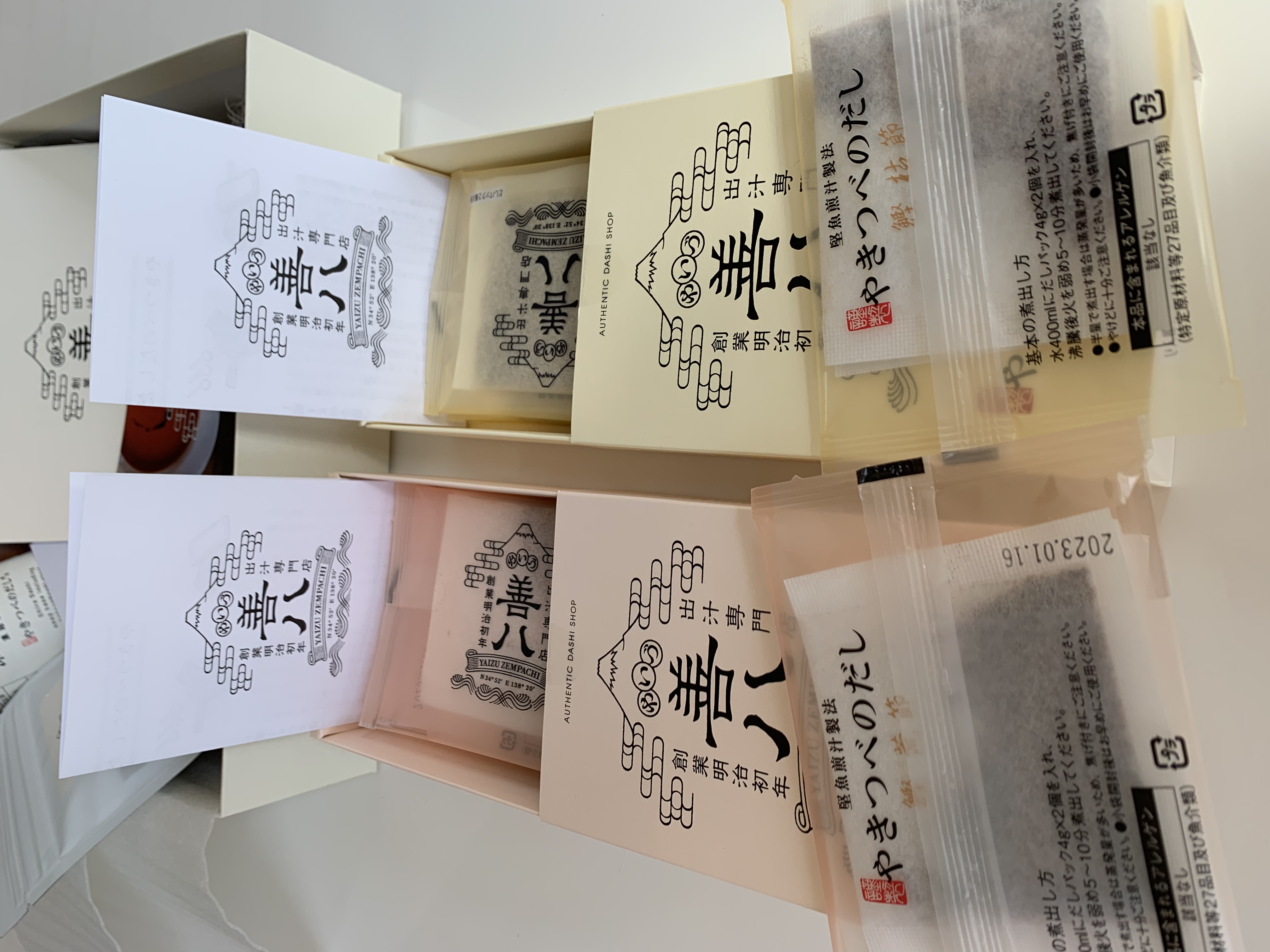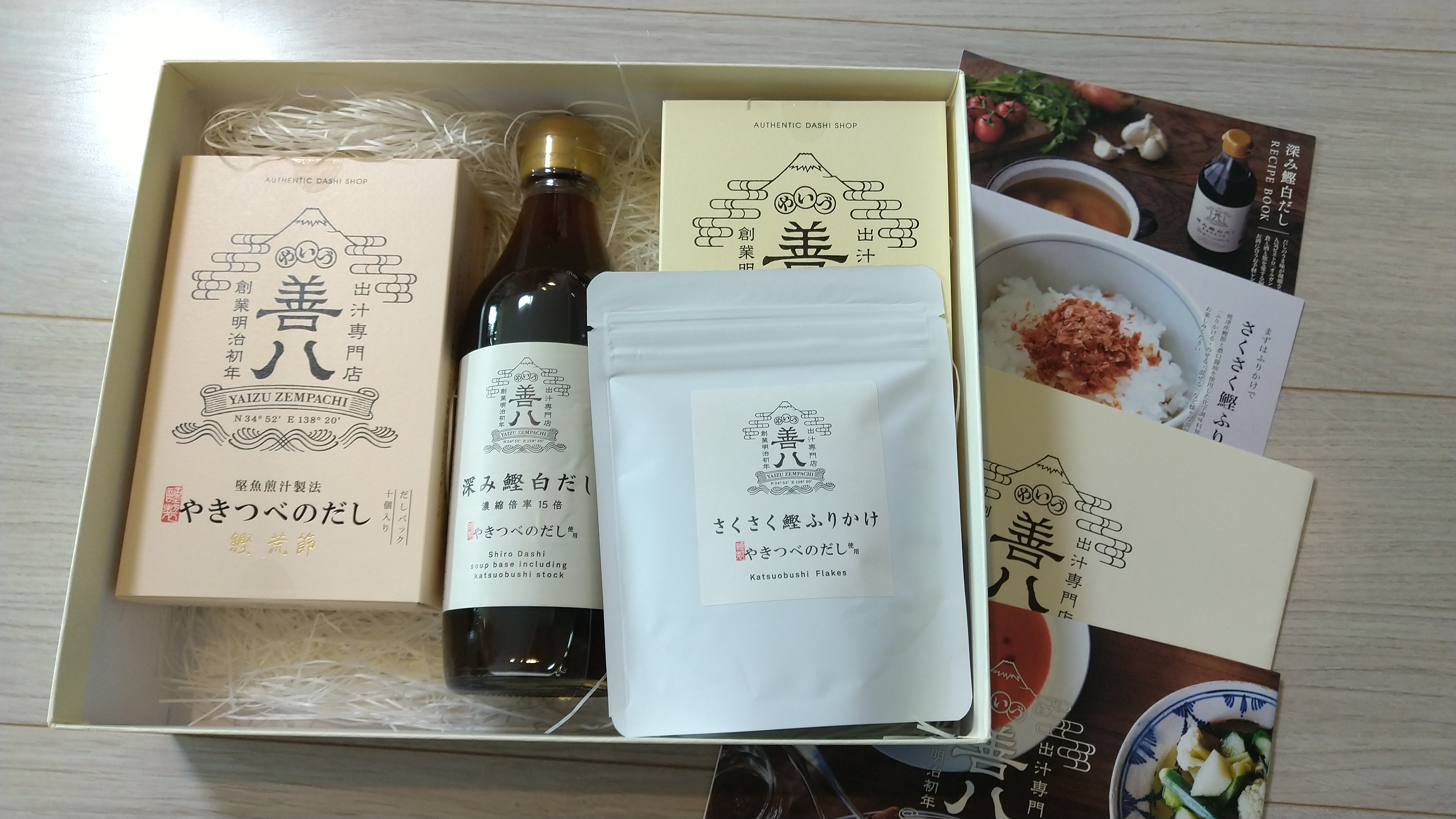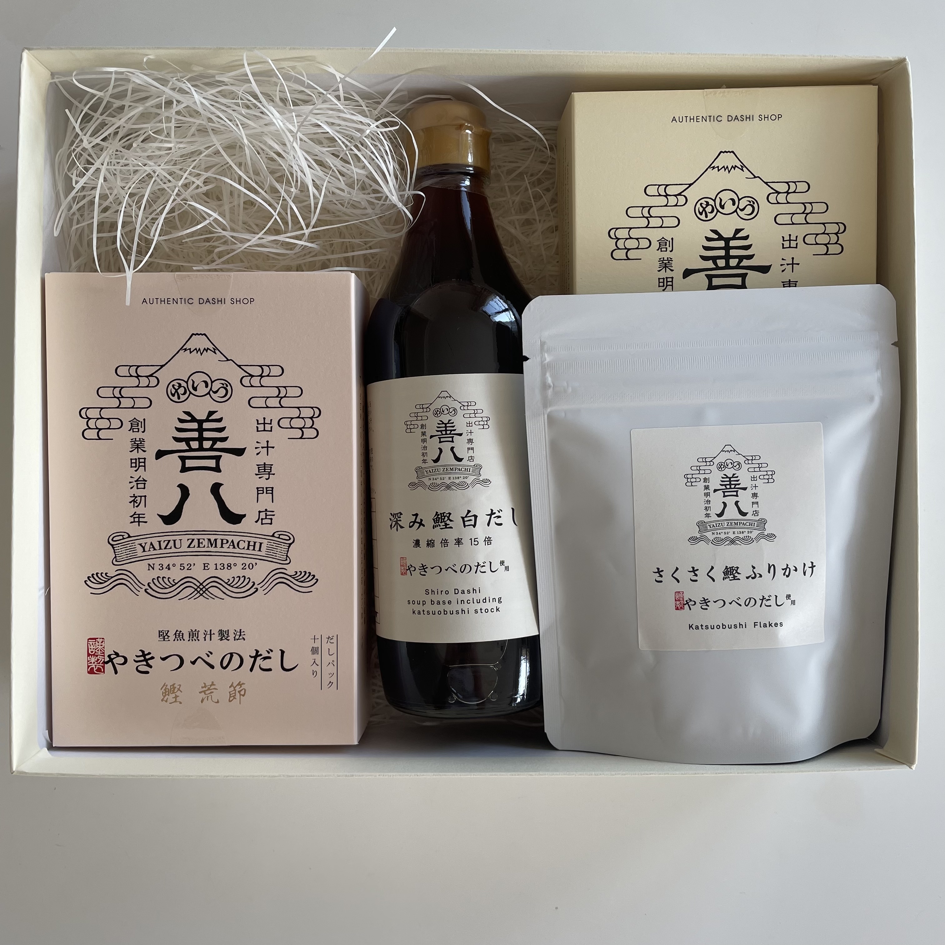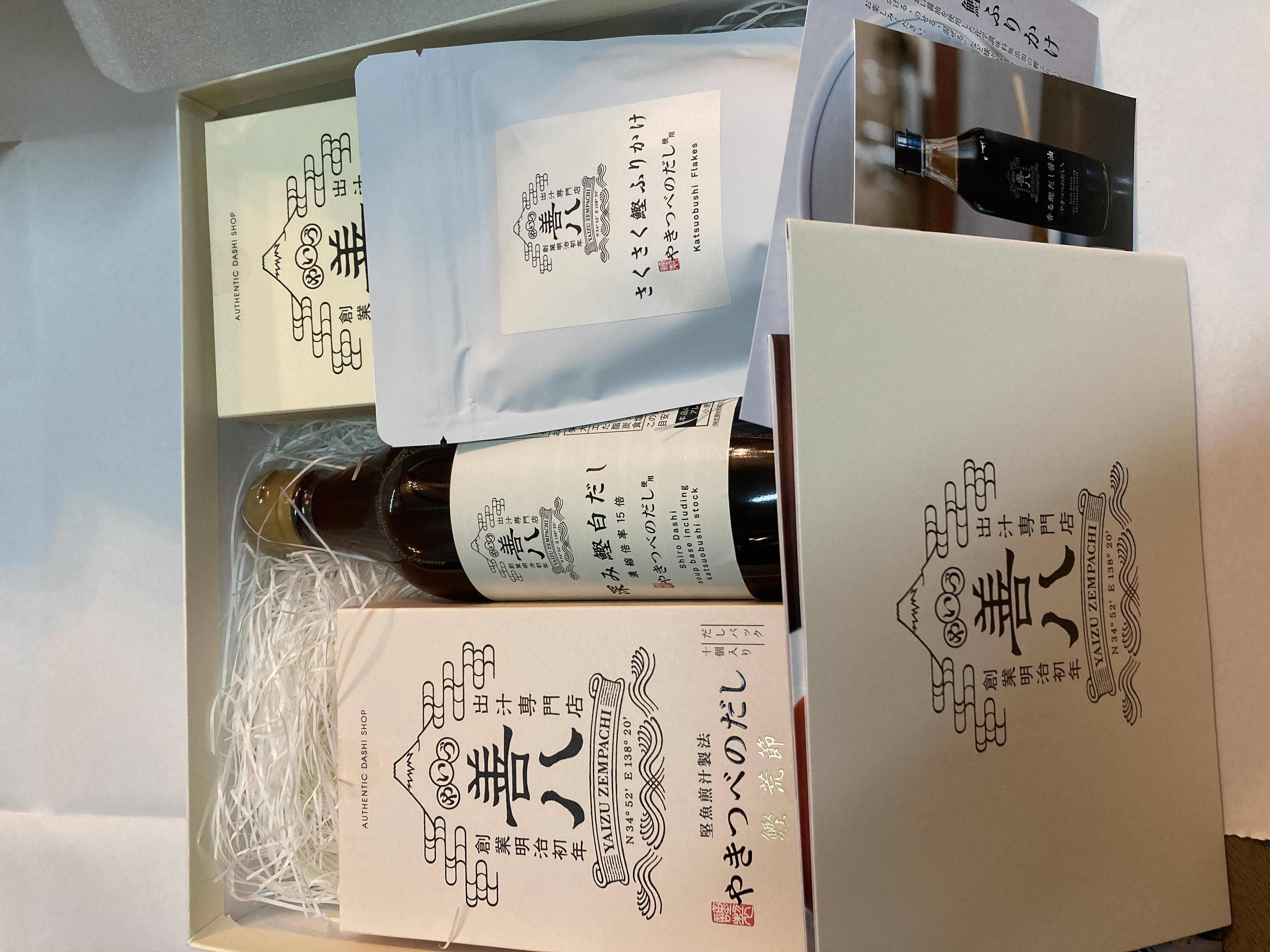 やいづ善八の、やきつべのだし10個入り(鰹 荒節、鰹 枯節)、さくさく鰹ふりかけ、深み鰹白だしを詰め合わせ、やきつべのだしレシピブック付きです。分かりやすくてとても良いです。