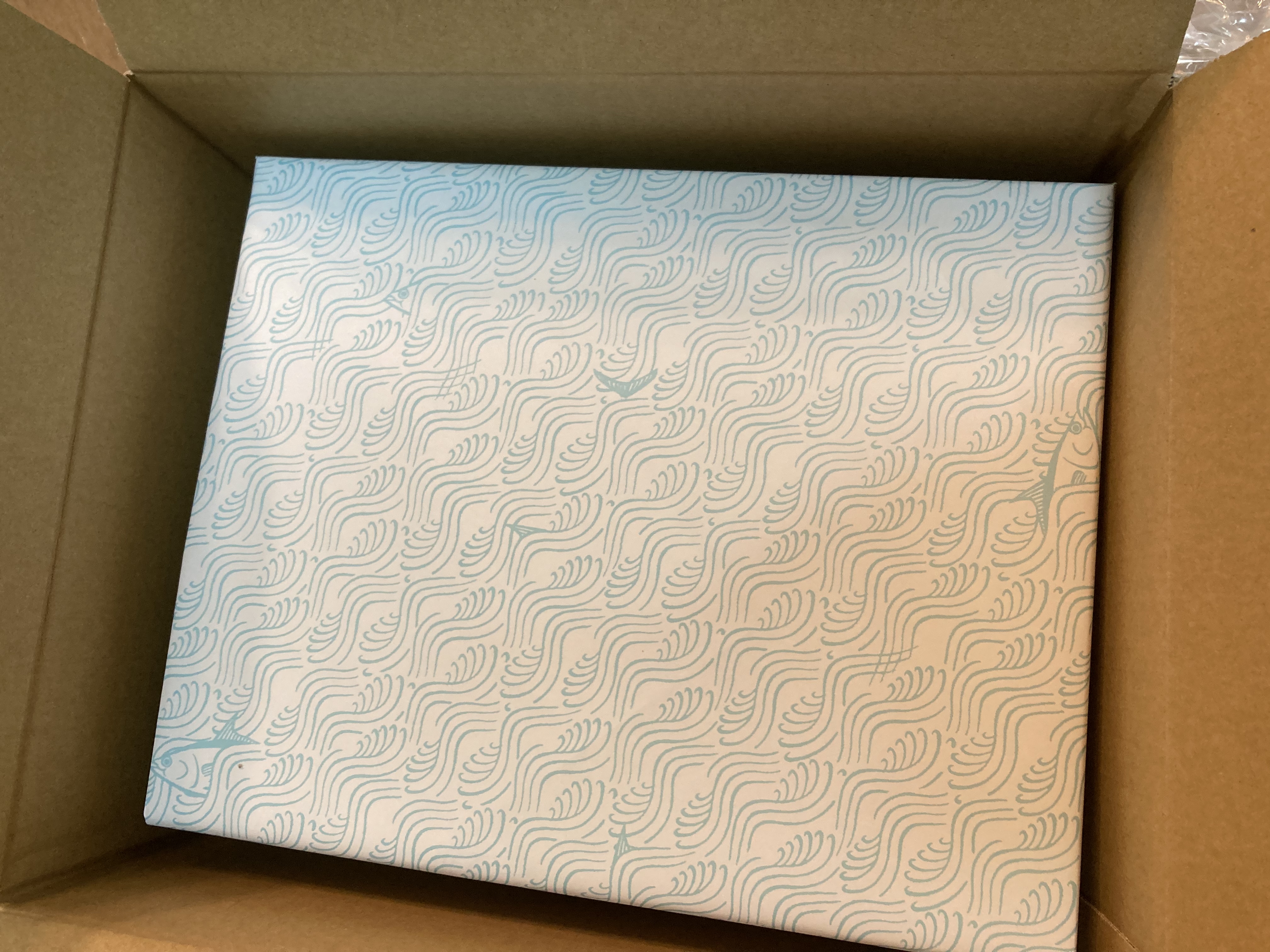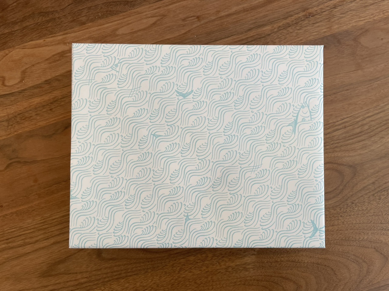 鰹が波の間から顔や尻尾を出しているオリジナル柄の包装紙を使用し、熨斗掛けや名入れも可能です。