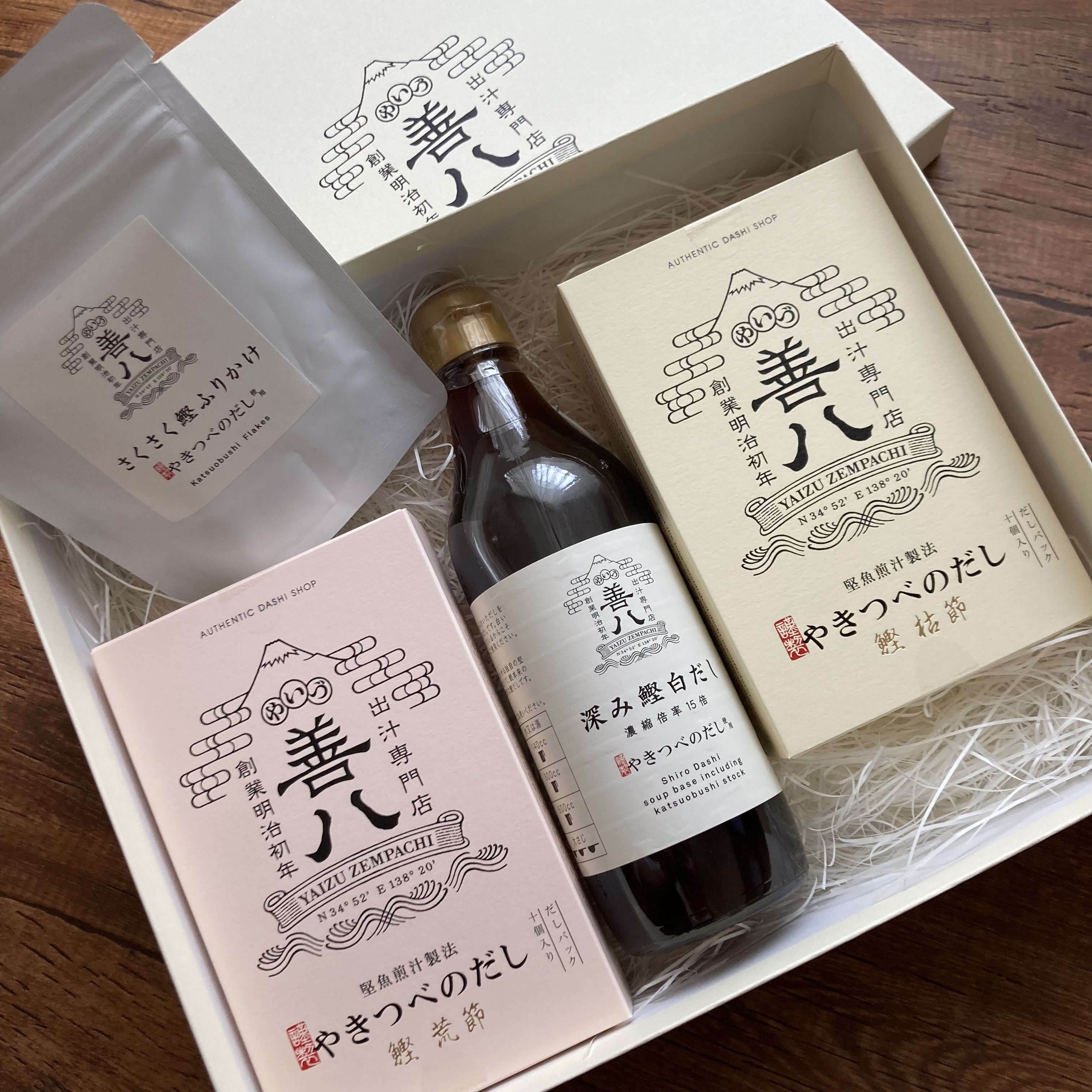 「だしパック」、「ふりかけ」、「白だし」が入った詰め合わせです。焼津の古い呼び名「やきつべ」から名付けられた「やきつべのだし」は、化学調味料・食塩無添加の鰹のだしパック。鰹節の種類が異なる「鰹 荒節」と「鰹 枯節」の2種がセットになっています。さらに軽い食感が特徴の「さくさく鰹ふりかけ」、焼津産鰹節と北海道産真昆布から引いた出汁を使用した化学調味料無添加の白だし「深み鰹白だし」も一緒に入ったギフトセット。化粧箱に入って包装紙で包まれて届くので、お中元や内祝などの贈り物にもおすすめです。