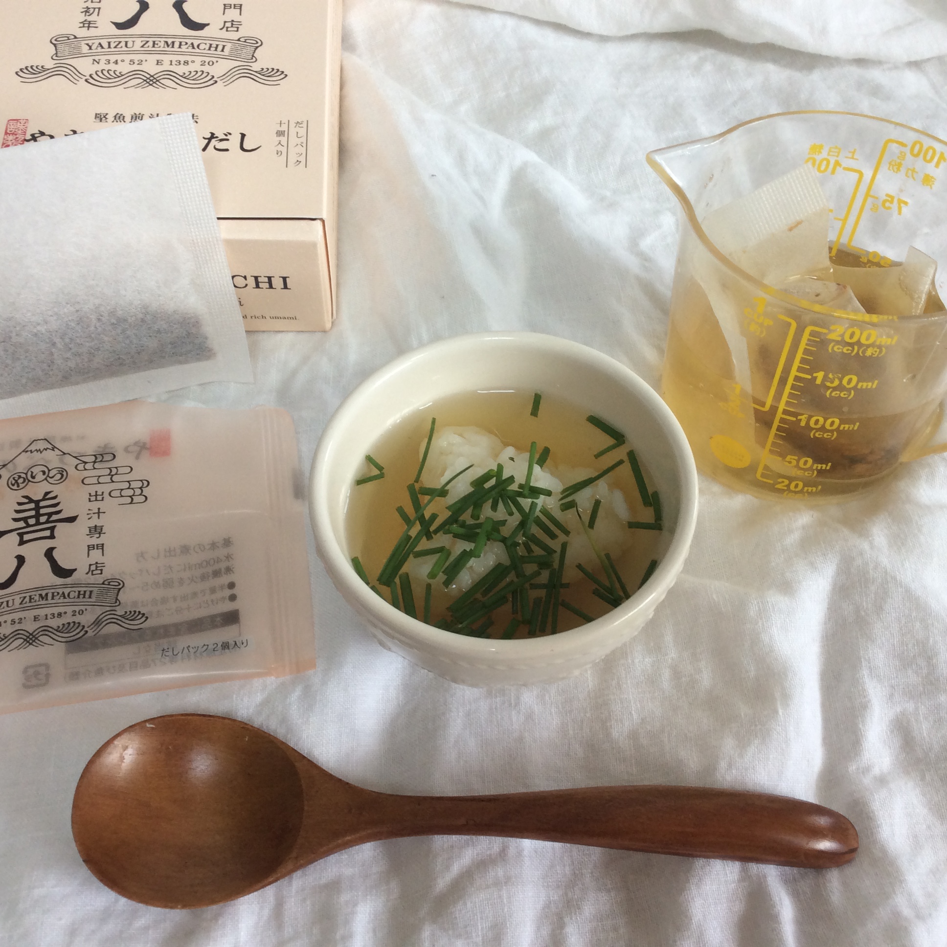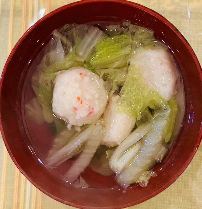 おだしを2袋水から沸騰させ、蟹すみれ、白菜、ねぎを入れ、塩ひとつまみで、薄味のお吸い物にしました。