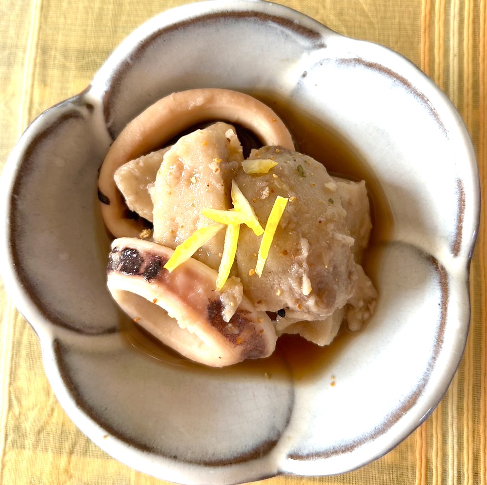 いかからの味があるので、少しの水で、だし1袋を入れ、麺つゆとすりおろし生姜を最後に入れて、七味と柚の皮をのせて完成。
