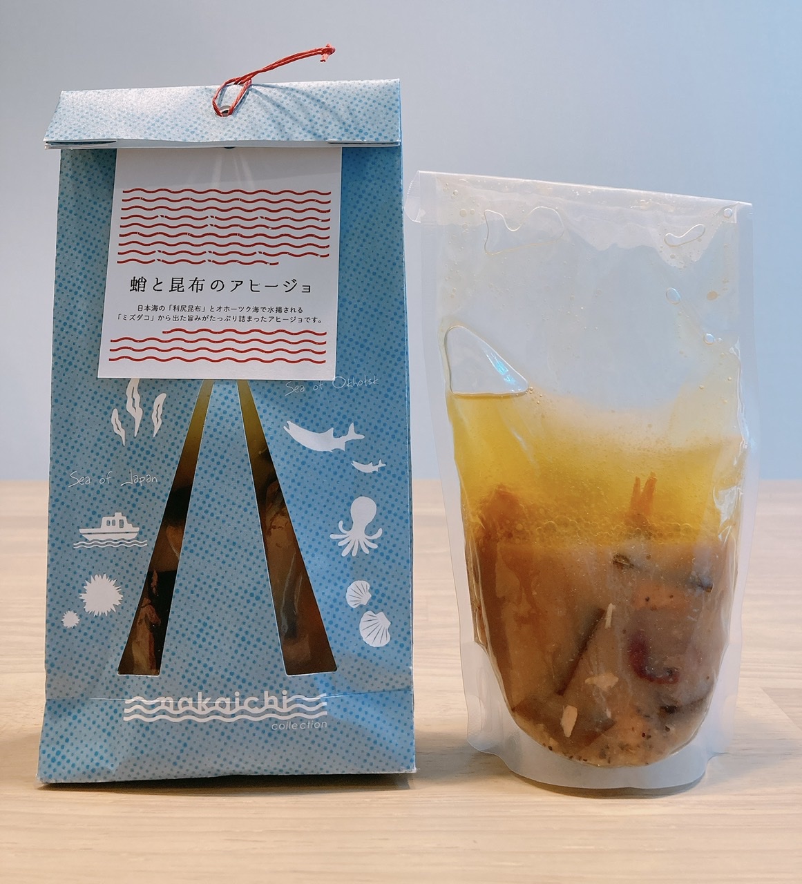 北の海の旨味が凝縮した「アヒージョ」です。アヒージョとは、オリーブオイルとニンニクで食材を煮込む料理のこと。日本海の利尻昆布とオホーツク海で水揚げされたミズダコを使用。魚介からから出たダシの旨み堪能できます。過熱調理済みのためそのまま食べることもできるので、アウトドアにもおすすめ。令和3年度 北海道新技術・新製品開発賞 食品部門 大賞受賞。稚内の海の恵みを自宅で楽しめます。