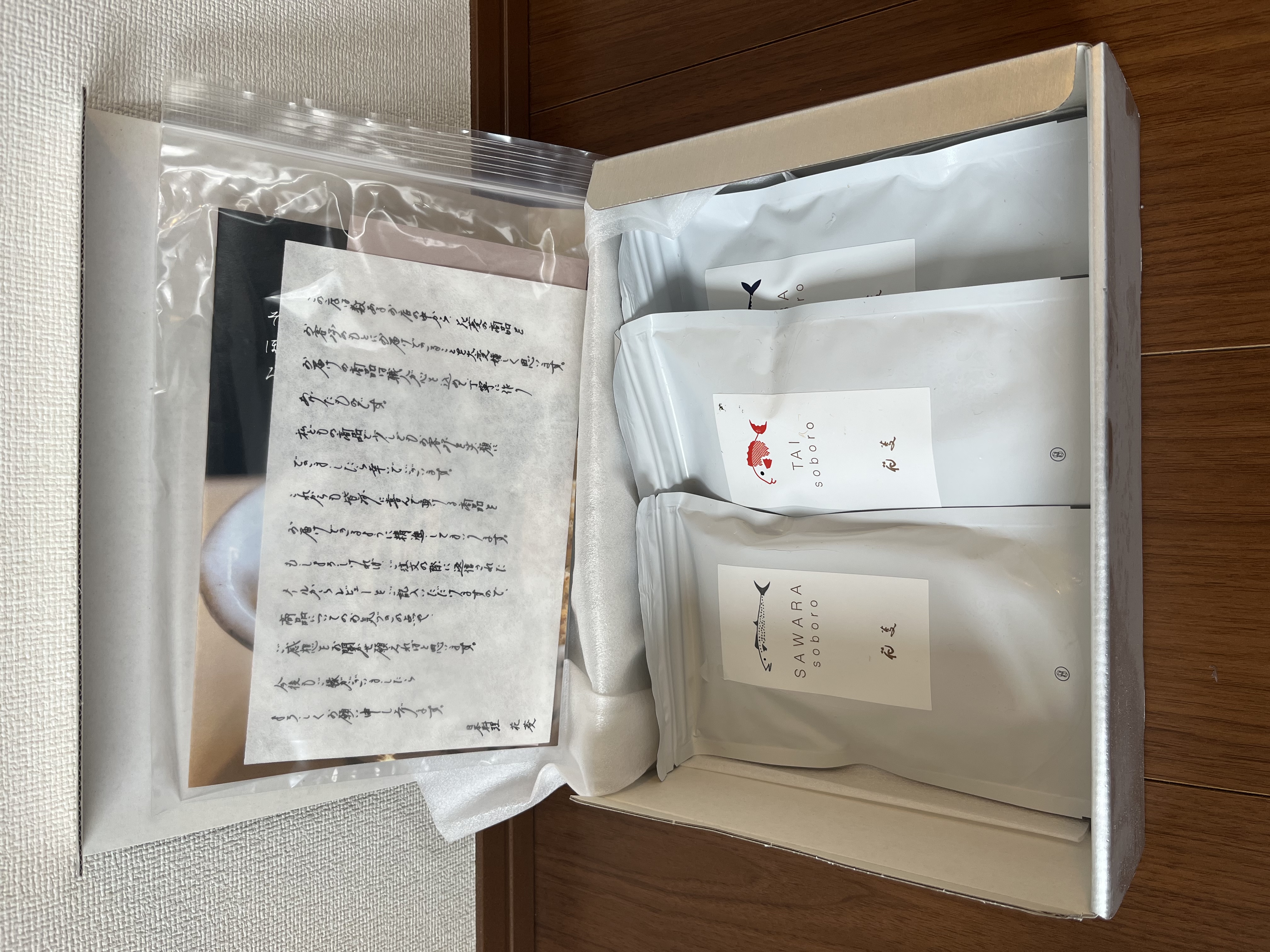 開封すると3種類のそぼろの入ったアルミ製のチャック袋が見えます。