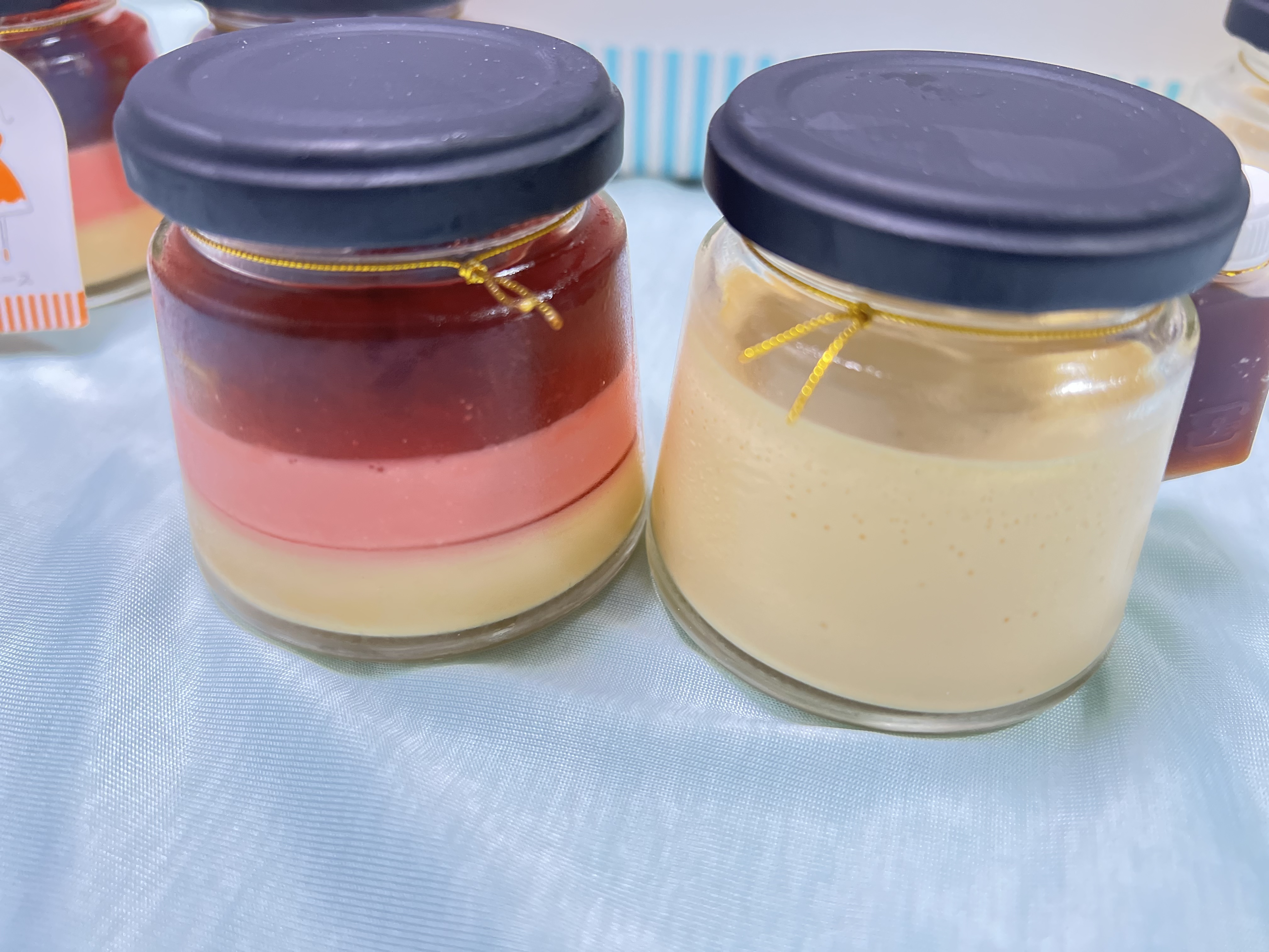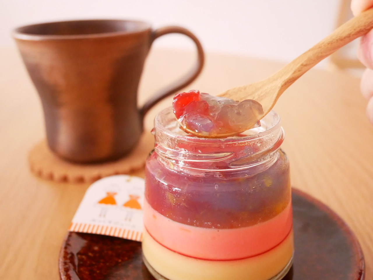 大人気!大阪みっくすジュースプリンは、各層毎に味が異なります。混ぜてお召し上がり頂くと、みっくすジュースのような味わいになり、ジュレの触感も楽しみながら美味しく召し上がれますので、是非豪快に混ぜてくださいね♪