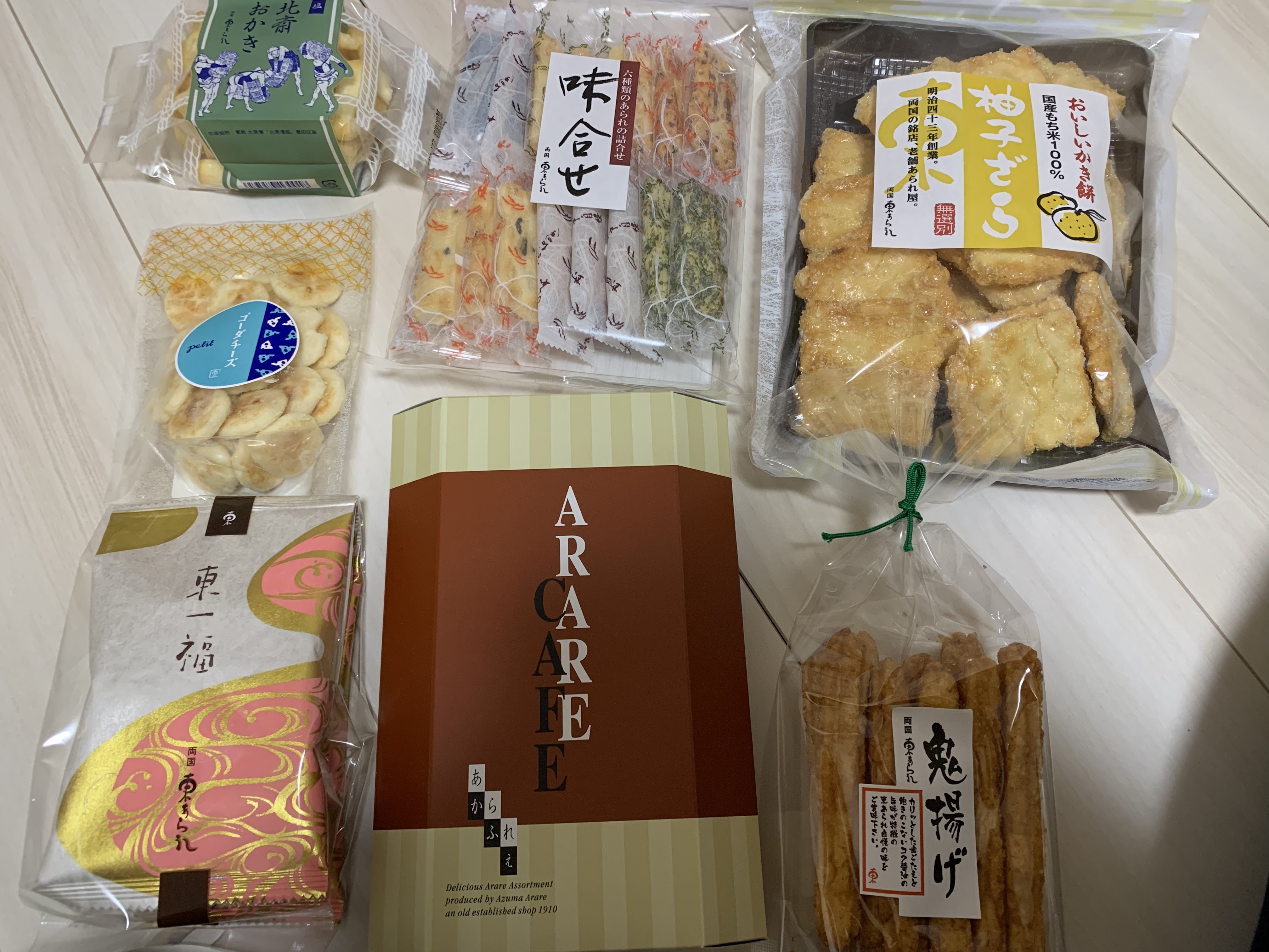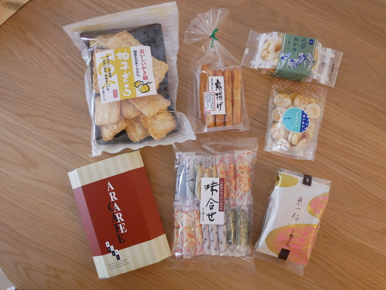 東一福×3袋、味合せ(15本×1袋)、アラレカフェ(7本×1箱)、柚子ざらめ(150g×1袋)、鬼揚げ(13本×1袋)、北斎おかき塩(55g×1袋)、ゴーダチーズ(35g×1袋)