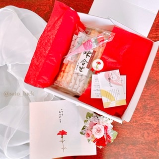 あられは割れやすいお菓子ですが、緩衝材がしっかり使われていて丁寧に届けていただきました。母の日のカーネーションののしがかけられ、造花がつけられていて、ギフトとして素敵な雰囲気でした。