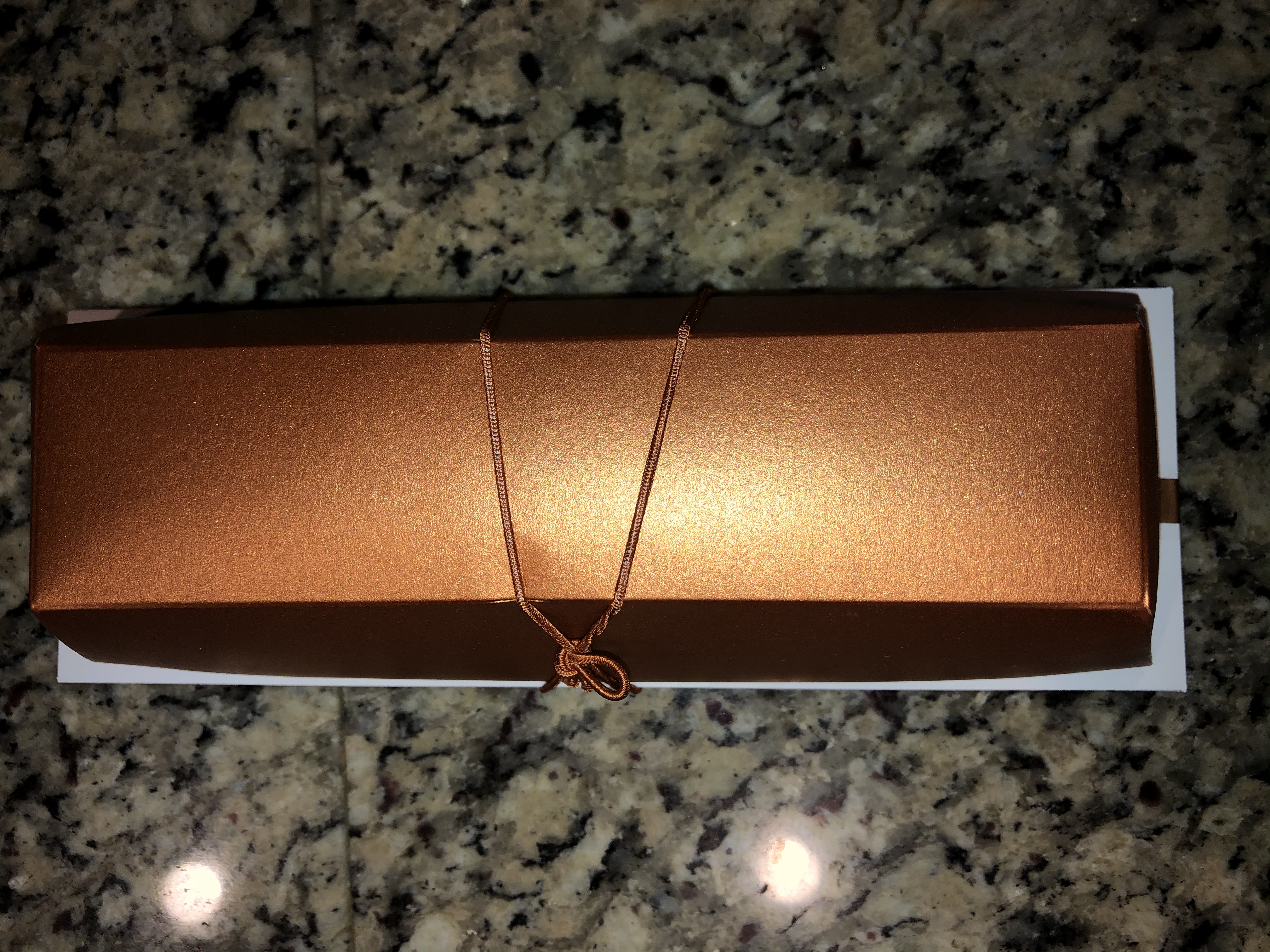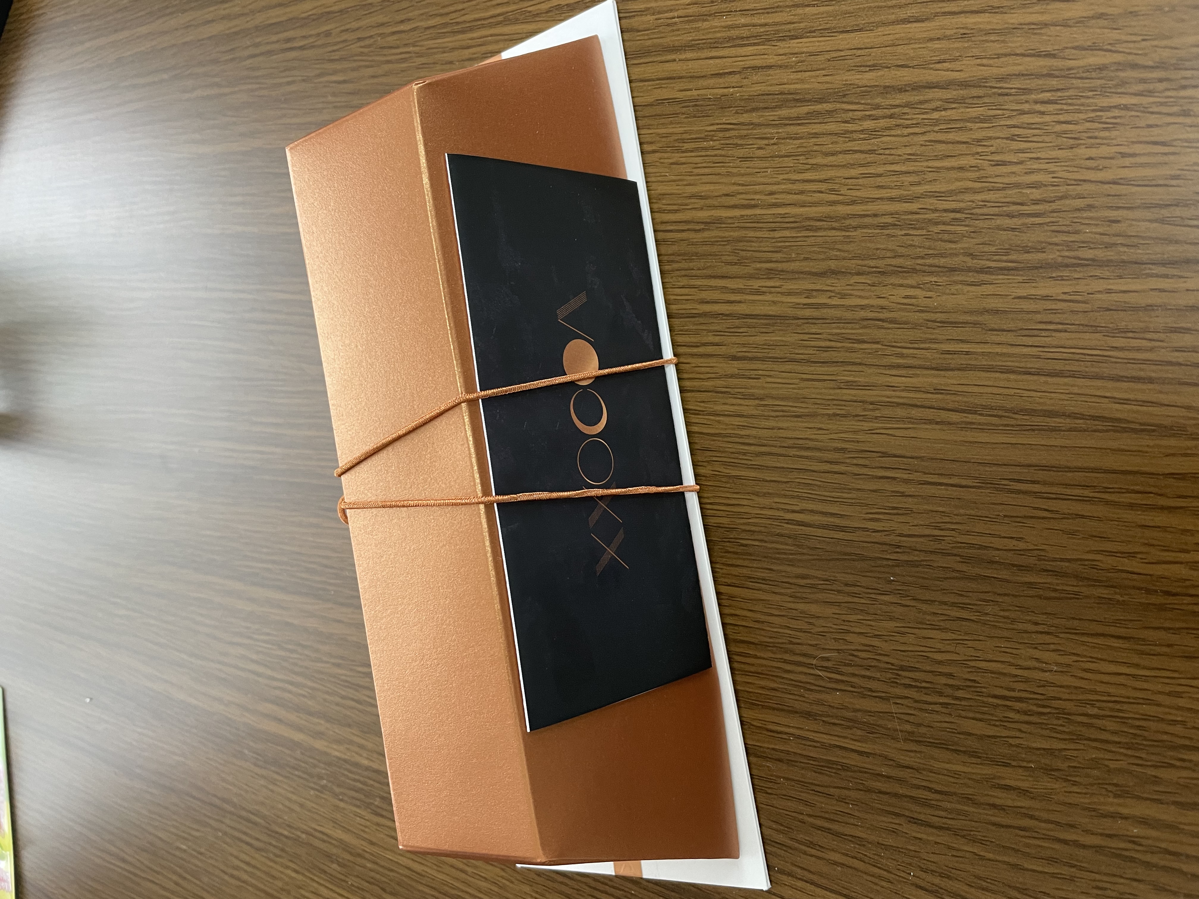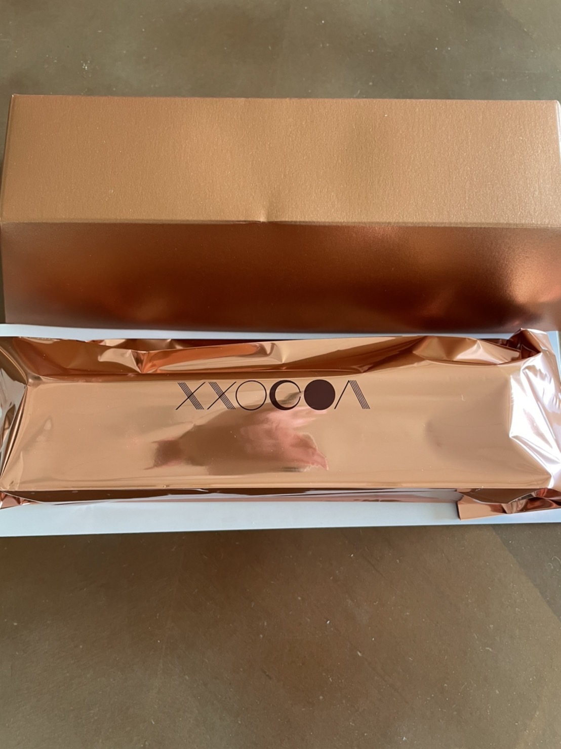 オレンジゴールドの箱がゴージャスで箱を開けるとさらにゴージャスな同色のキラッとした袋に入れられています。袋を開けるとカカオのいい香りが漂います。