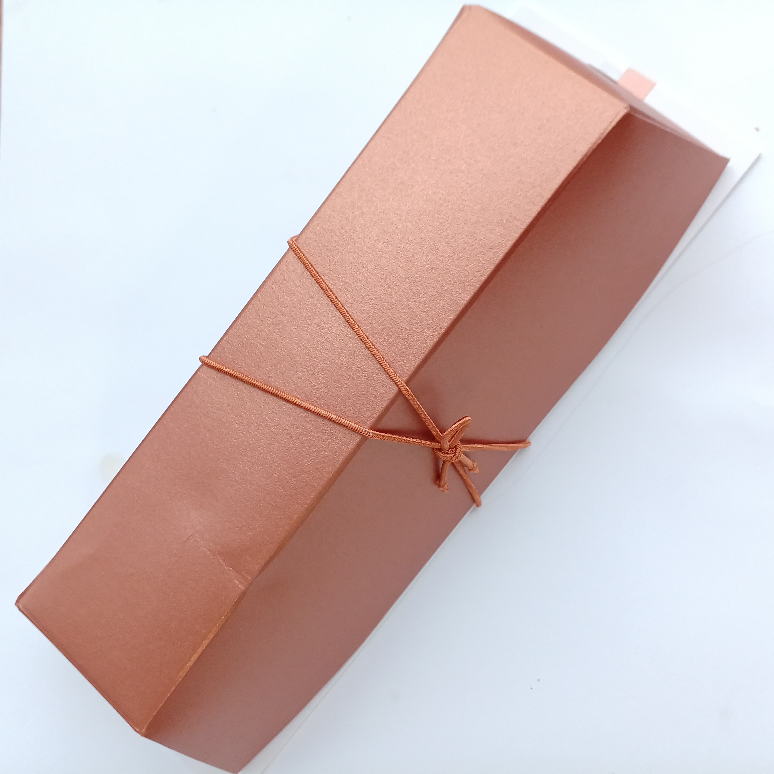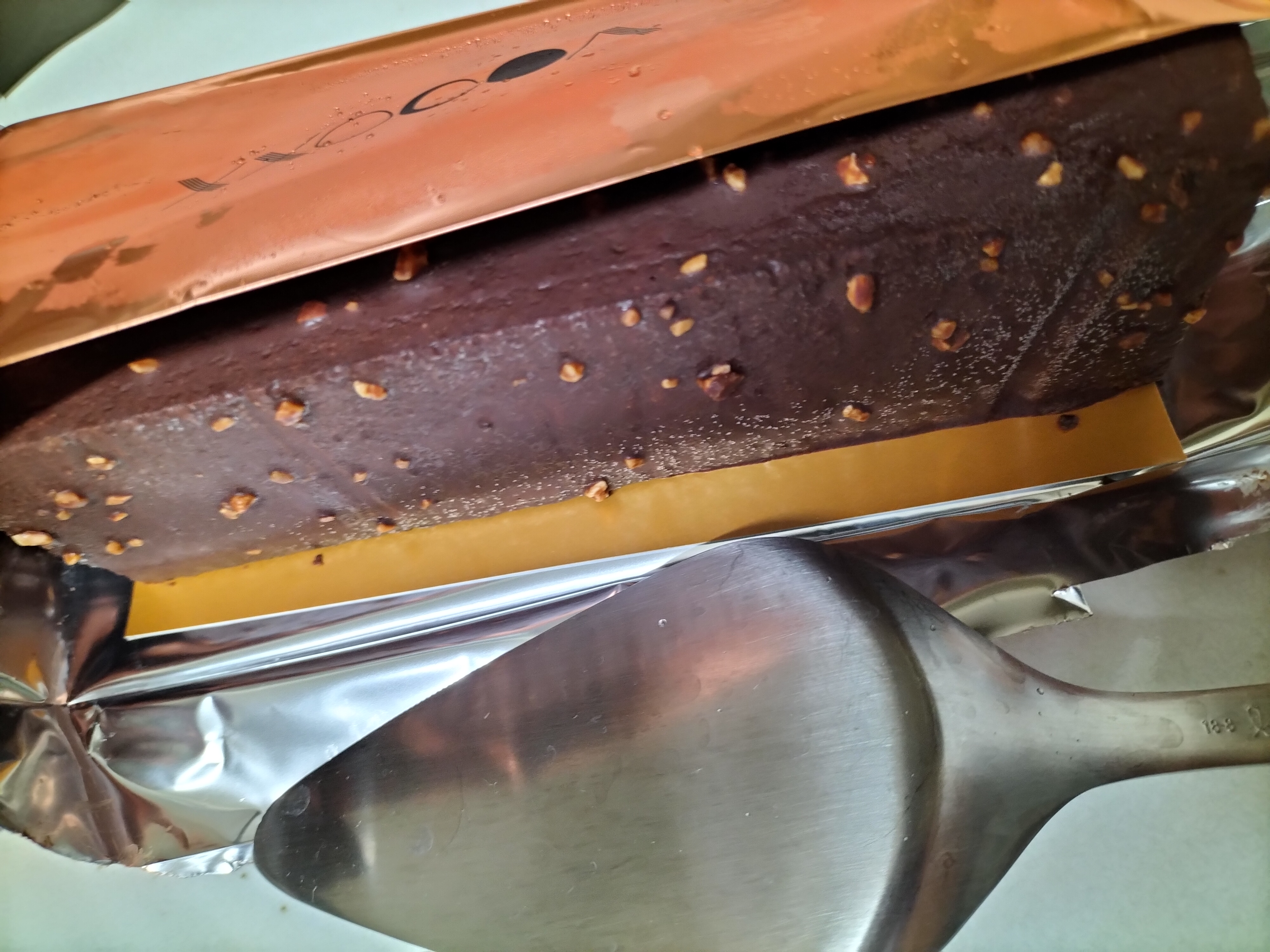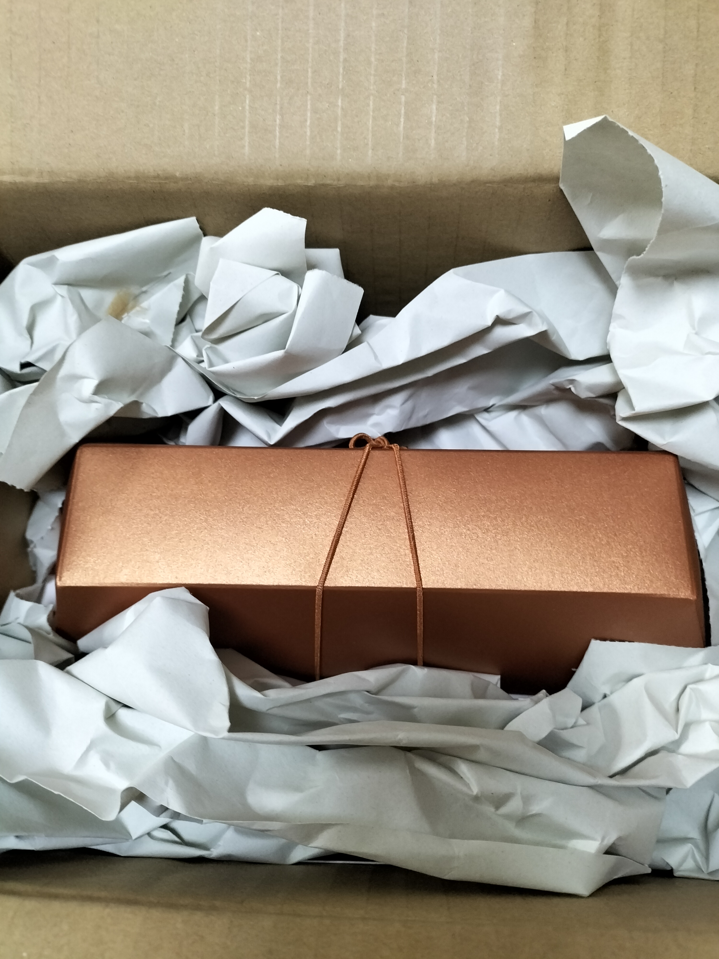オレンジゴールドの箱がゴージャスで箱を開けるとさらにゴージャスな同色のキラッとした袋に入れられています。袋を開けるとカカオのいい香りが漂います。