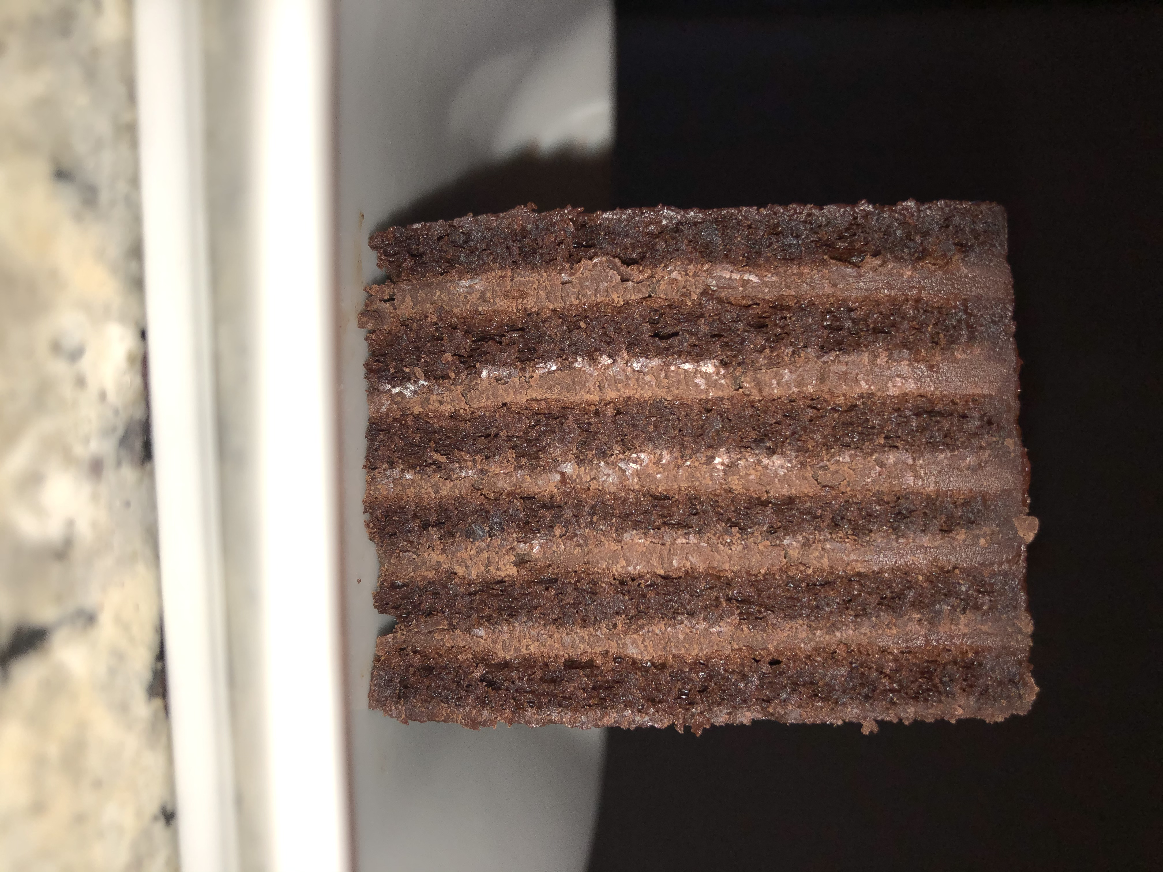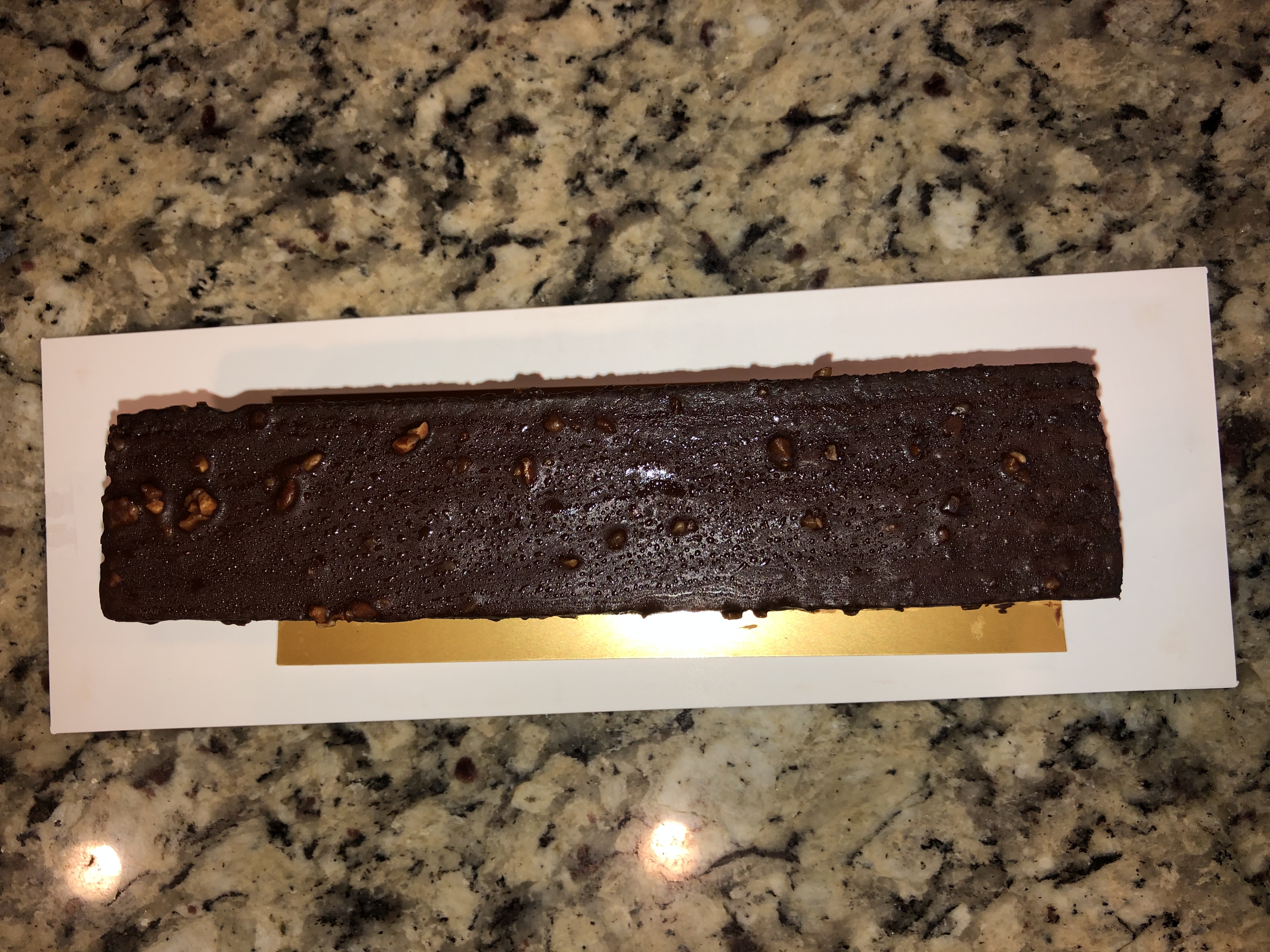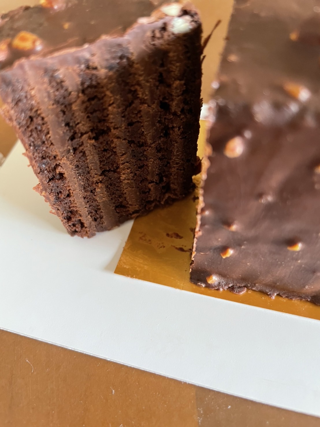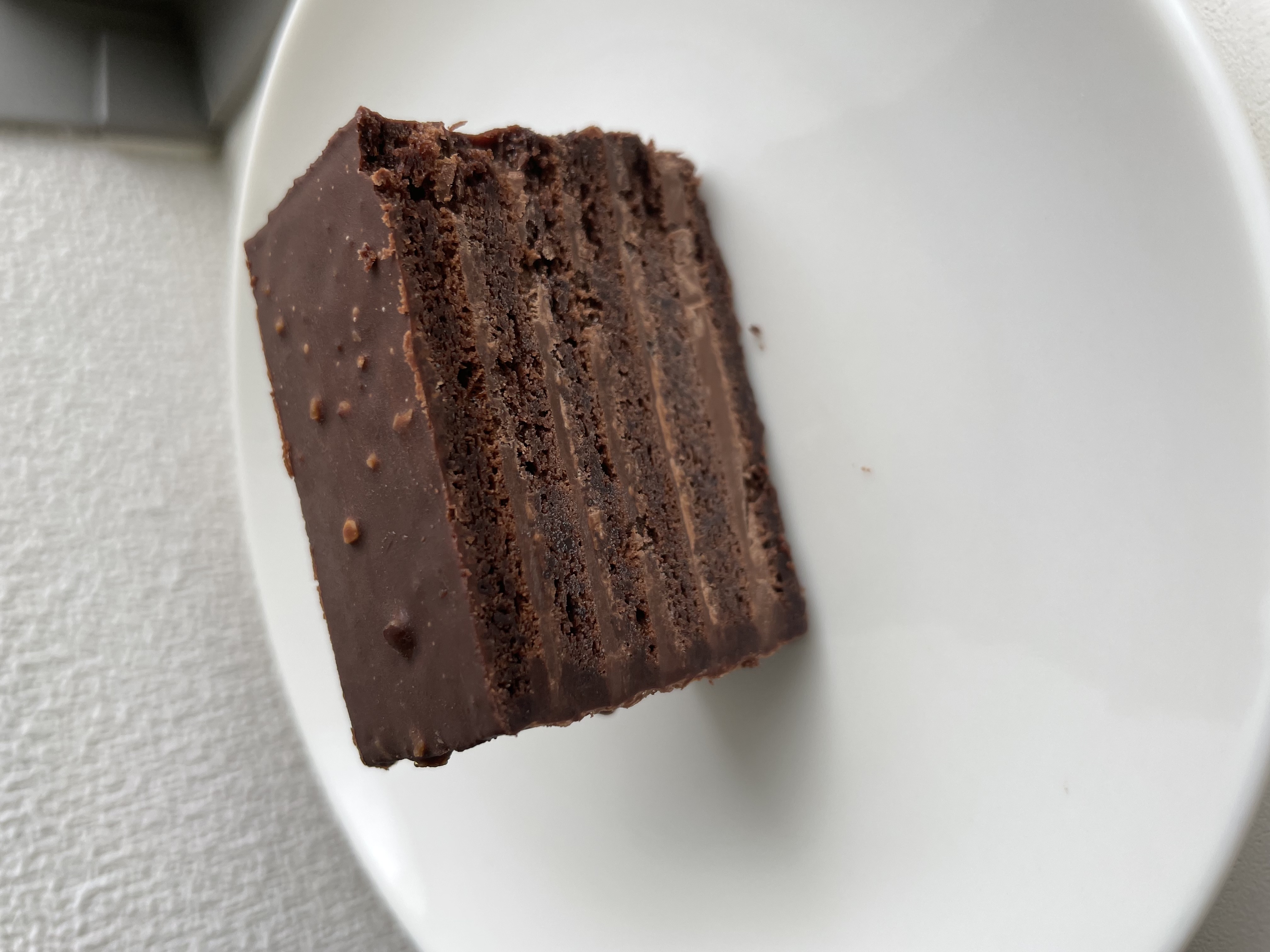 1口食べるとストライプになったガナッシュがふわーっと溶けてとろけました。甘すぎることなく良い素材を使われた味わい深いガトーショコラです。最後に残るナッツの食感がとても良いアクセントになっています。