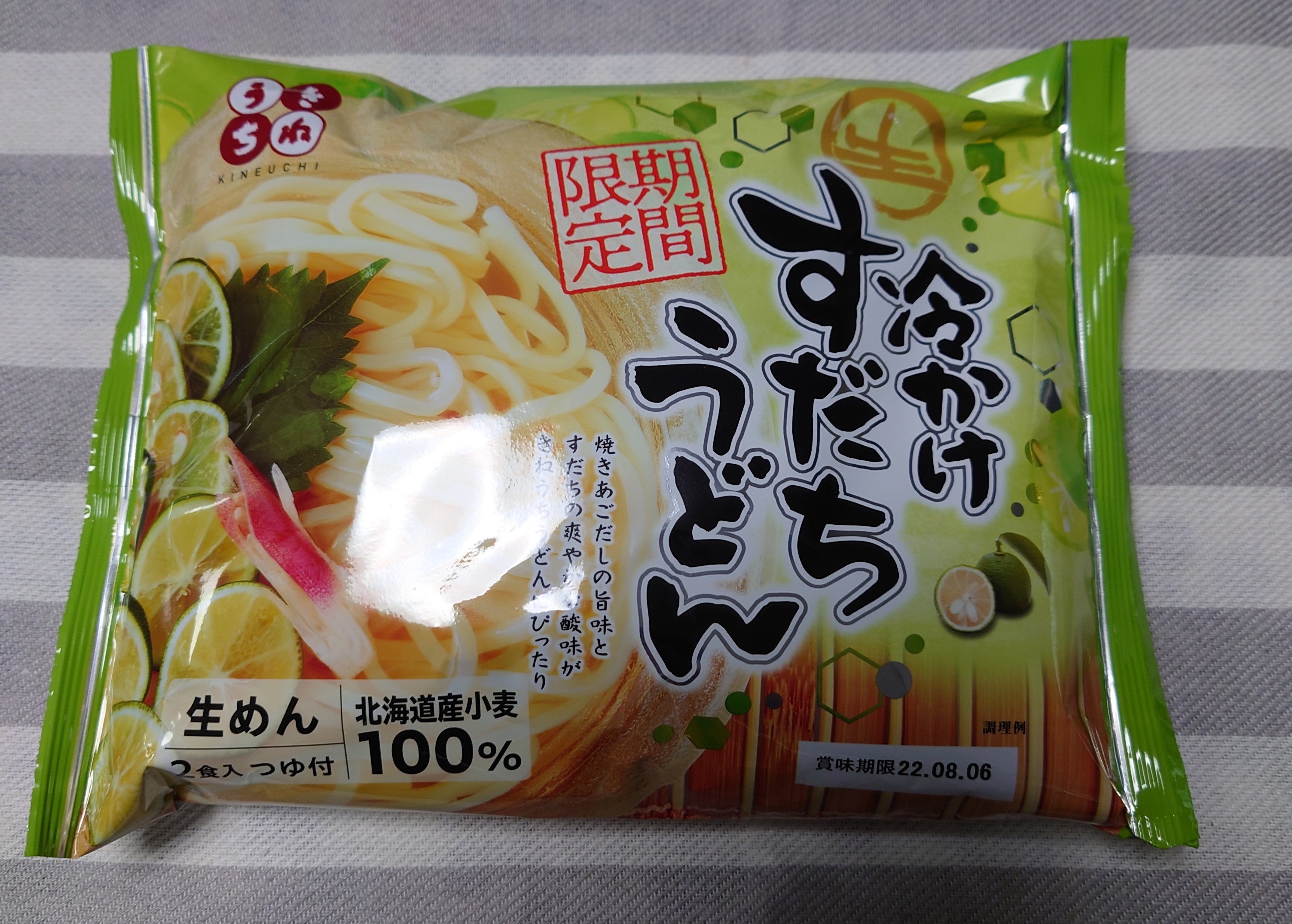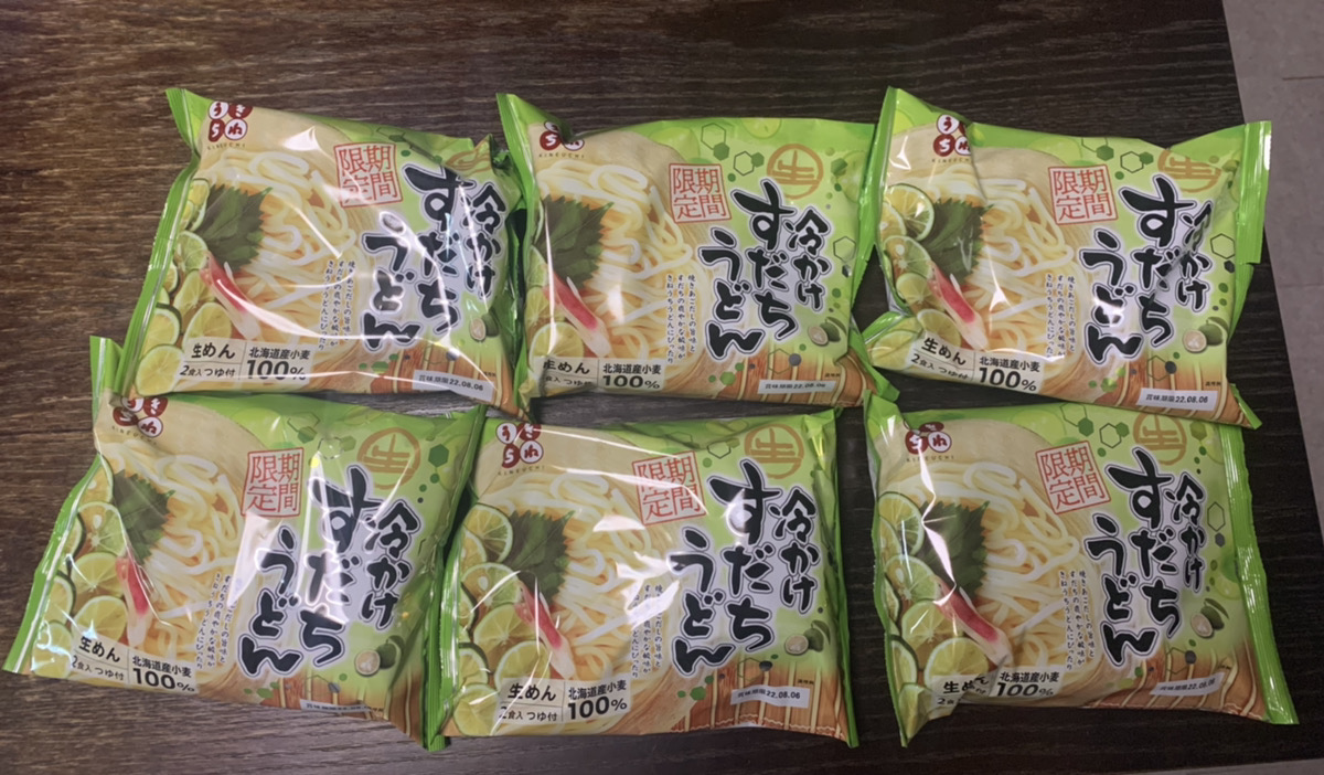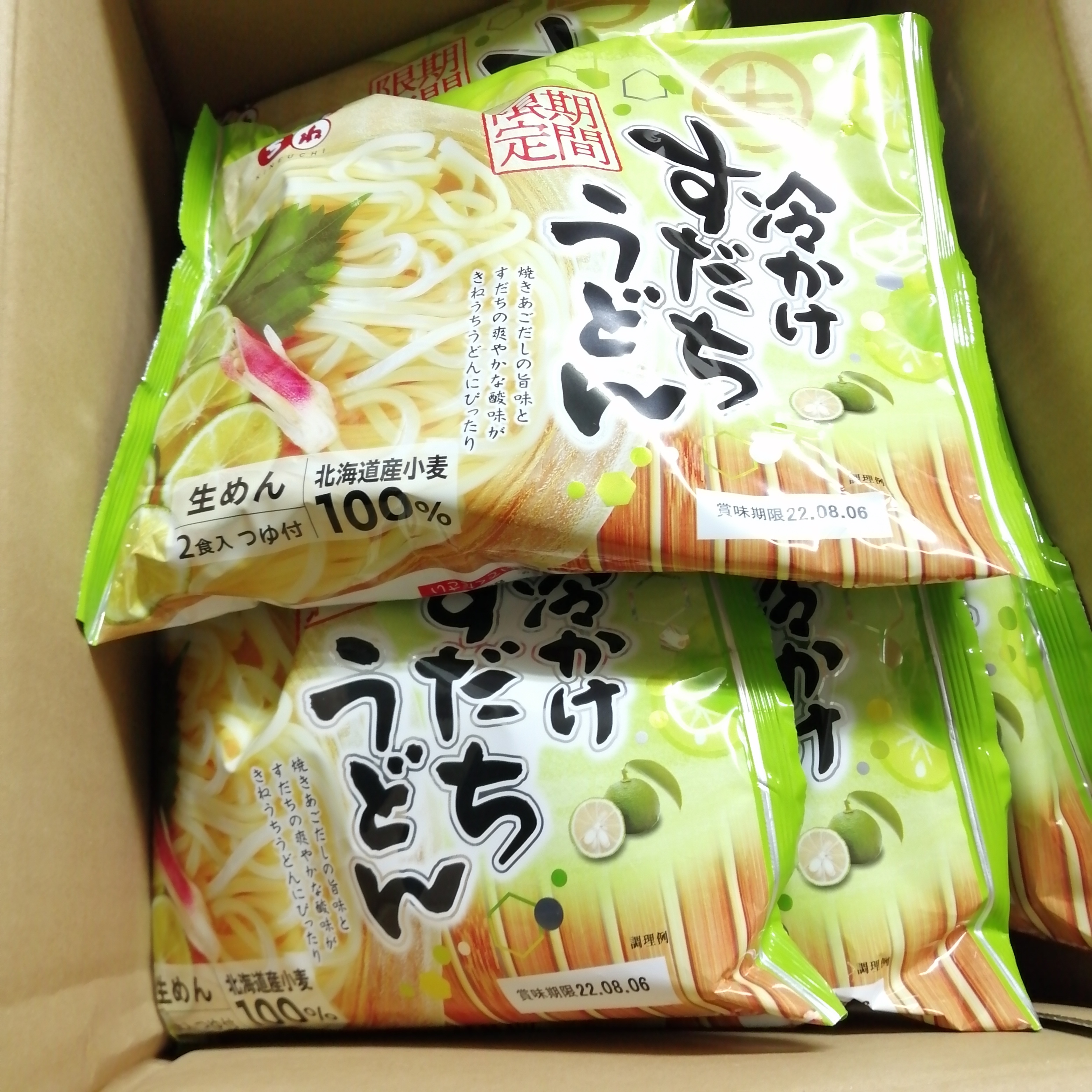 夏の食卓に涼風を呼ぶ冷かけタイプの「すだちうどん」です。焼きあごの出汁にすだちを加え、爽やかな酸味を加えたつゆを、シコシコの歯ごたえとツルツルののど越しを意識した細うどんにかけて楽しむ「かけうどん」です。うどんは、国内生産で北海道産小麦粉を使用しています。さっぱりした味わいの麺なので夏の麺のラインアップに加わる一品。90日間常温保存可能なのでストック食材としても便利です。