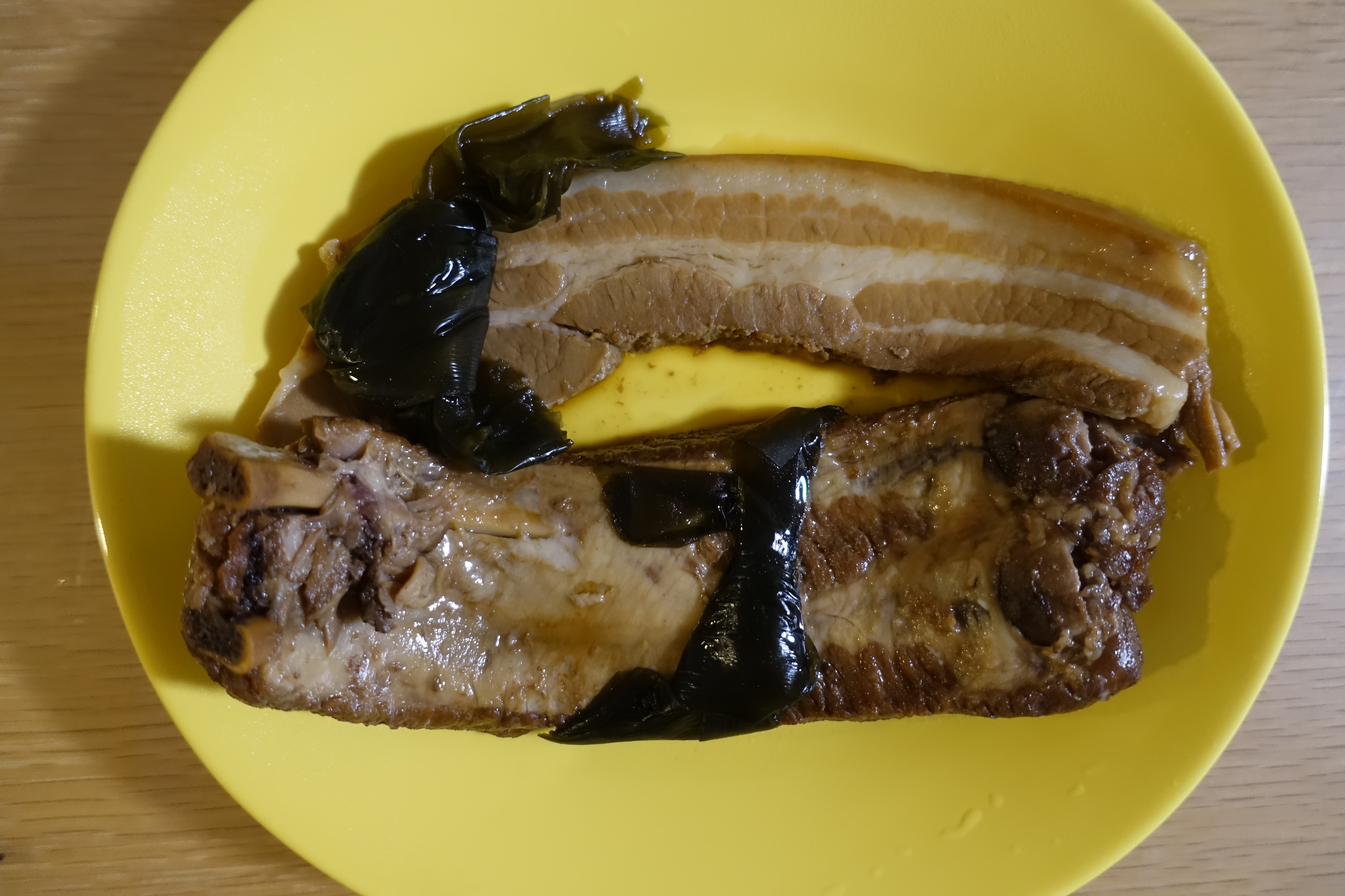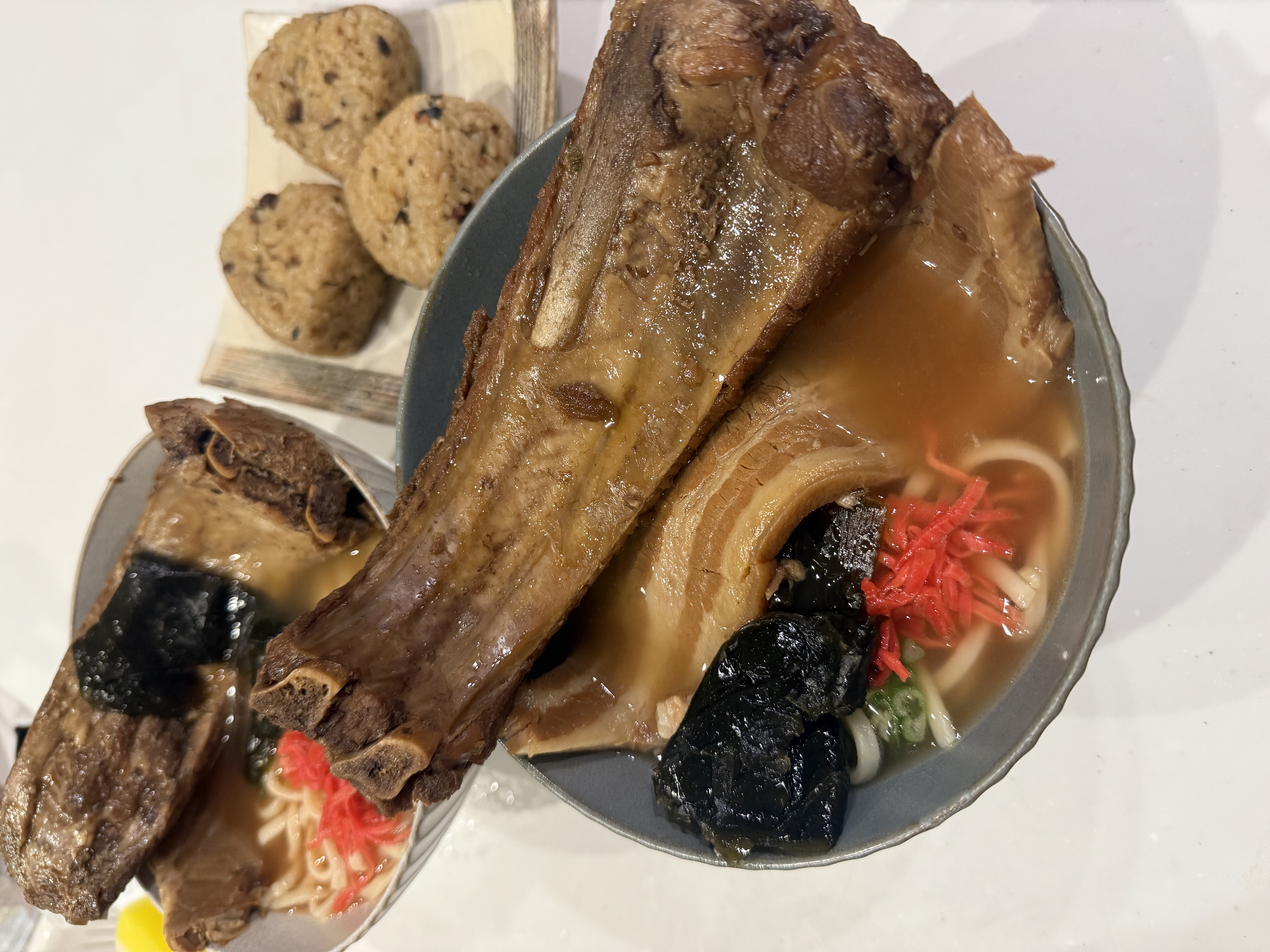 付け合わせには、型崩れをしないように5時間かけて煮込む【三枚肉】と【ソーキ】。味付けには特製の【旨味ダレ】と伊江島産の【沖縄黒糖】を使用し、まろやかでコクのある味わいに仕上げました。トロトロ三枚肉、ドでかソーキには昆布と一緒に【旨味ダレ】をかけて完成です。にしんすにの【沖縄そば】をどうぞ最後までお楽しみください♪