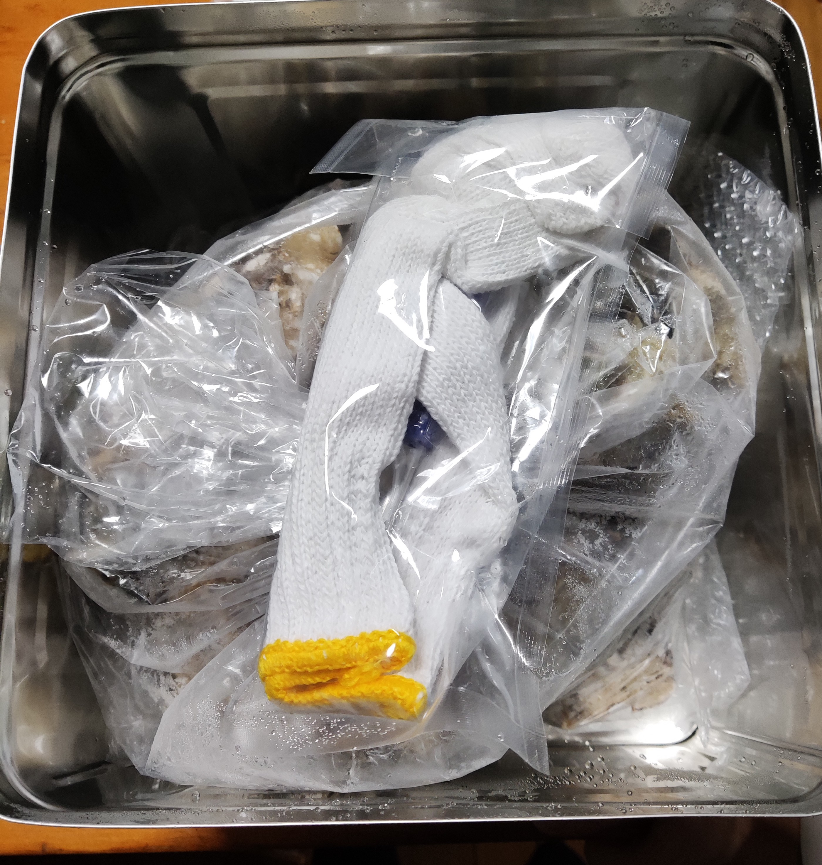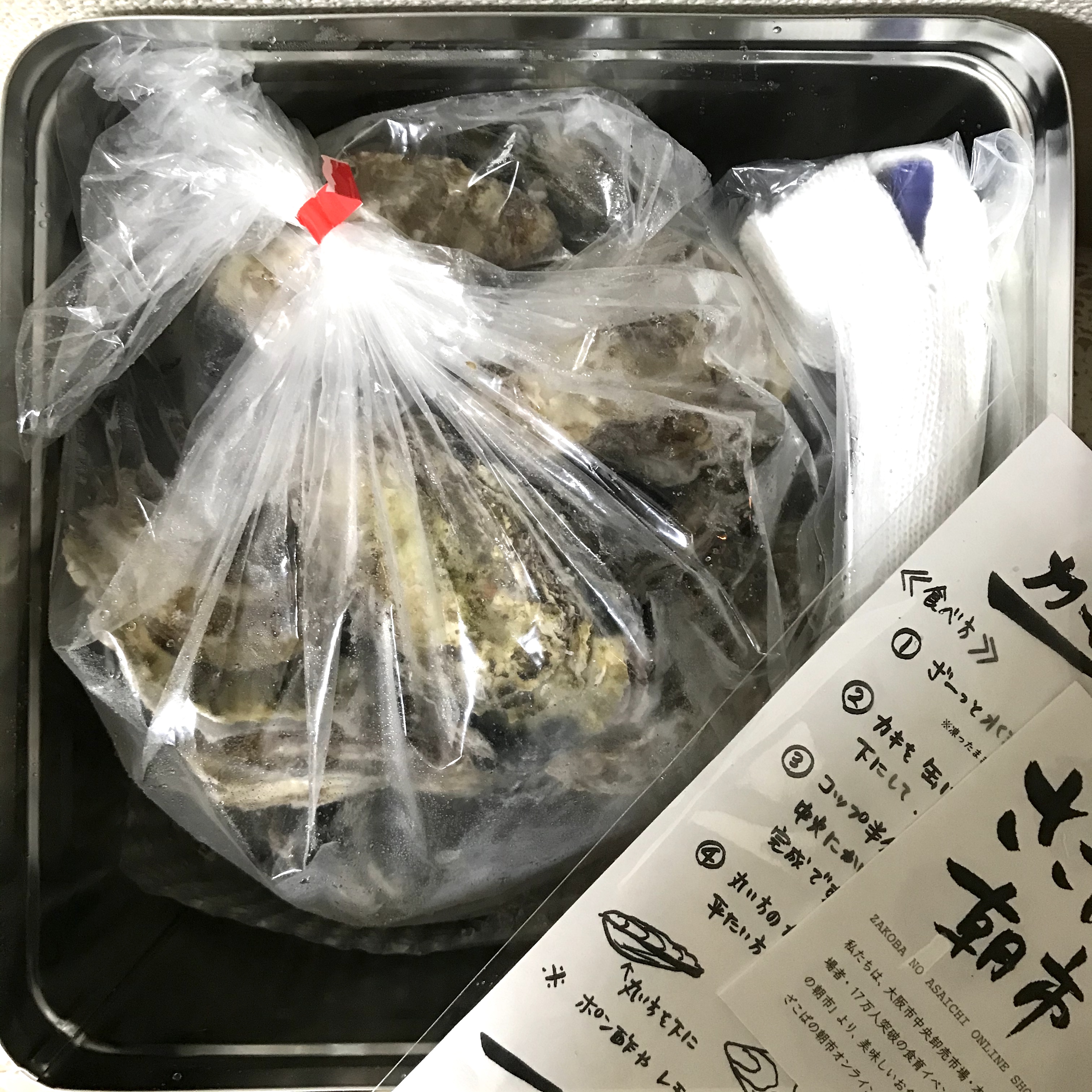 ざーっと水洗いした牡蠣を凍ったまま缶に入れ、コップ半分ほどのお水を入れ蓋をして中火にかけ、約15分後シュシュッと湯気が出てきたら1〜2分で完成!1〜2分蒸らして完成です。
