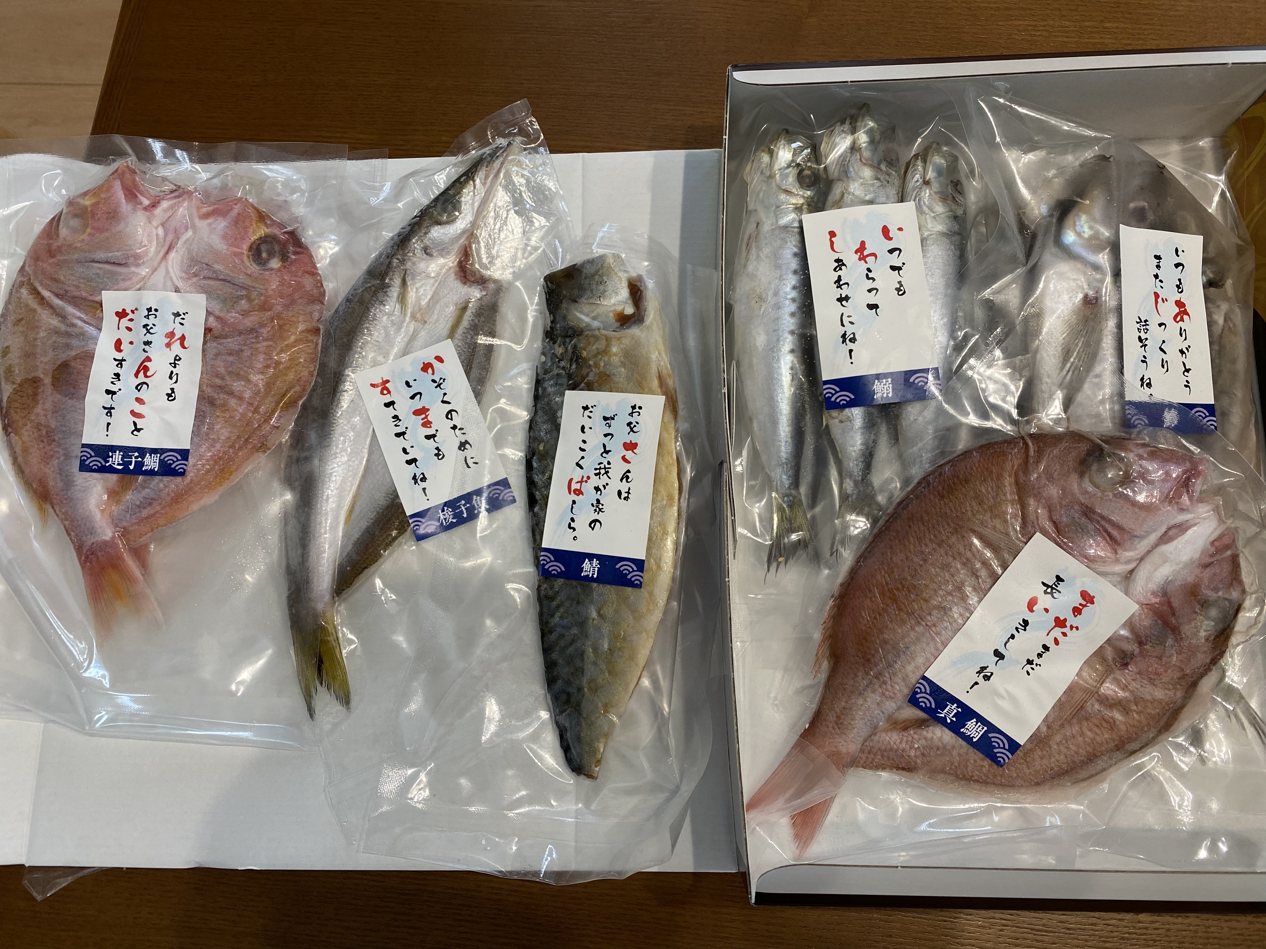 全ての干物に魚の名前を使ったメッセージが書かれていてほっこりしました。お魚好きのお父さんには、ぴったりの贈り物だと思いました!