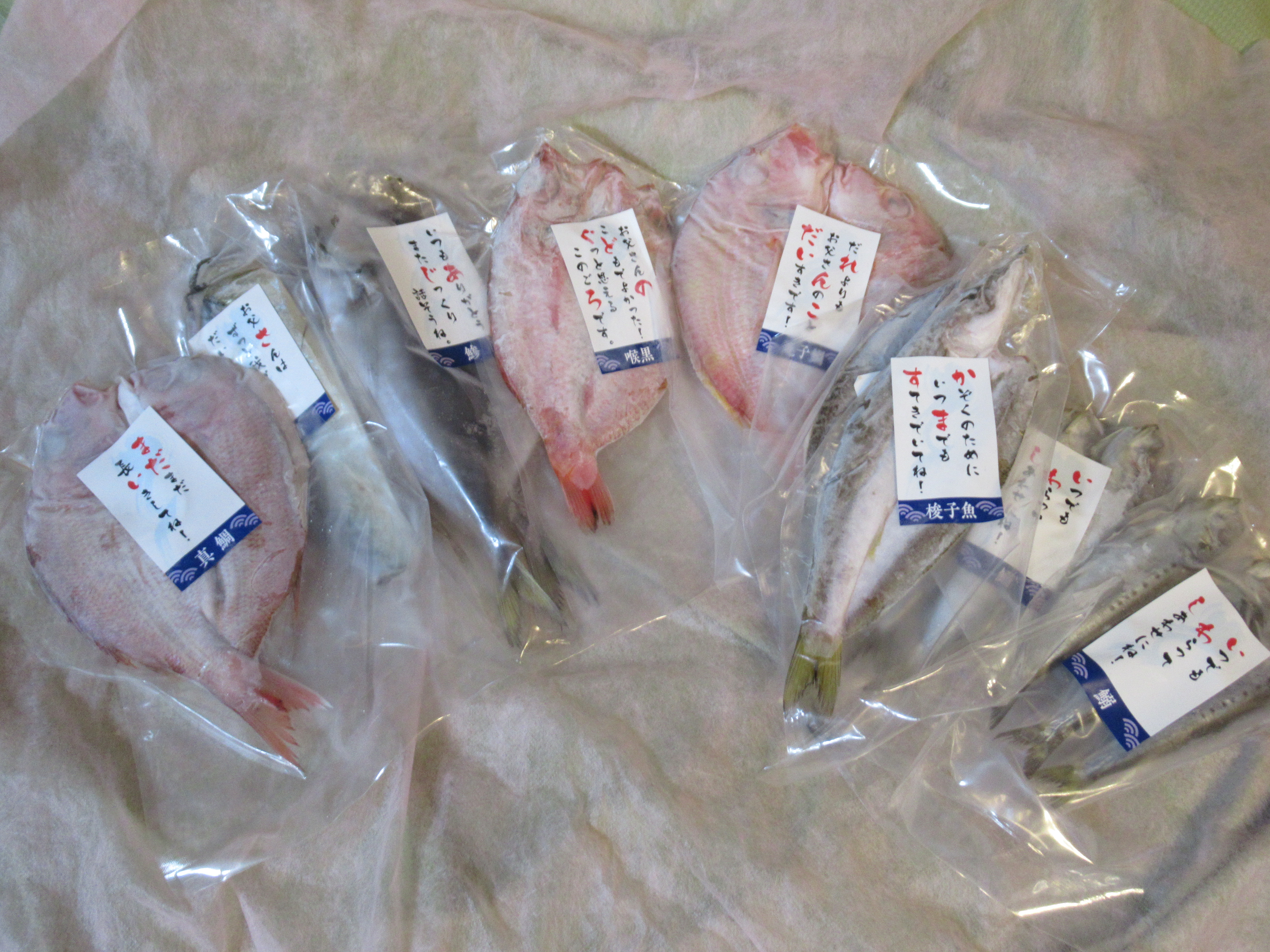 干物7種(真あじ一夜干し(90g)×2、れんこ鯛一夜干し(130g)×1、いわし丸干し(30g)×6、さばみりん干し(80g)×1、真鯛一夜干し(130g)×1、かます一夜干し(70g)×2、のどぐろ一夜干し(80g)×1)計14枚