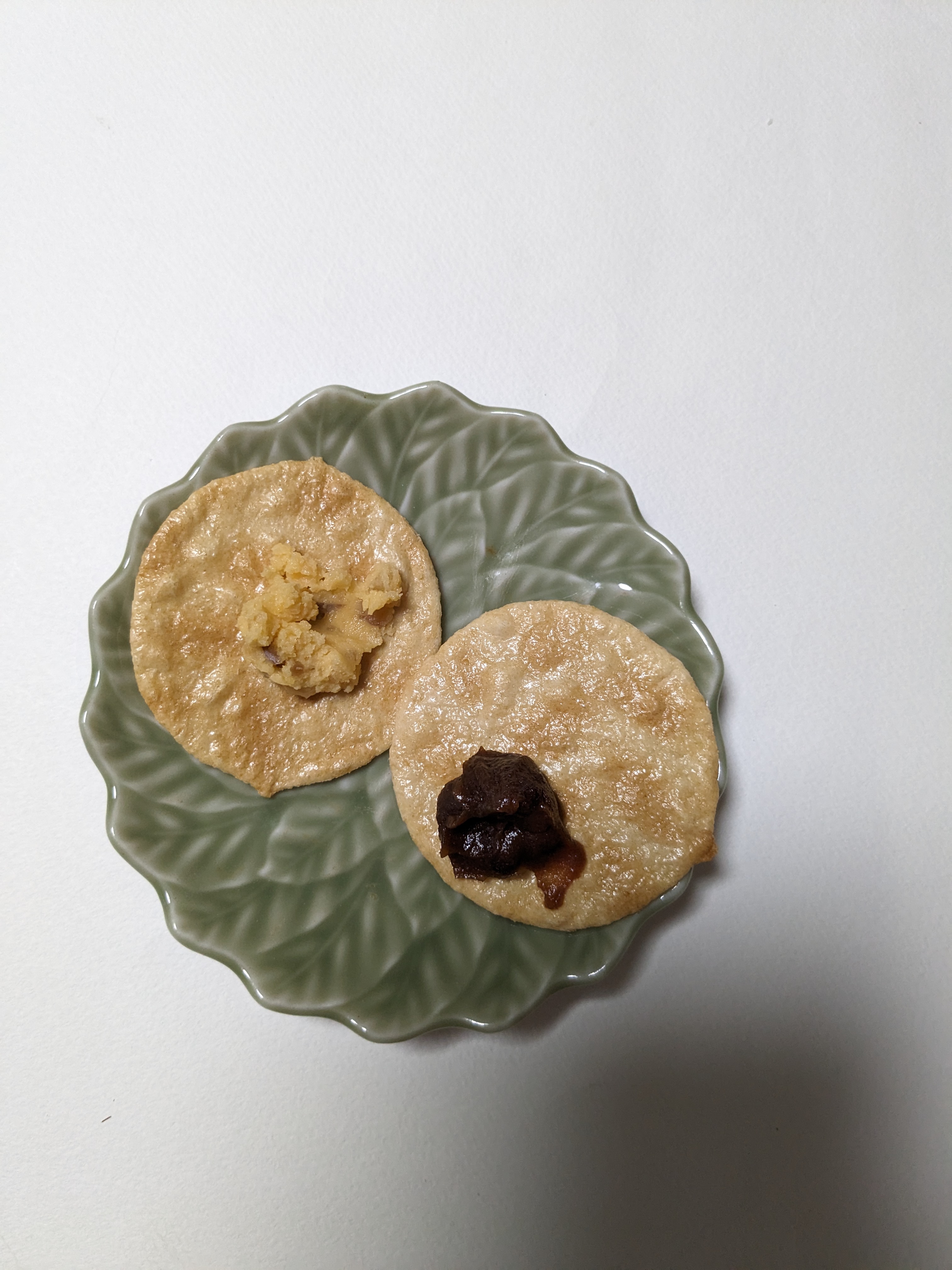 ディップせんべいは、素焼きせんべいをオーブントースターで1分から1分30秒ほど温めていただいてからディップをつけるとさらに美味しくお召し上がりいただけます。