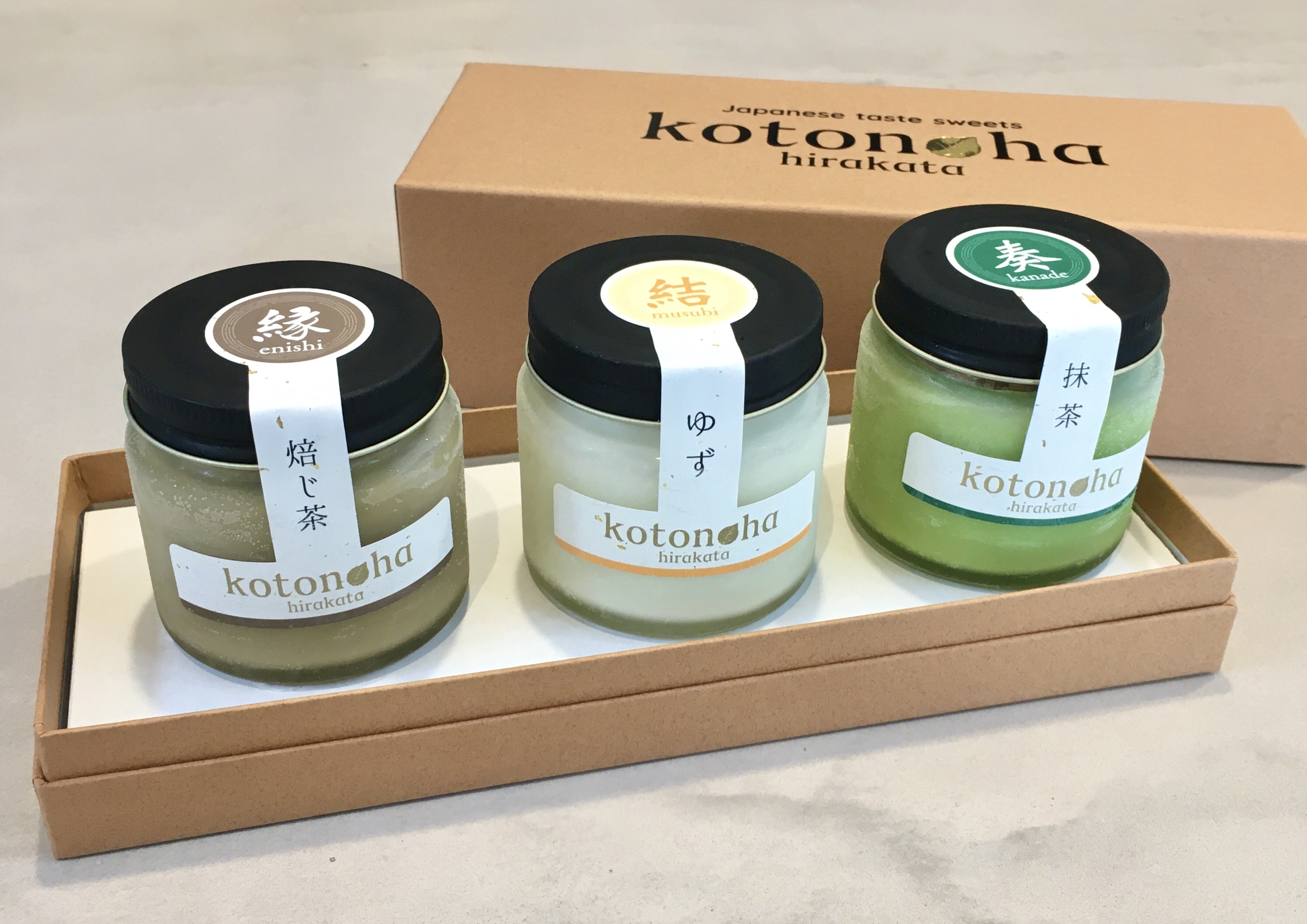 ほうじ茶・柚子・抹茶 3種のお味を詰め合わせました。