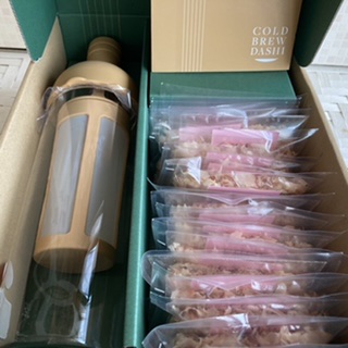 水出し用のボトルも出汁をとる鰹節も昆布もセットになっているので、水を入れて冷蔵庫に置いておくだけ。