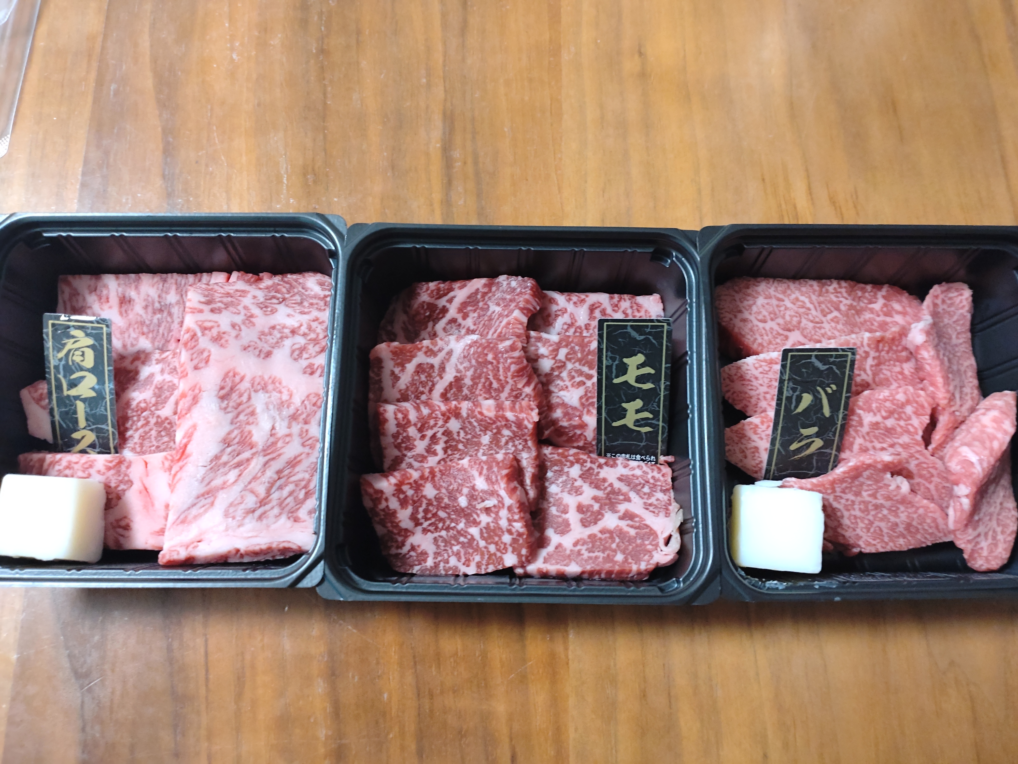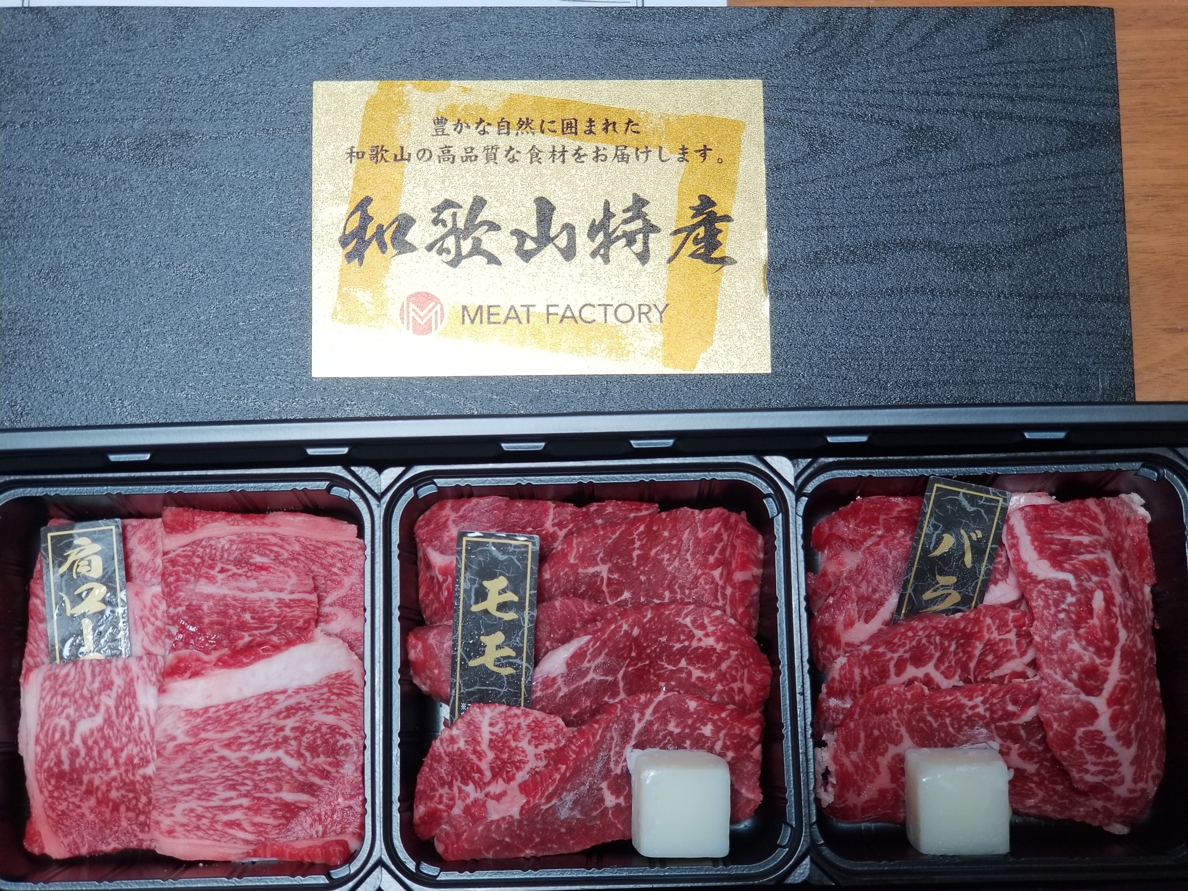 和歌山が誇るブランド和牛”熊野牛”の[肩ロース・モモ・バラ]が各80gずつ入っている、贅沢な食べ比べセットです♪