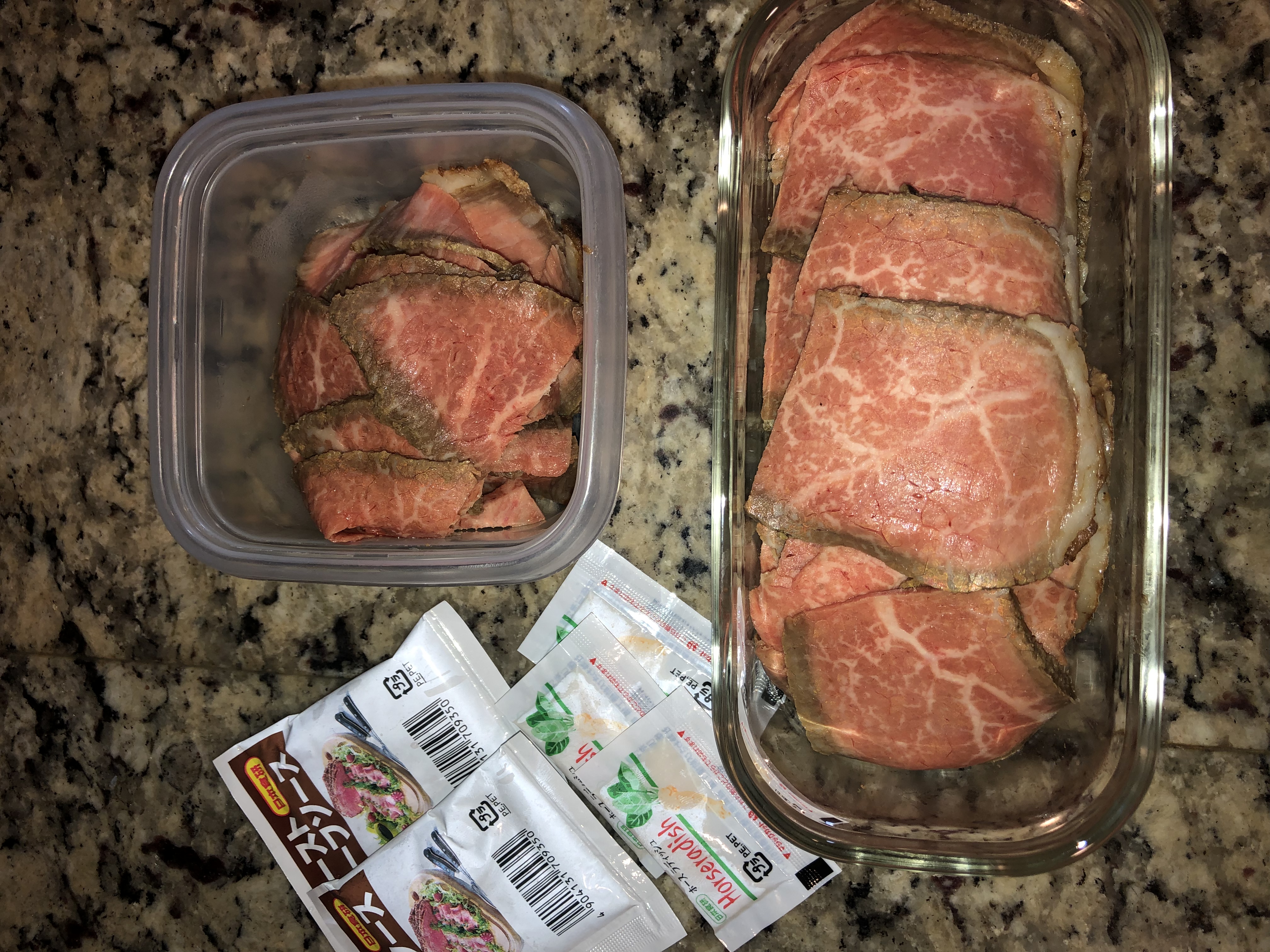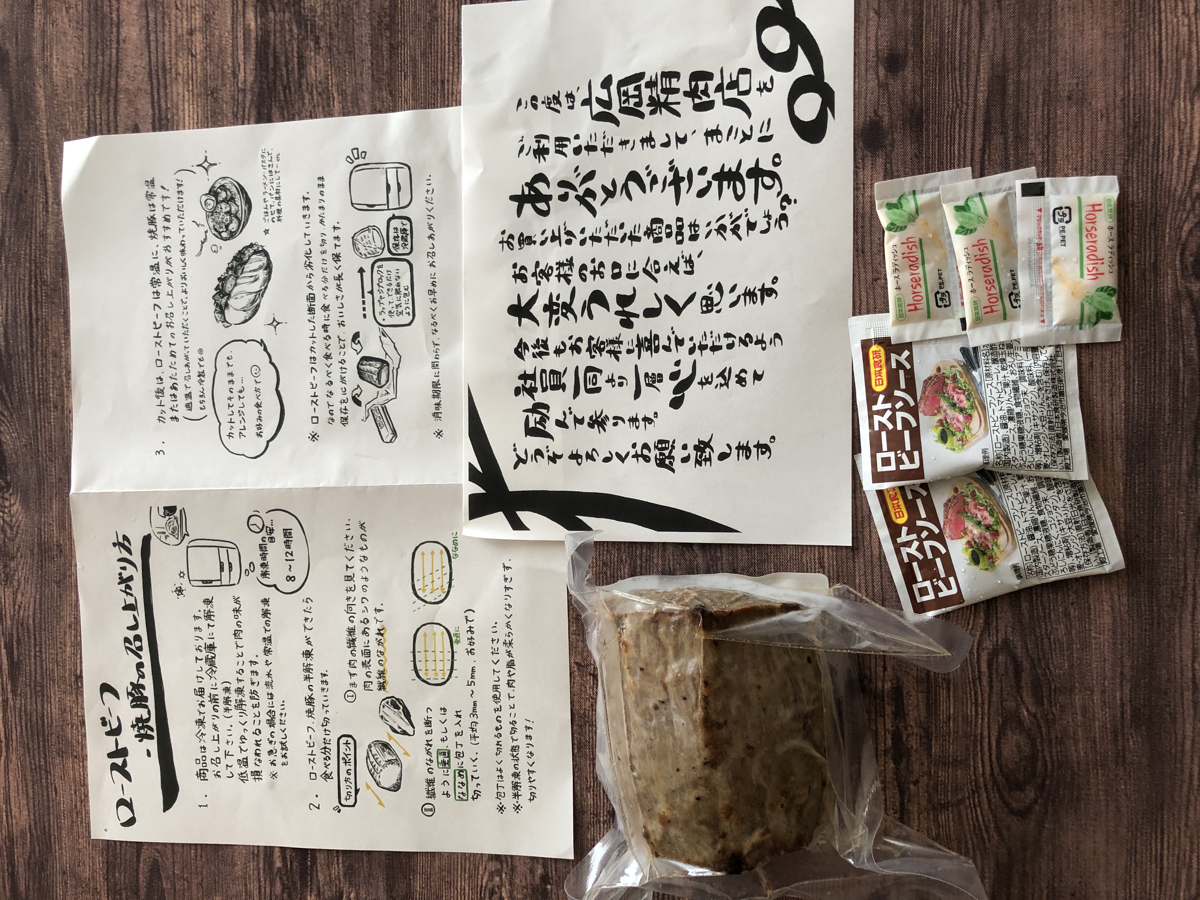 箱の中には、冷凍されたローストビーフ、ソース2袋とホースラディッシュ3袋(1袋多く入っていました。)。