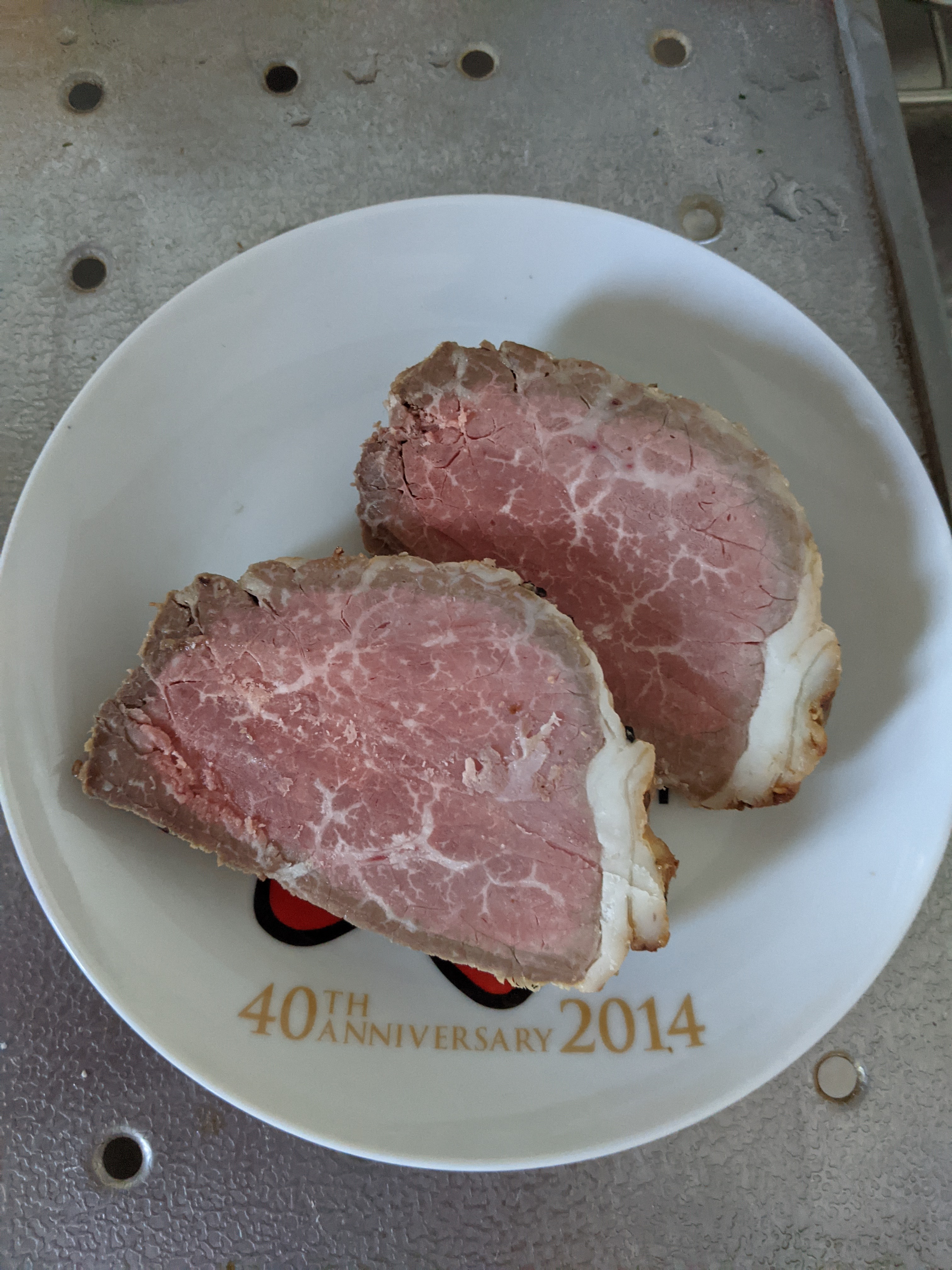 口の中で蕩ける感じのローストビーフがお好きな方には物足りないかもしれませんが、赤身が好きな方や油分を控えている方には超絶美味しいローストビーフだと思います。