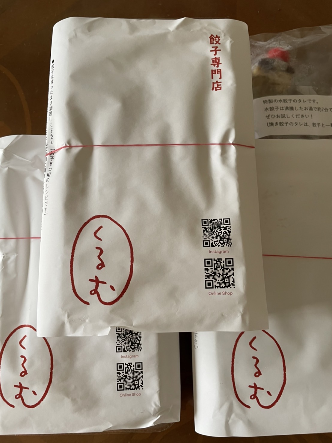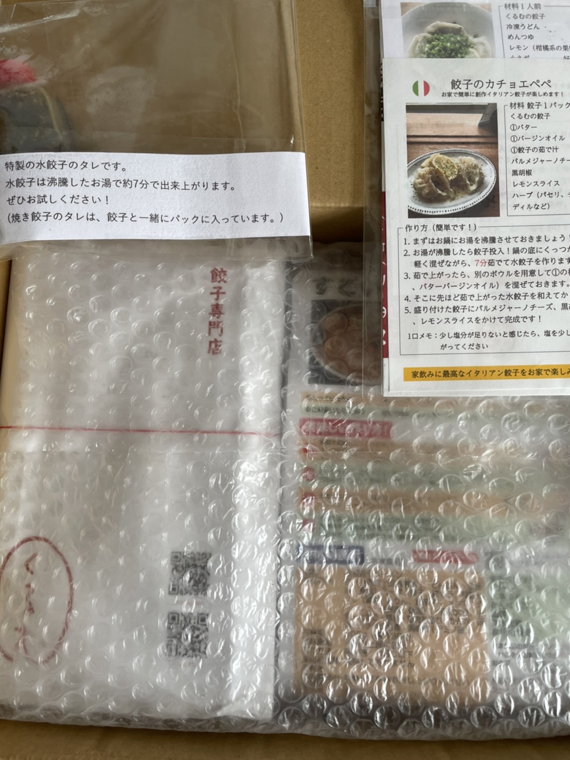 商品と一緒にオンラインショップ等のQRコードが記載された紙と、餃子のアレンジレシピが入っています。